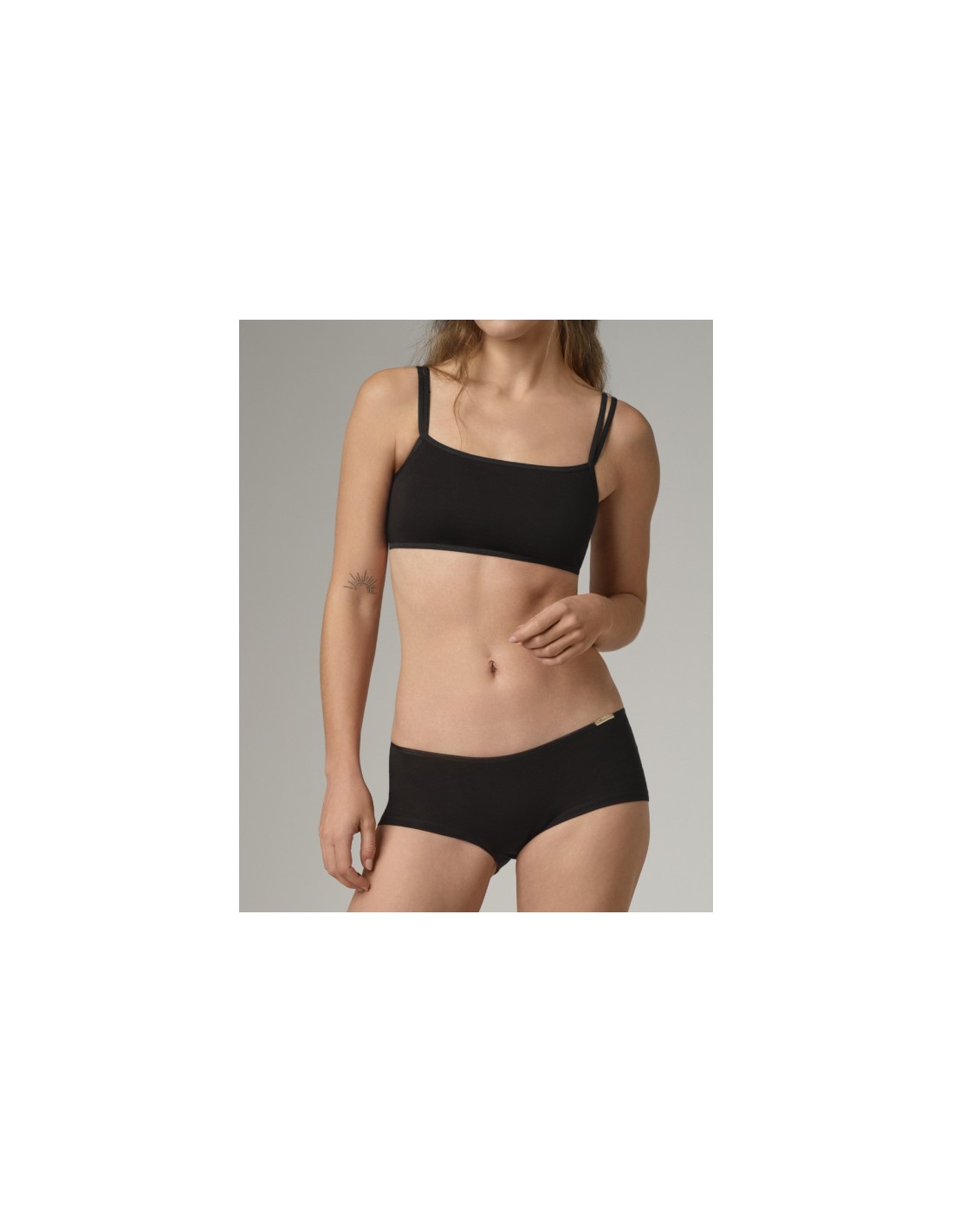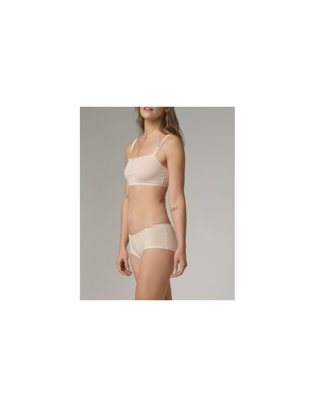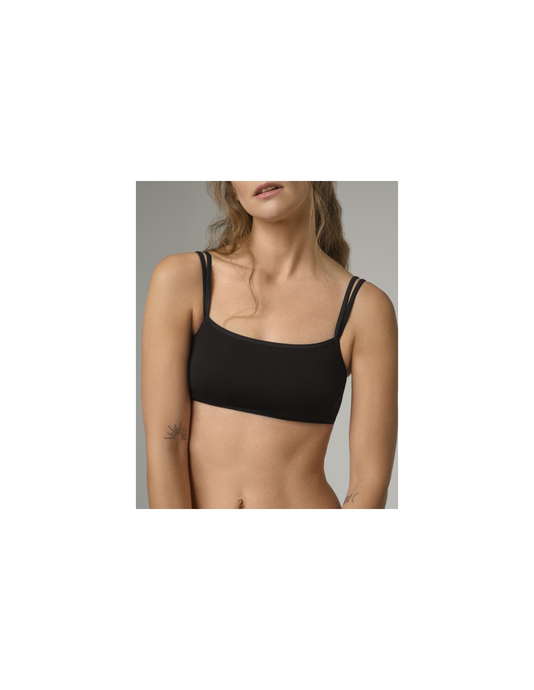 Morbidissimo e leggero reggiseno minimal a Top in cotone biologico Gots e Fairtrade, naturale, traspirante e totalmente anallergico, senza coppe, senza ganci e senza ferretto.