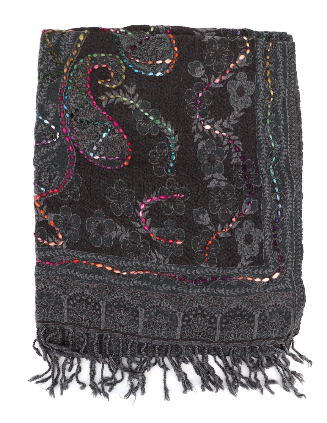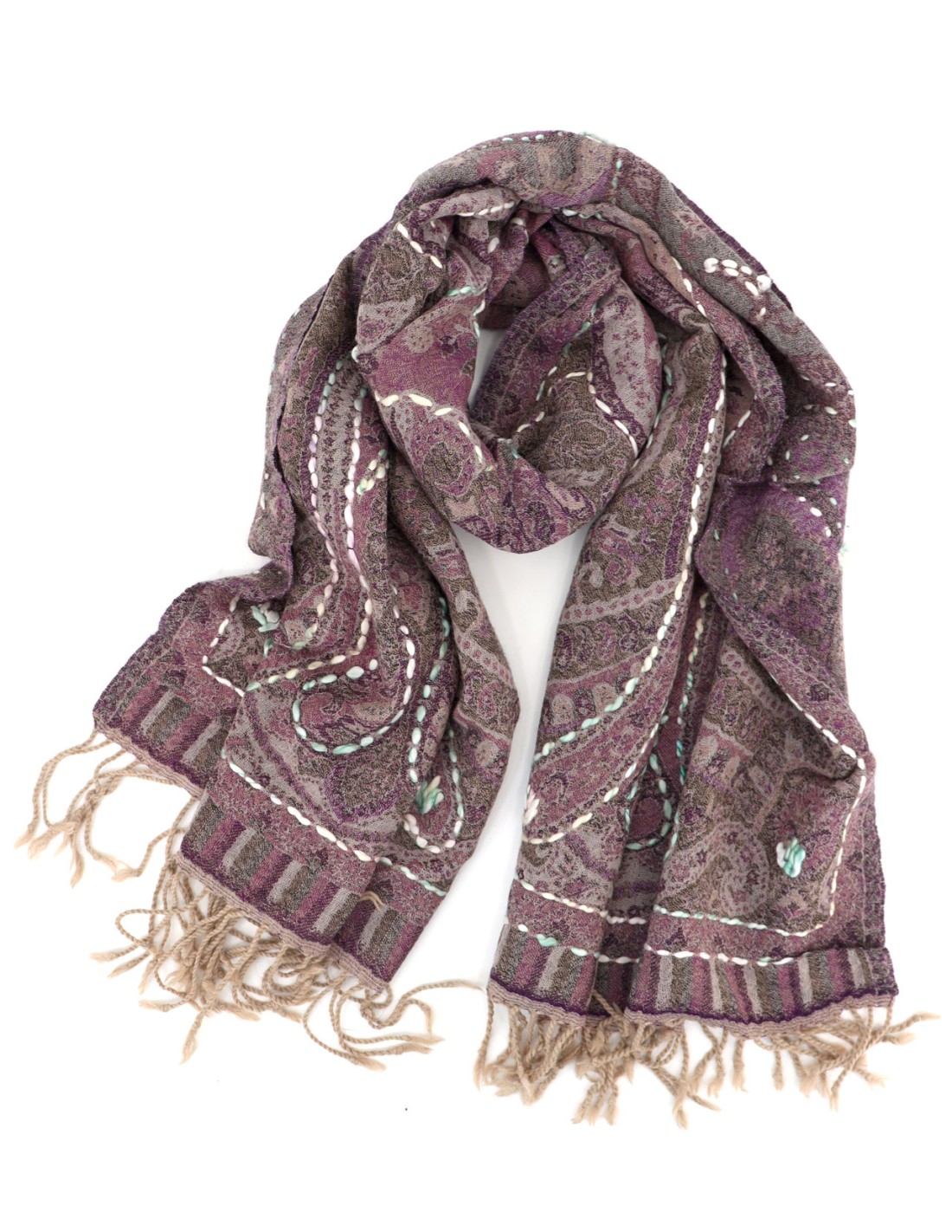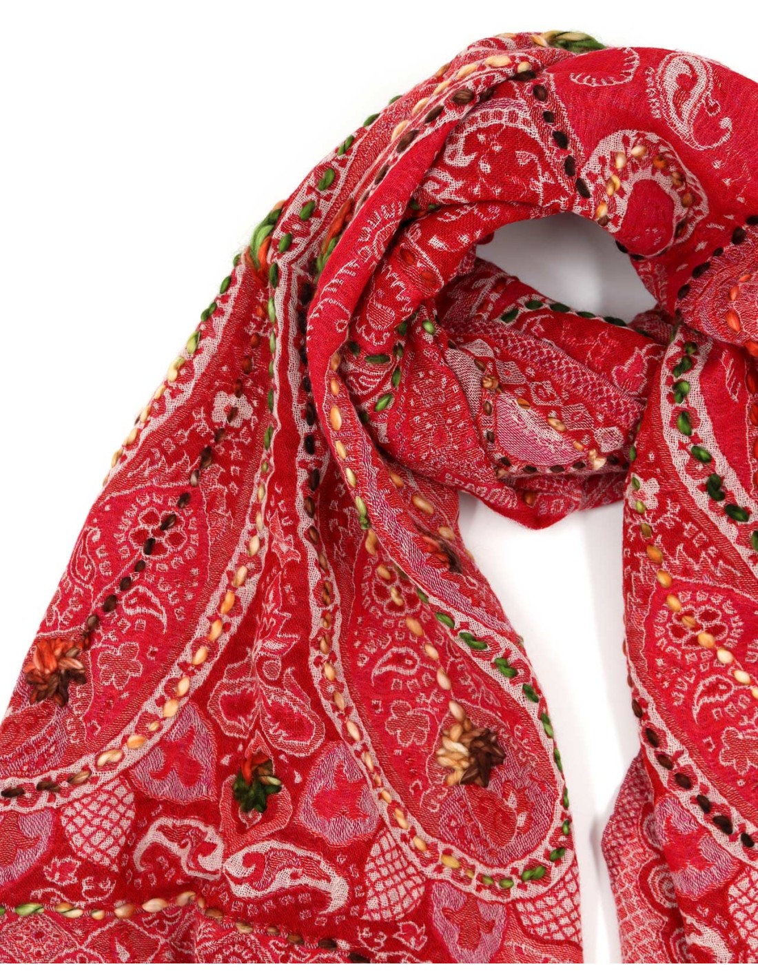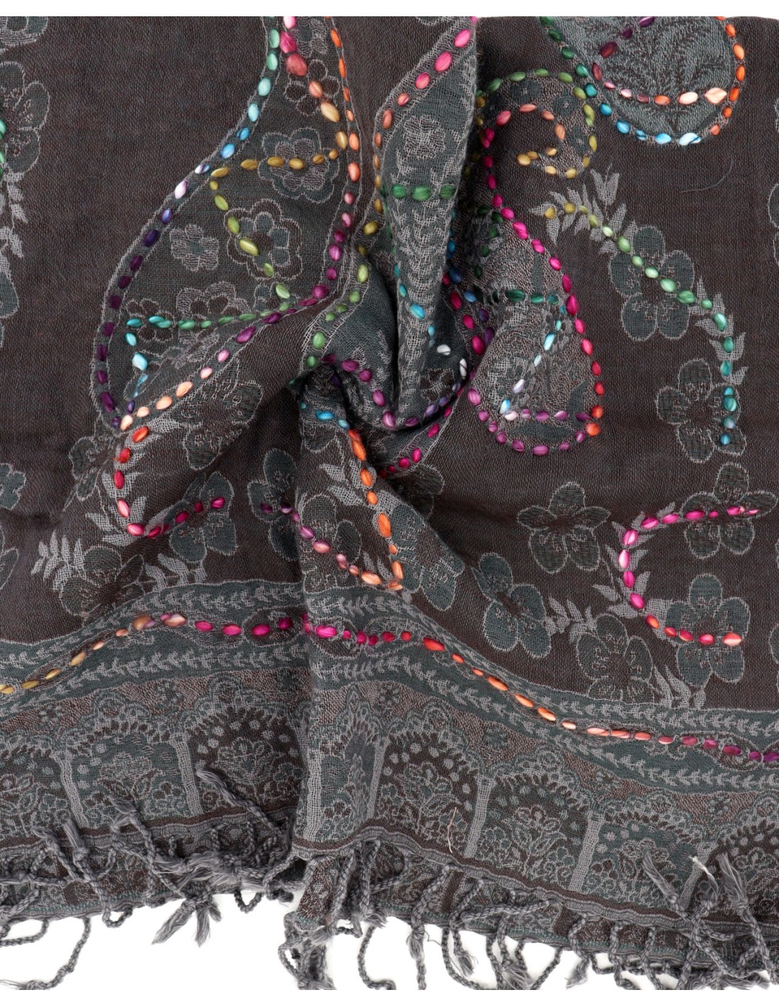 Modello con lavorazione jaquard e dettagli ricamati a mano in lana grossa. Tessuta a telaio ha una trama sottile ma corposa, leggera addosso come un foulard ma calda come una sciarpa. Bellissima da indossare per arricchire i tuoi look e perfetta da regalare.