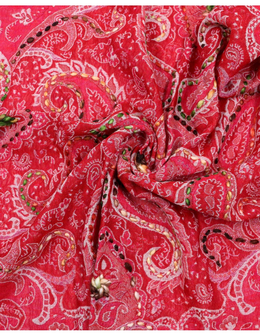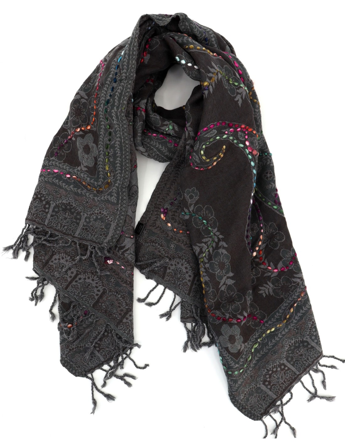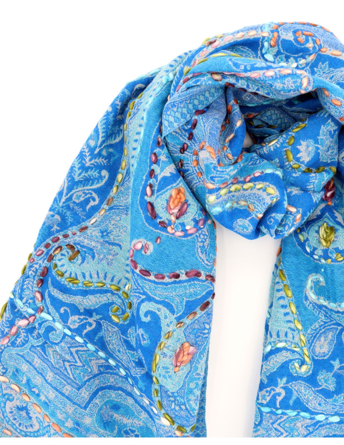 Modello con lavorazione jaquard e dettagli ricamati a mano in lana grossa. Tessuta a telaio ha una trama sottile ma corposa, leggera addosso come un foulard ma calda come una sciarpa. Bellissima da indossare per arricchire i tuoi look e perfetta da regalare.
