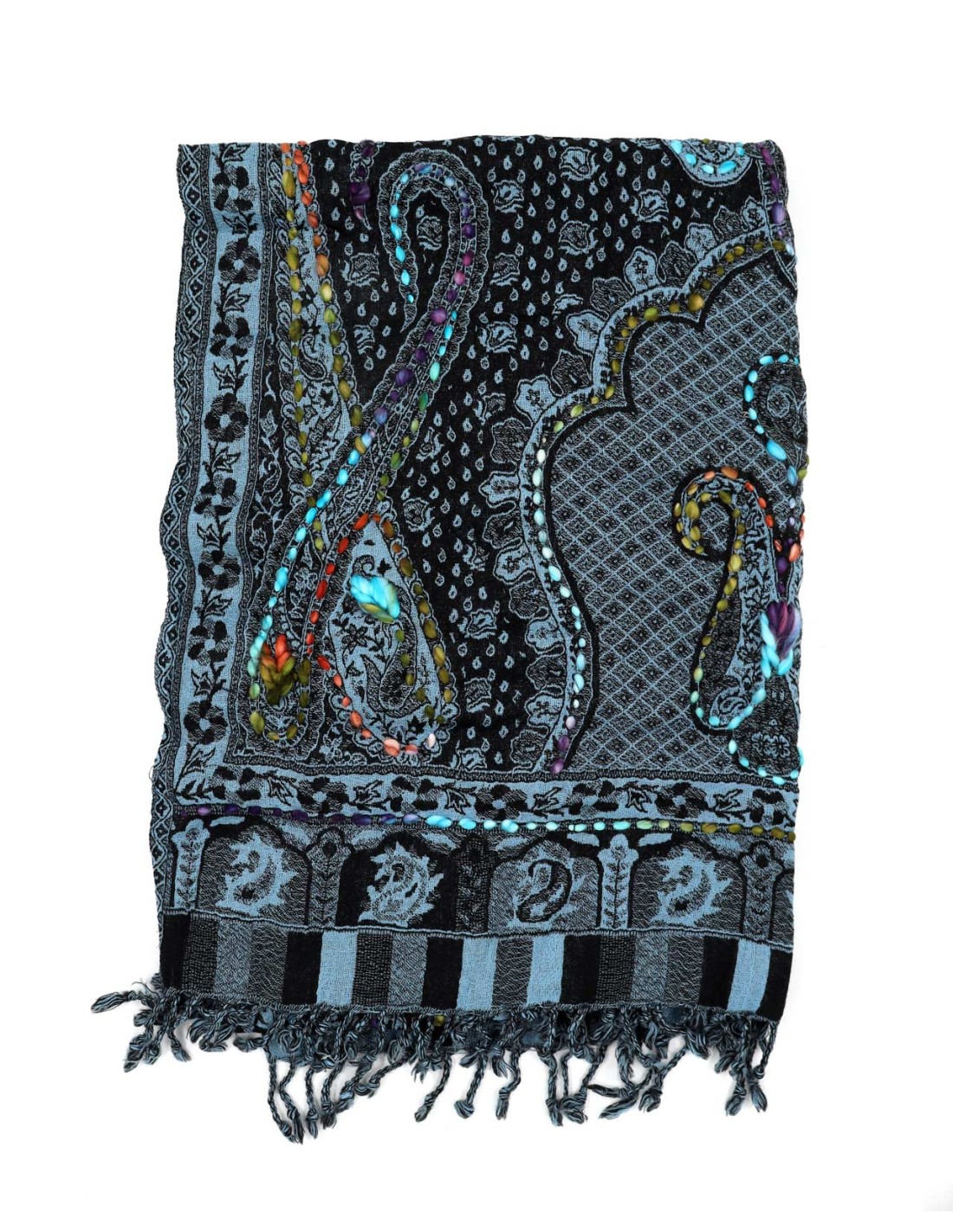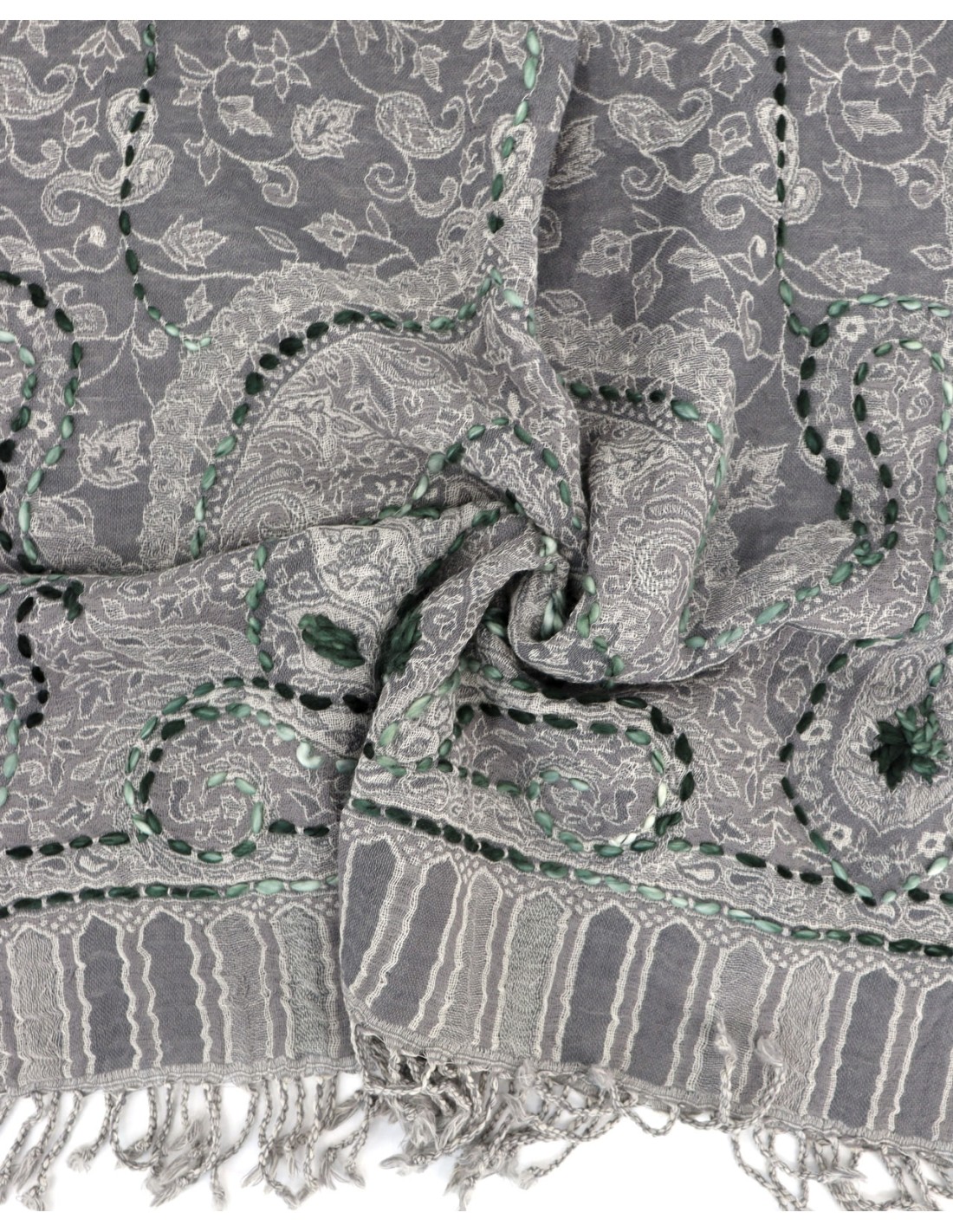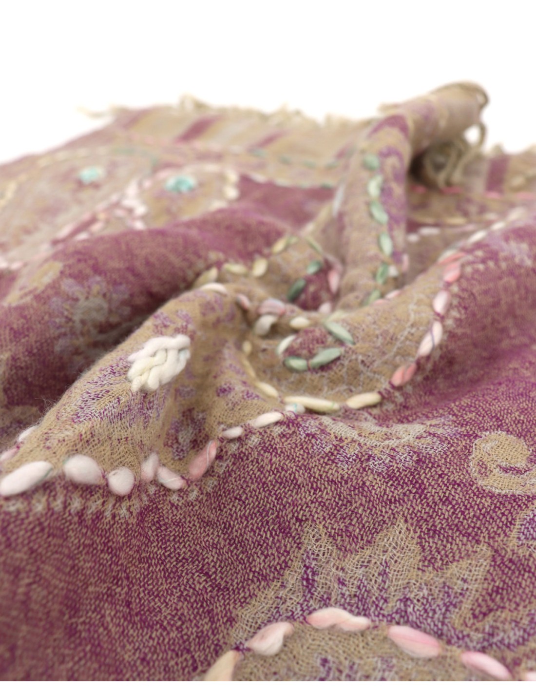 Stola in 100% Lana Merino tessuta a telaio manuale finemente ricamata a mano con inserti in lana grossa.