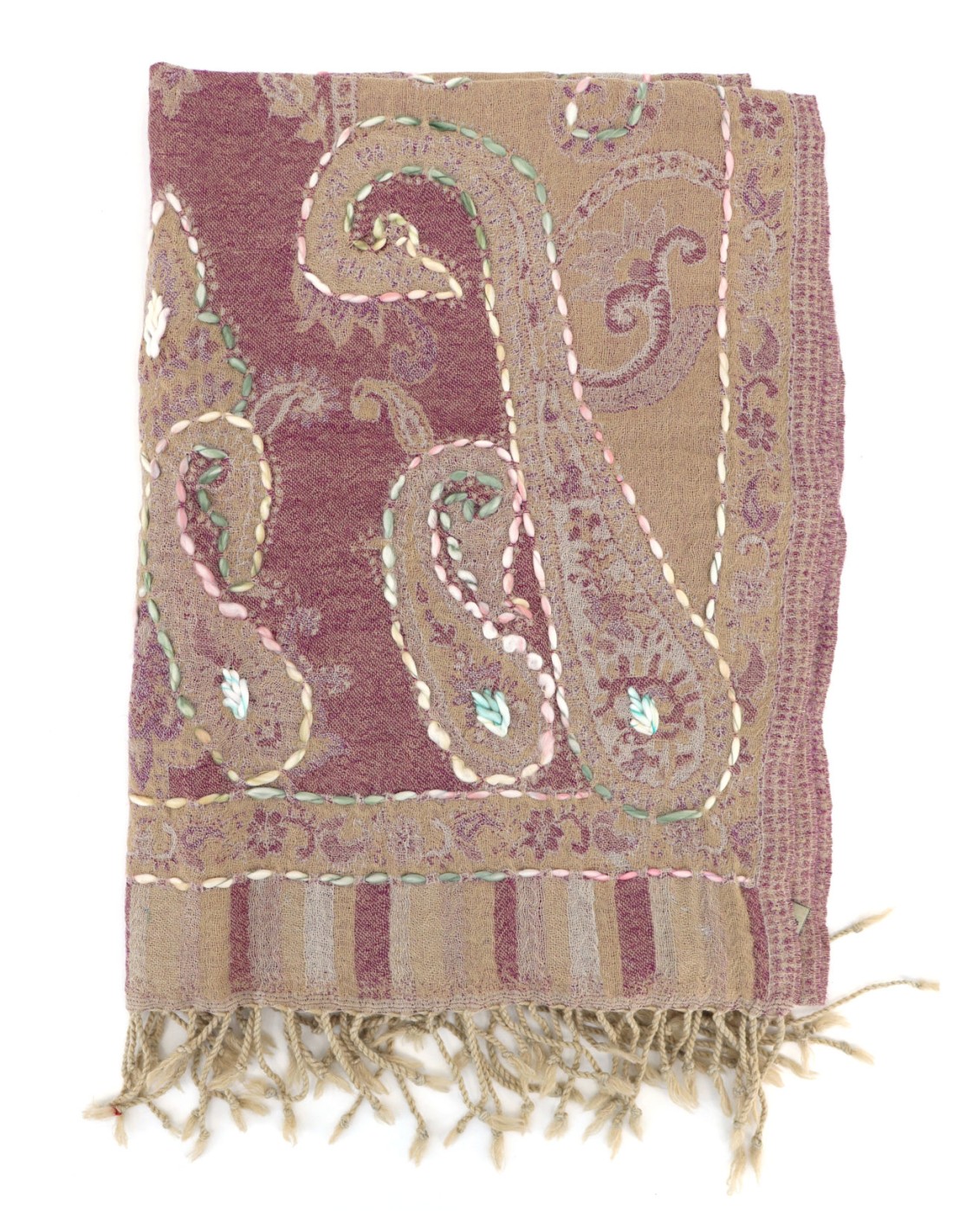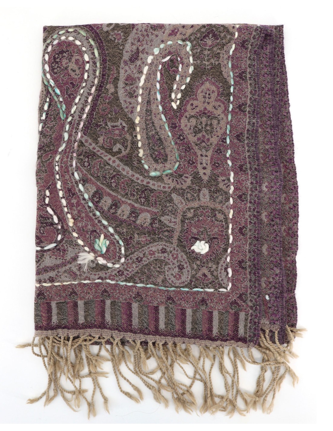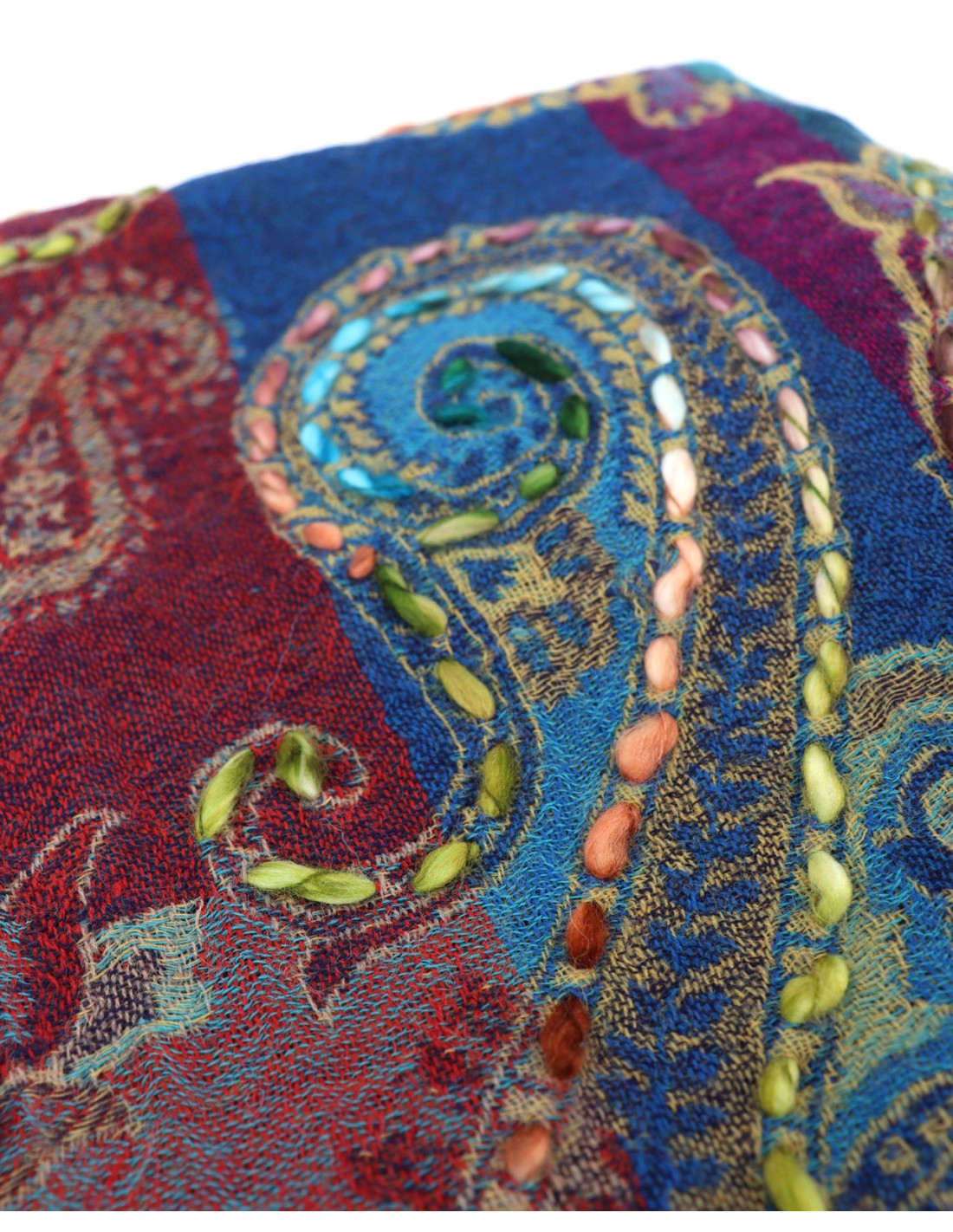 Stola in 100% Lana Merino tessuta a telaio manuale finemente ricamata a mano con inserti in lana grossa.