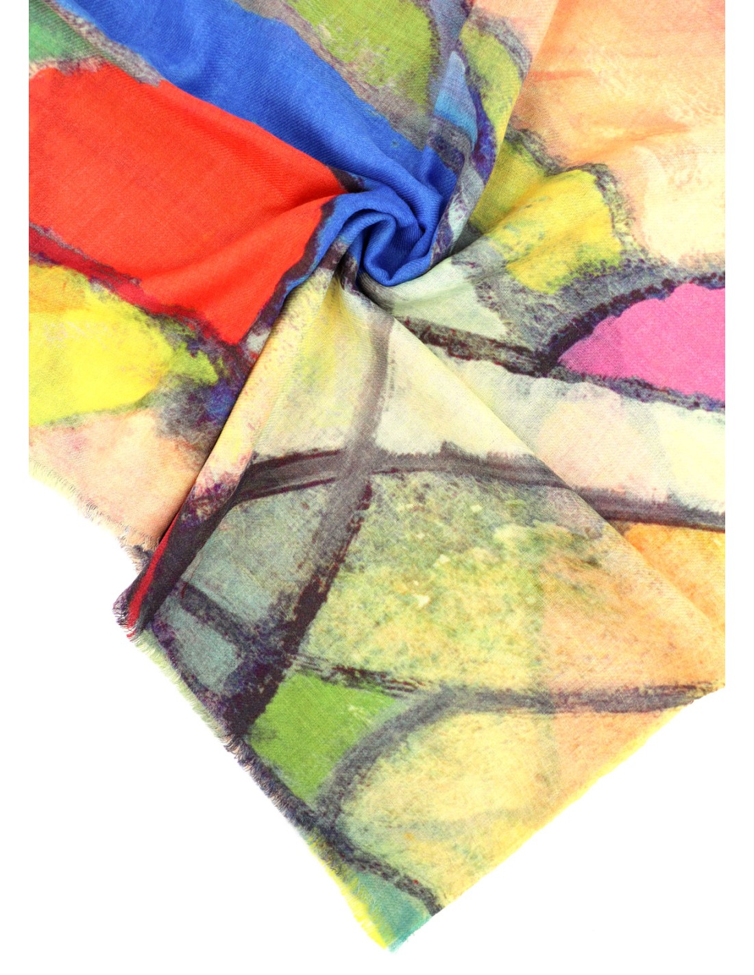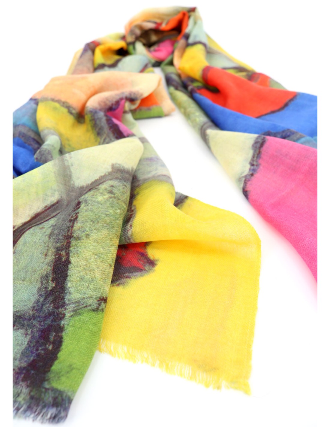Stola in 100% lana extrafine con stampa digitale coloratissima, ampia e leggerissima. Morbida, naturale e sorprendentemente calda, realizzata a telaio manuale in India secondo principi di commercio equo e solidale. Un accessorio vivace e una splendida idea regalo. Dimensioni 110*180 cm