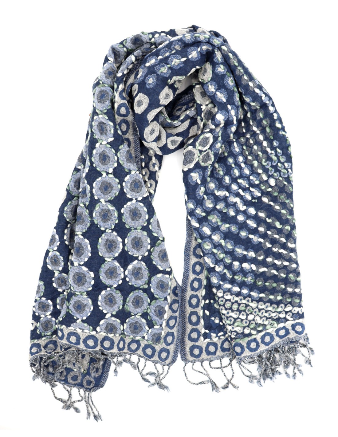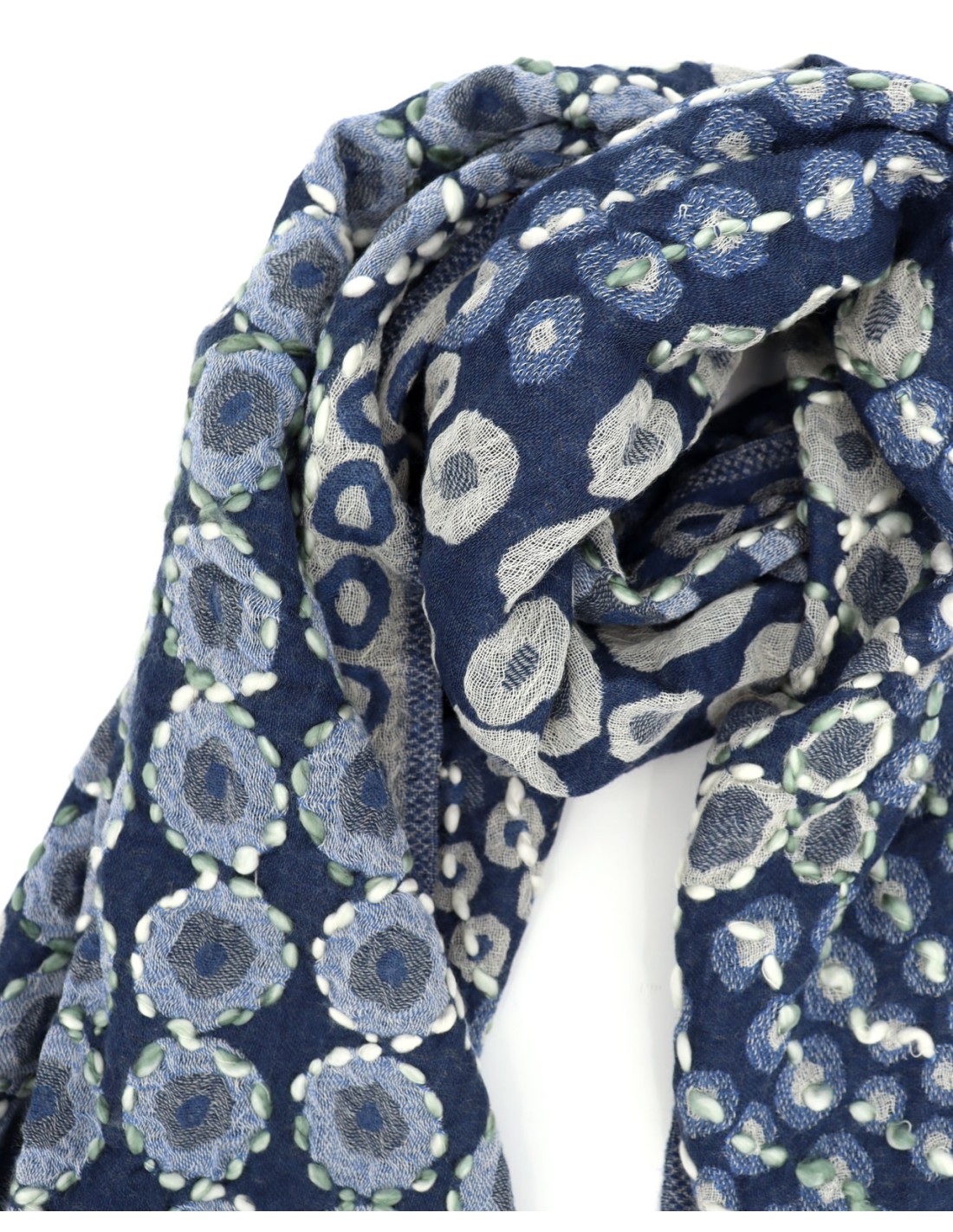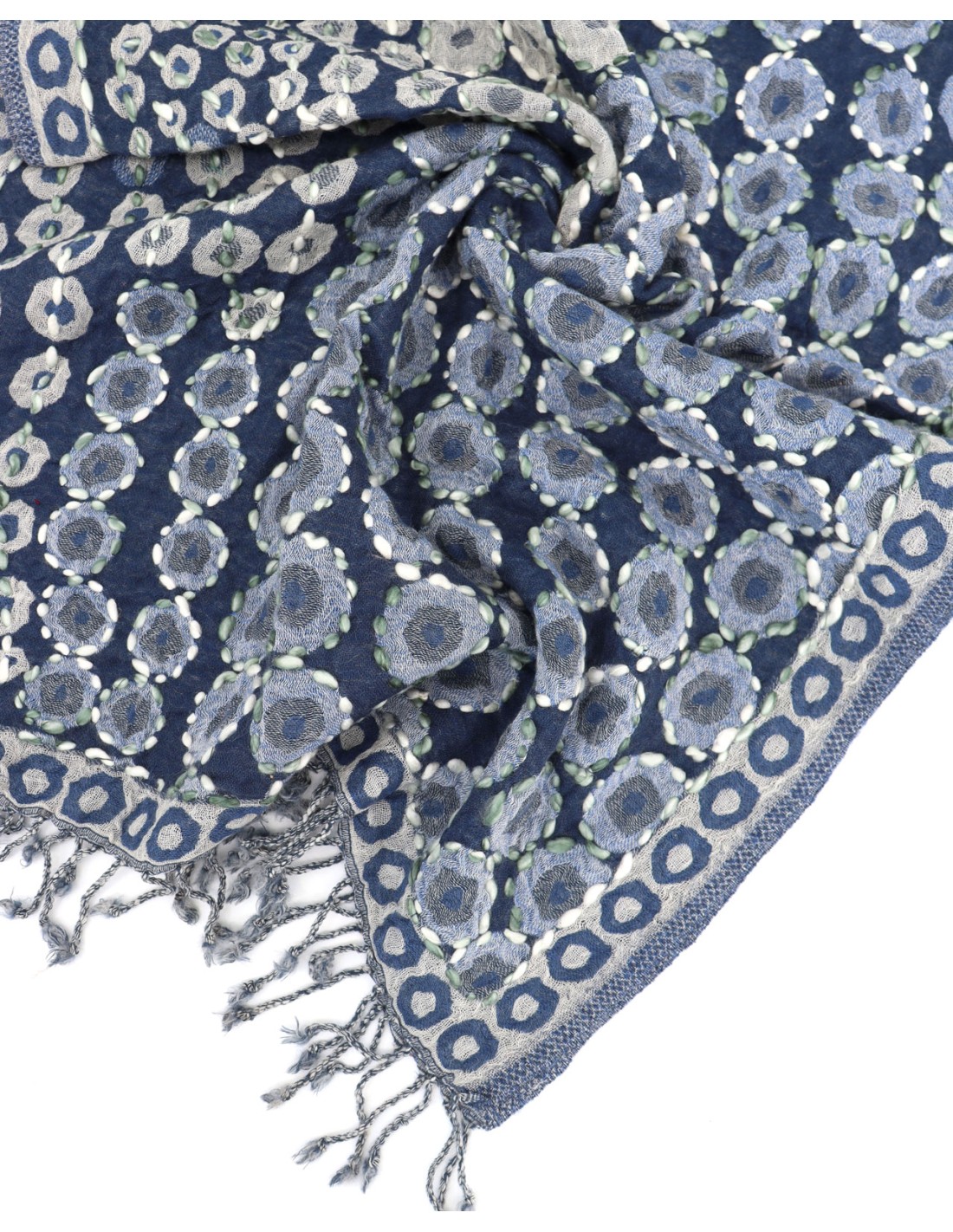 Modello con lavorazione jaquard e dettagli ricamati a mano in lana grossa. Tessuta a telaio ha una trama sottile ma corposa, leggera addosso come un foulard ma calda come una sciarpa. Bellissima da indossare per arricchire i tuoi look e perfetta da regalare.
