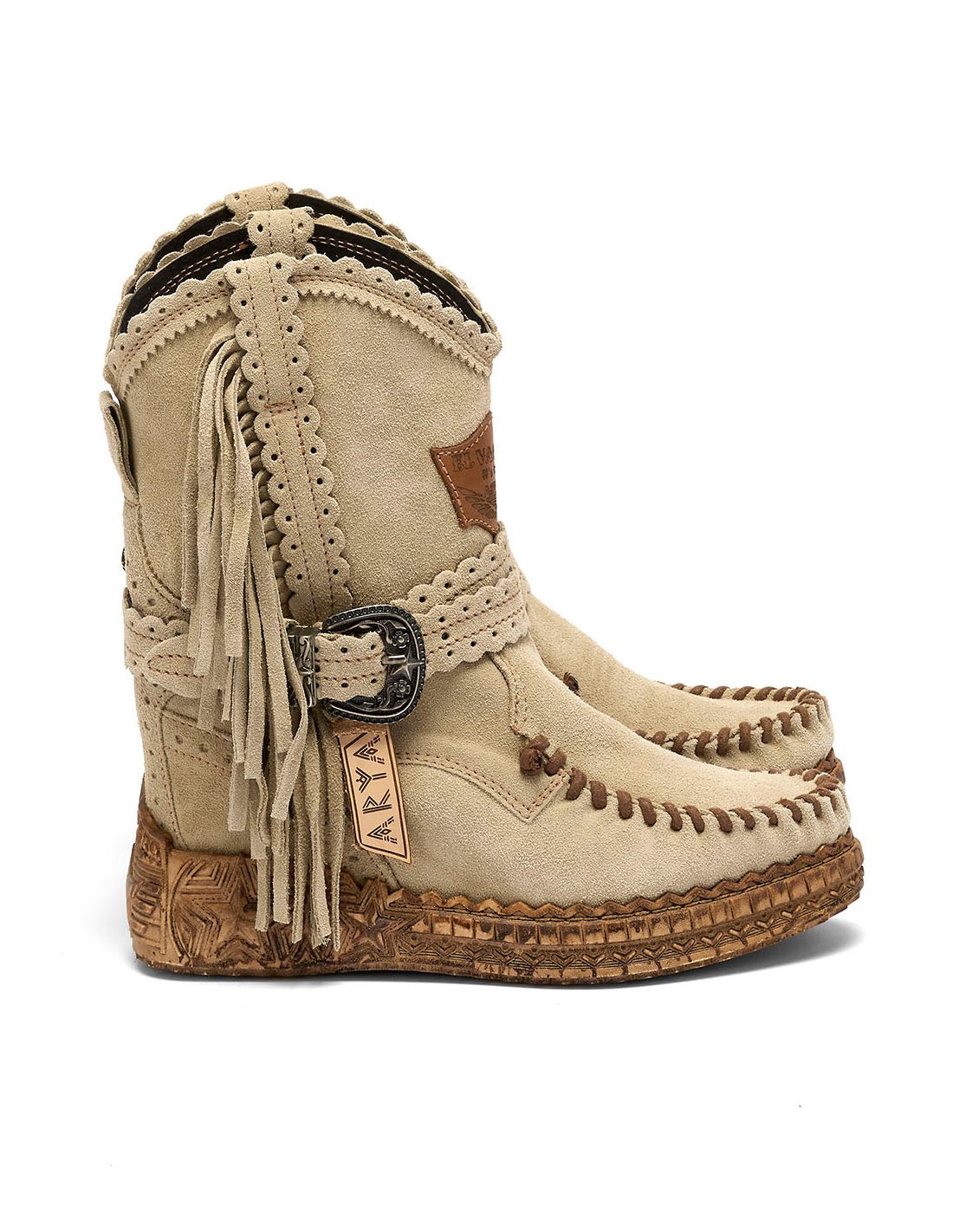 Stivale artigianale basso con zeppa interna, in morbida pelle scamosciata di vitello con frange laterali e finitura vintage. Realizzato a mano in Italia, dallo stile western e spirito libero. Autentico, comodo e senza tempo: uno stivale che racconta libertà, stile e qualità destinata a durare.