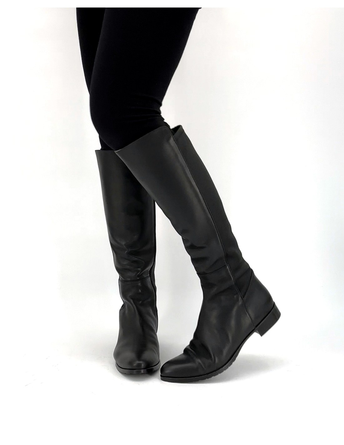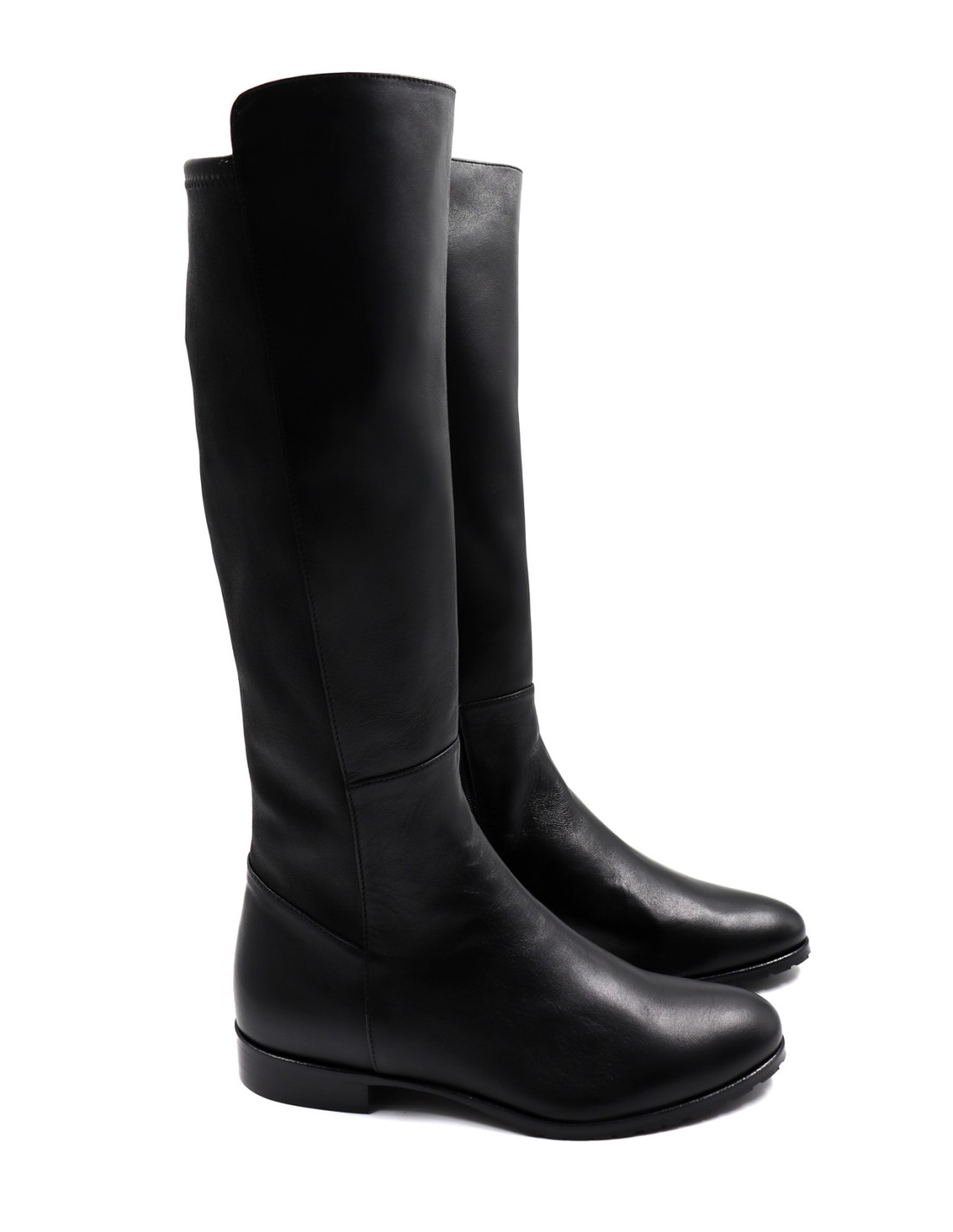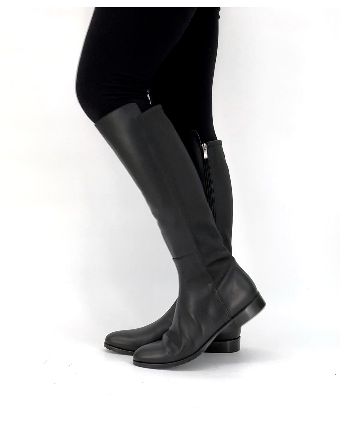 La linea è pulita e femminile, con punta affusolata e design essenziale che slancia la gamba. Il fronte dello stivale è doppio, con pelle esterna e fodera in pelle per dare struttura, mentre il retro è in nappa stretch per adattarsi a qualsiasi polpaccio, anche il più tornito. Lo avvolge senza stringere, seguendo naturalmente la forma della gamba.
