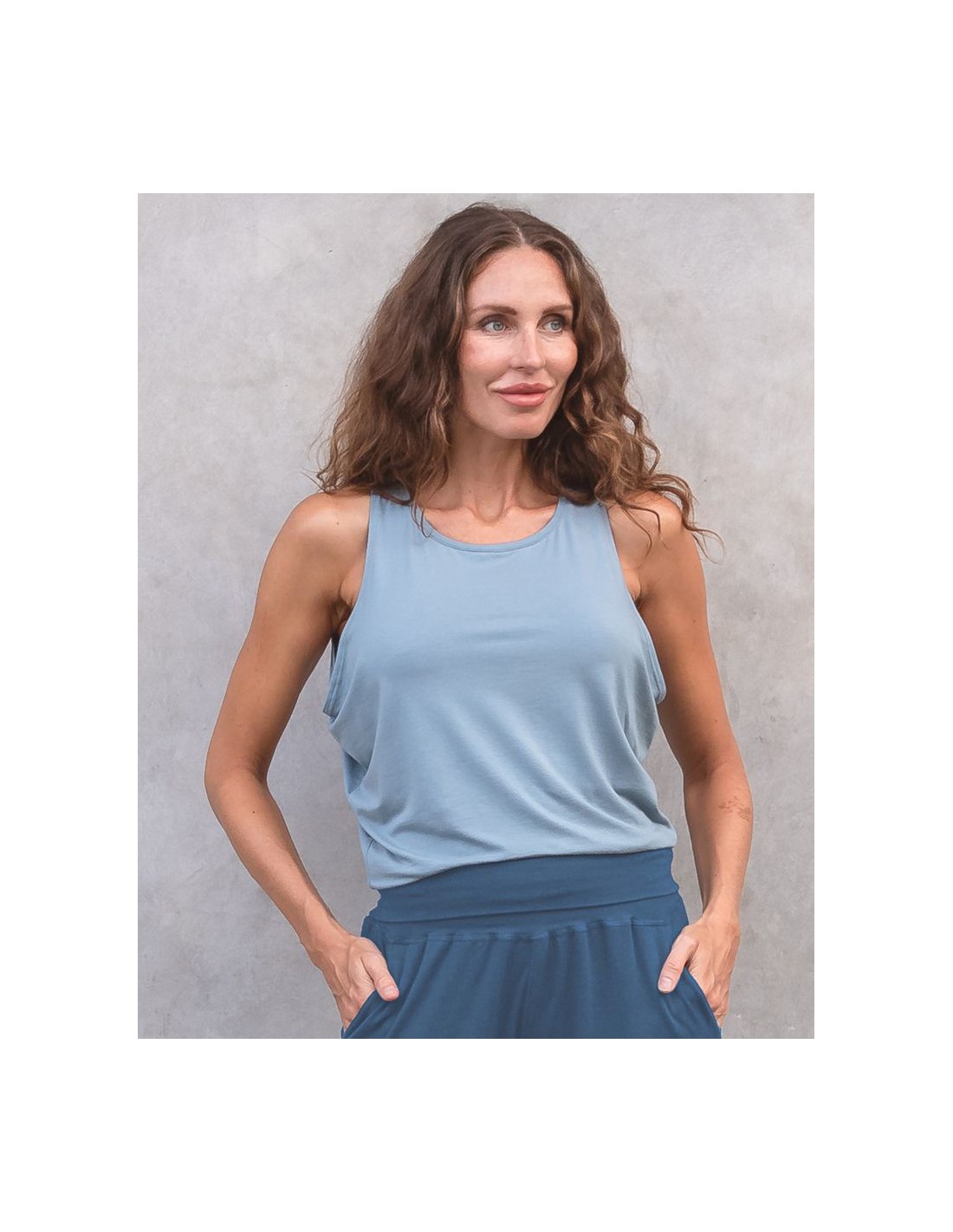 Top smanicato ampio e squadrato in Lyocell e cotone biologico, freschissimo e morbidissimo sulla pelle. Fluido, leggero e traspirante, accompagna il movimento senza segnare. Perfetto per sport, yoga e tempo libero. Naturale e sostenibile, pensato per farti sentire libera e a tuo agio.