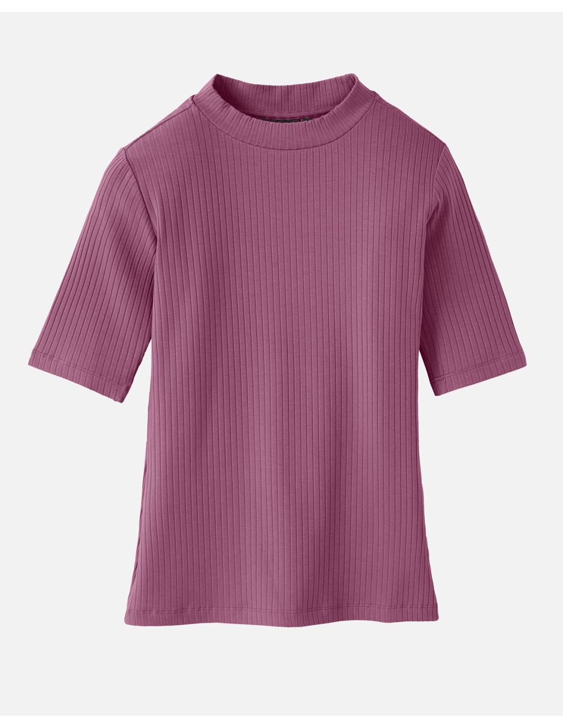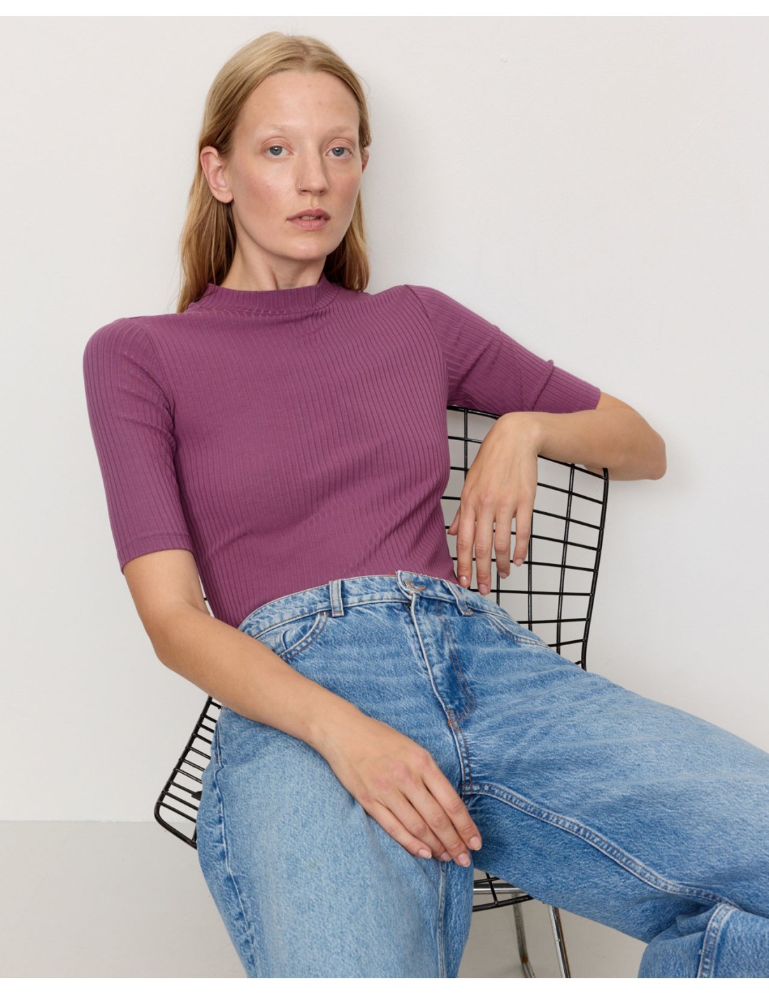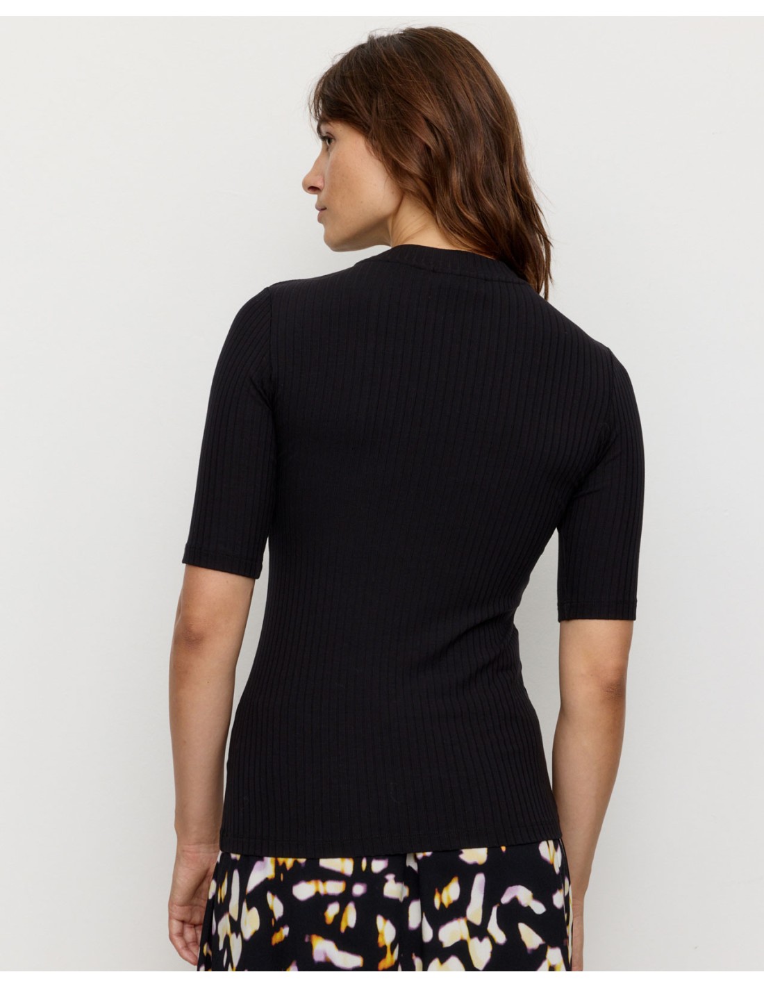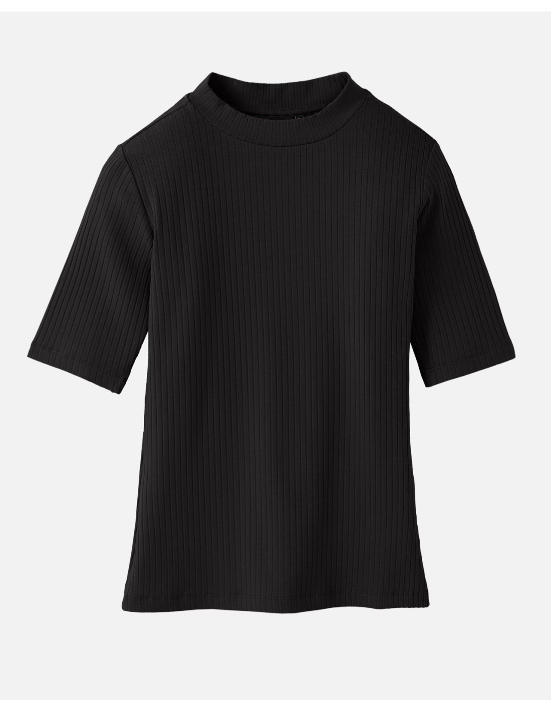 Top donna elegante e asciutto a manica corta in LENZING™ ECOVERO™ viscosa, leggerissimo, traspirante e 100% vegan. Il tessuto a costina segue il corpo con morbidezza, mentre il girocollo chiuso dona un tocco elegante e minimal. Un capo femminile, pulito e senza tempo, pensato per durare negli anni.