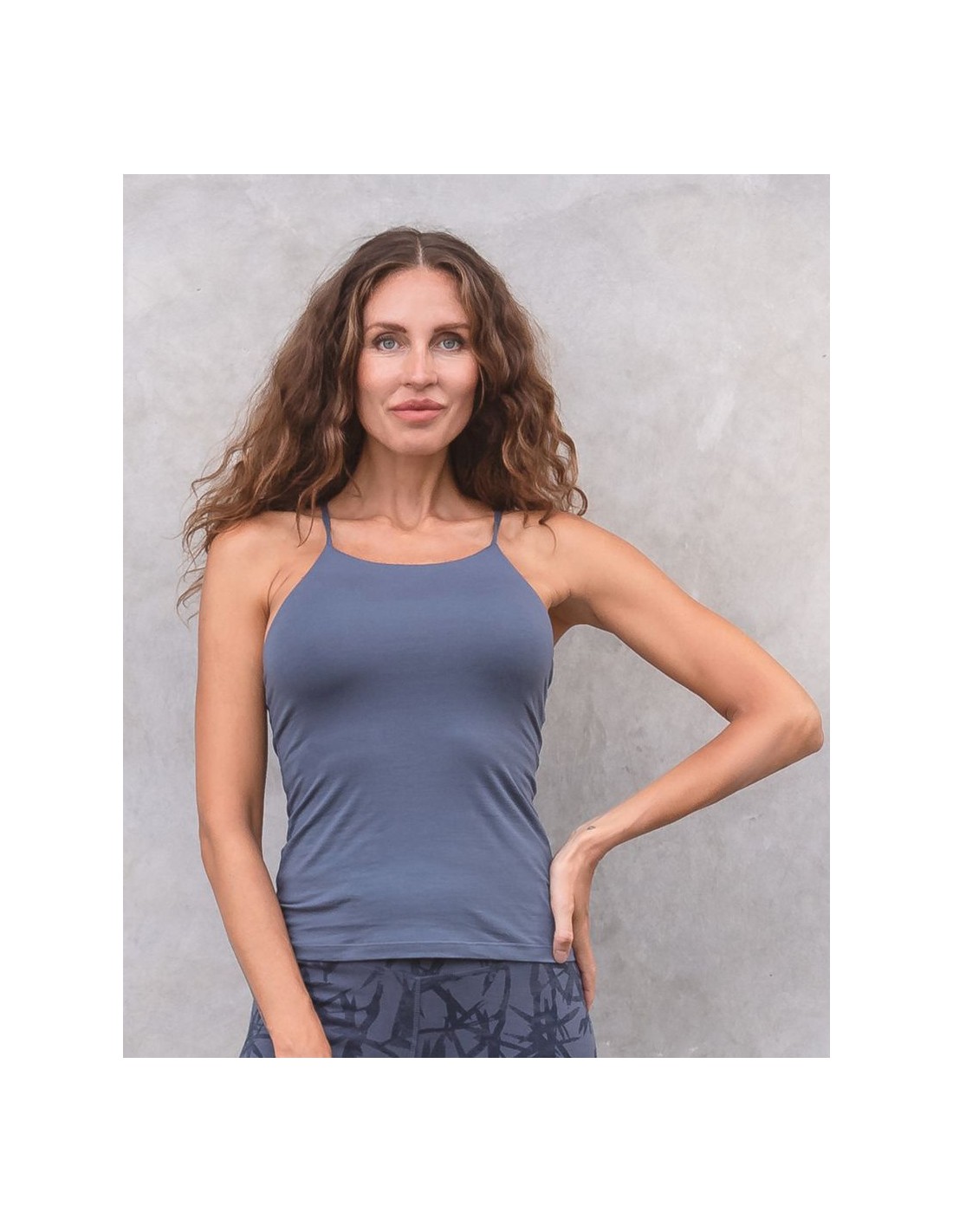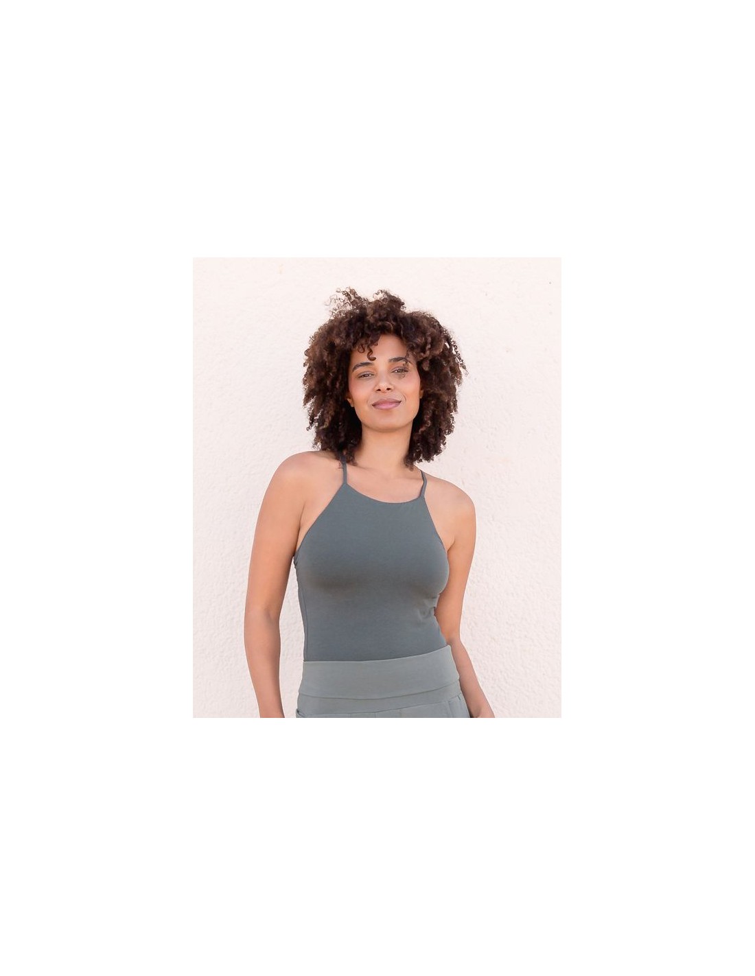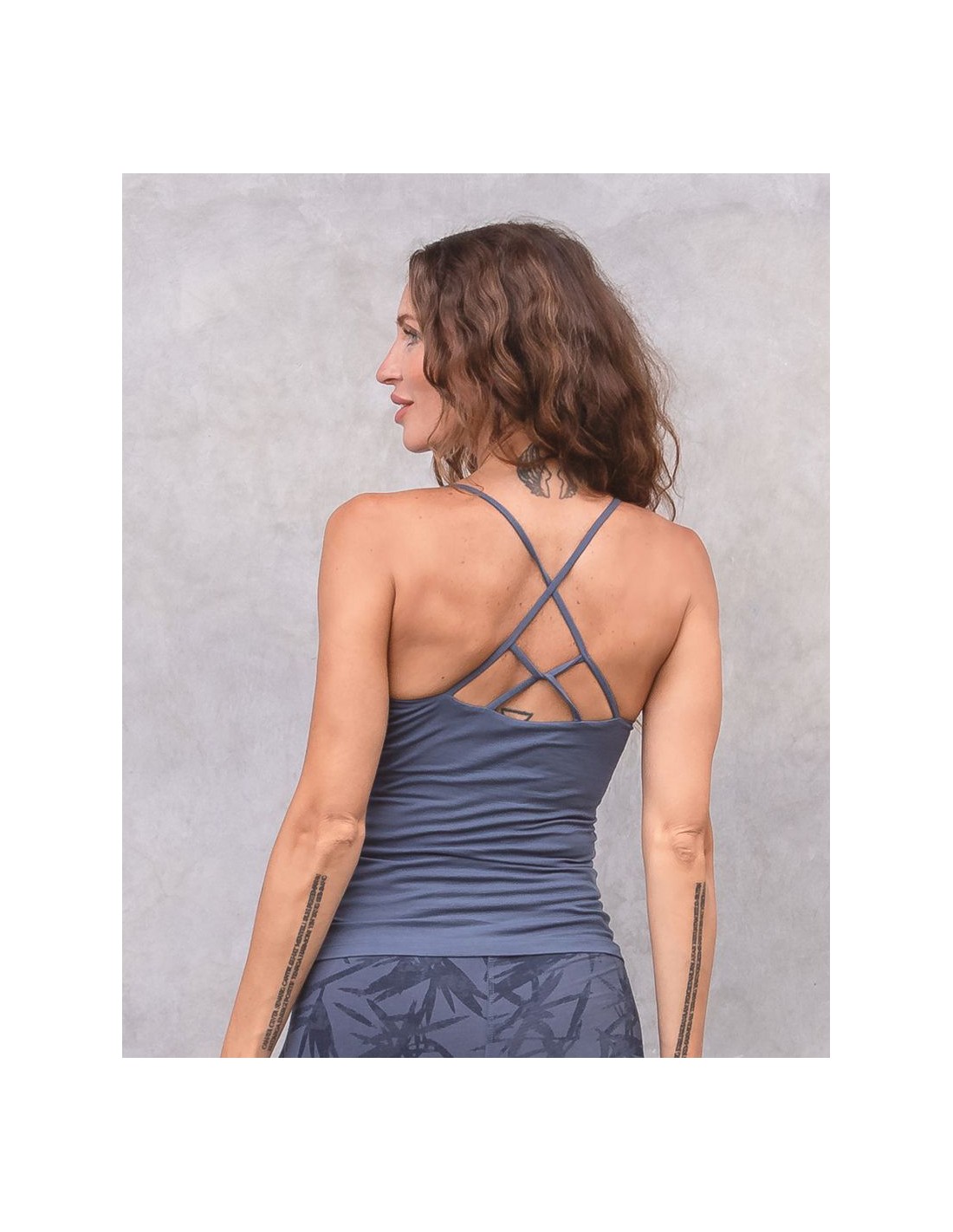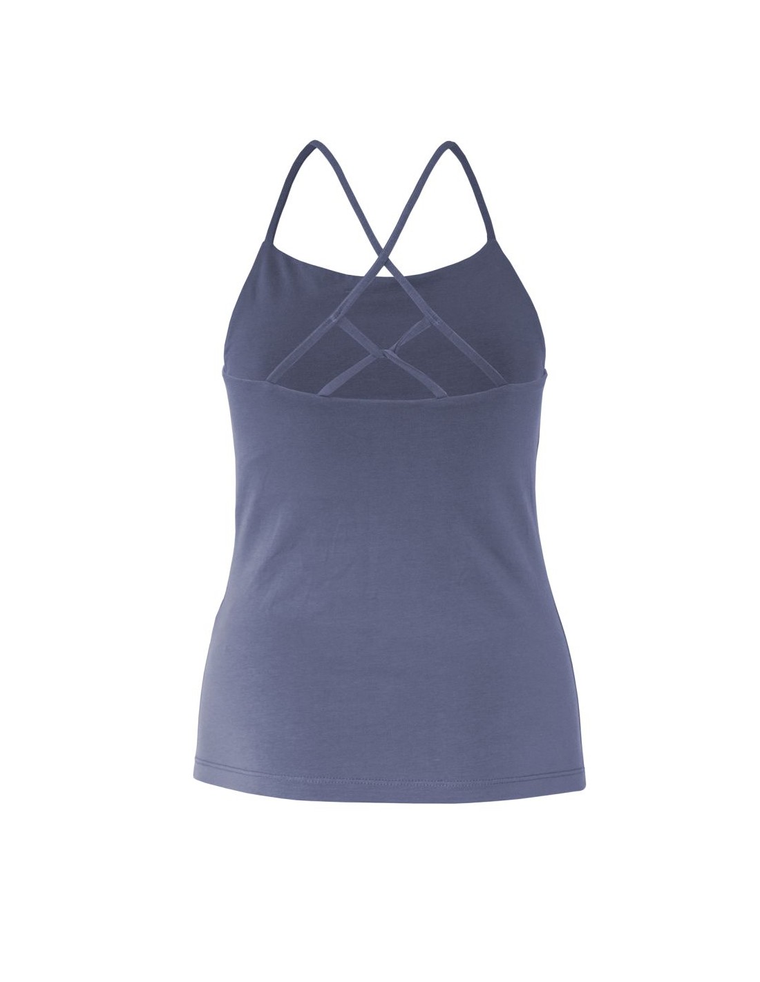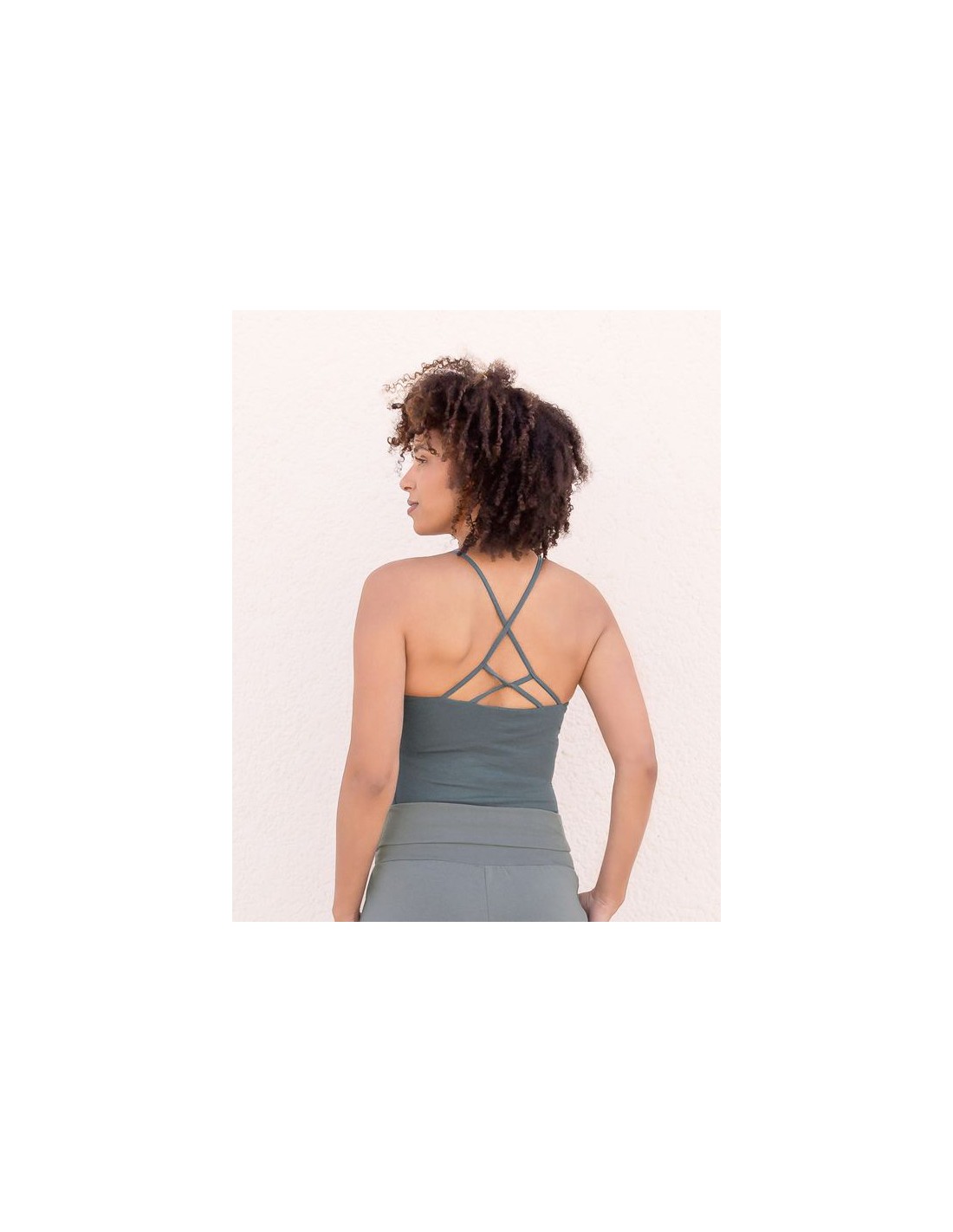 Top yoga aderente in cotone biologico GOTS con spalline sottili e bellissimo intreccio di strings sul retro. Il bustier interno a doppio strato sostiene il seno con comfort naturale, così puoi indossarlo anche senza reggiseno. Morbido, traspirante e stabile durante la pratica.