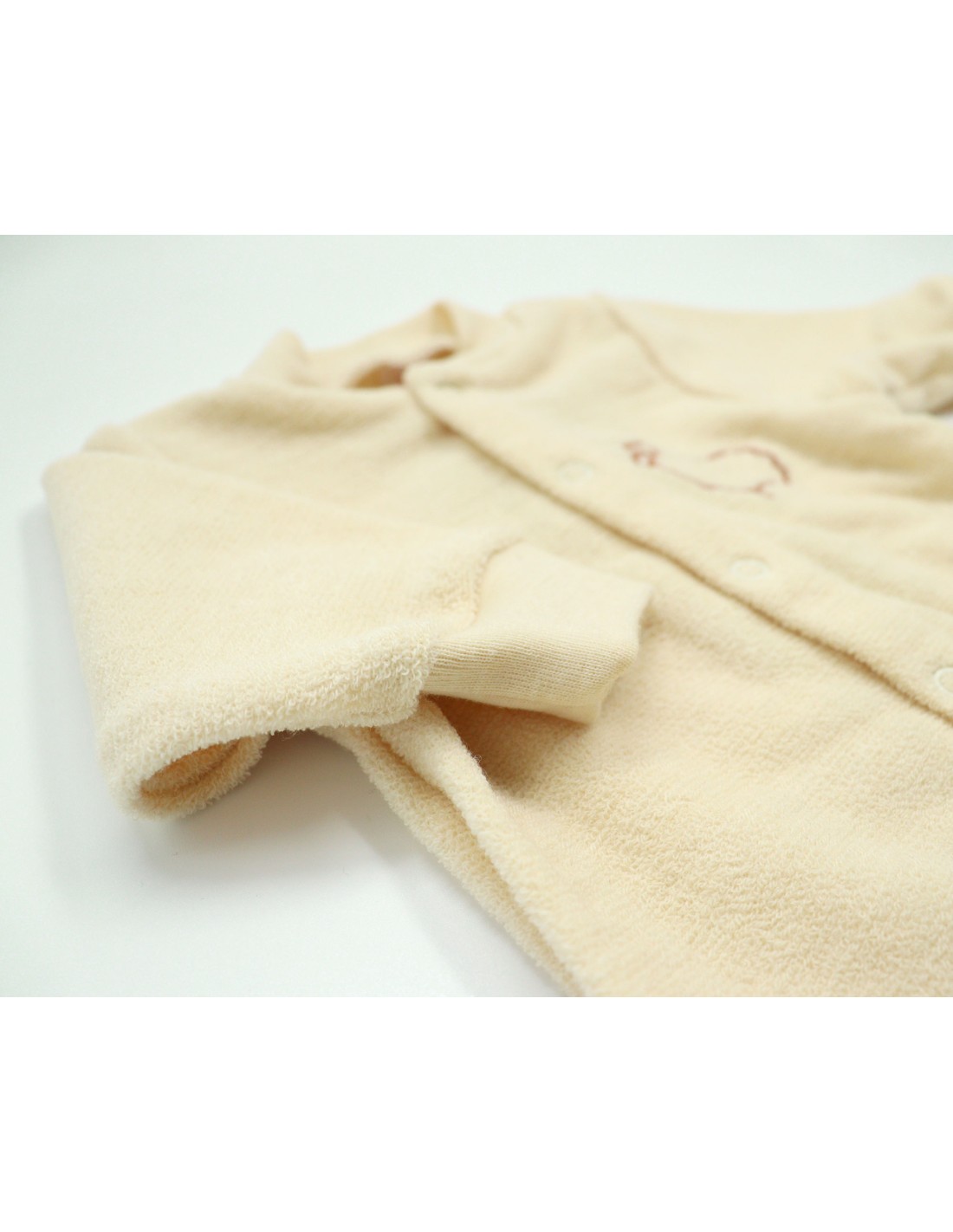 Tutina con piedi e chiusura con bottoncini a clip sul davanti.