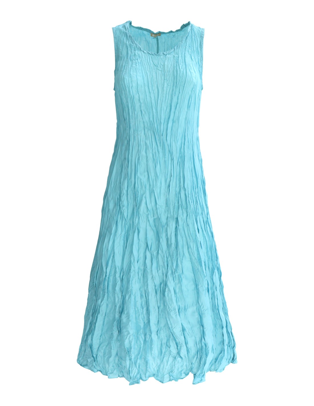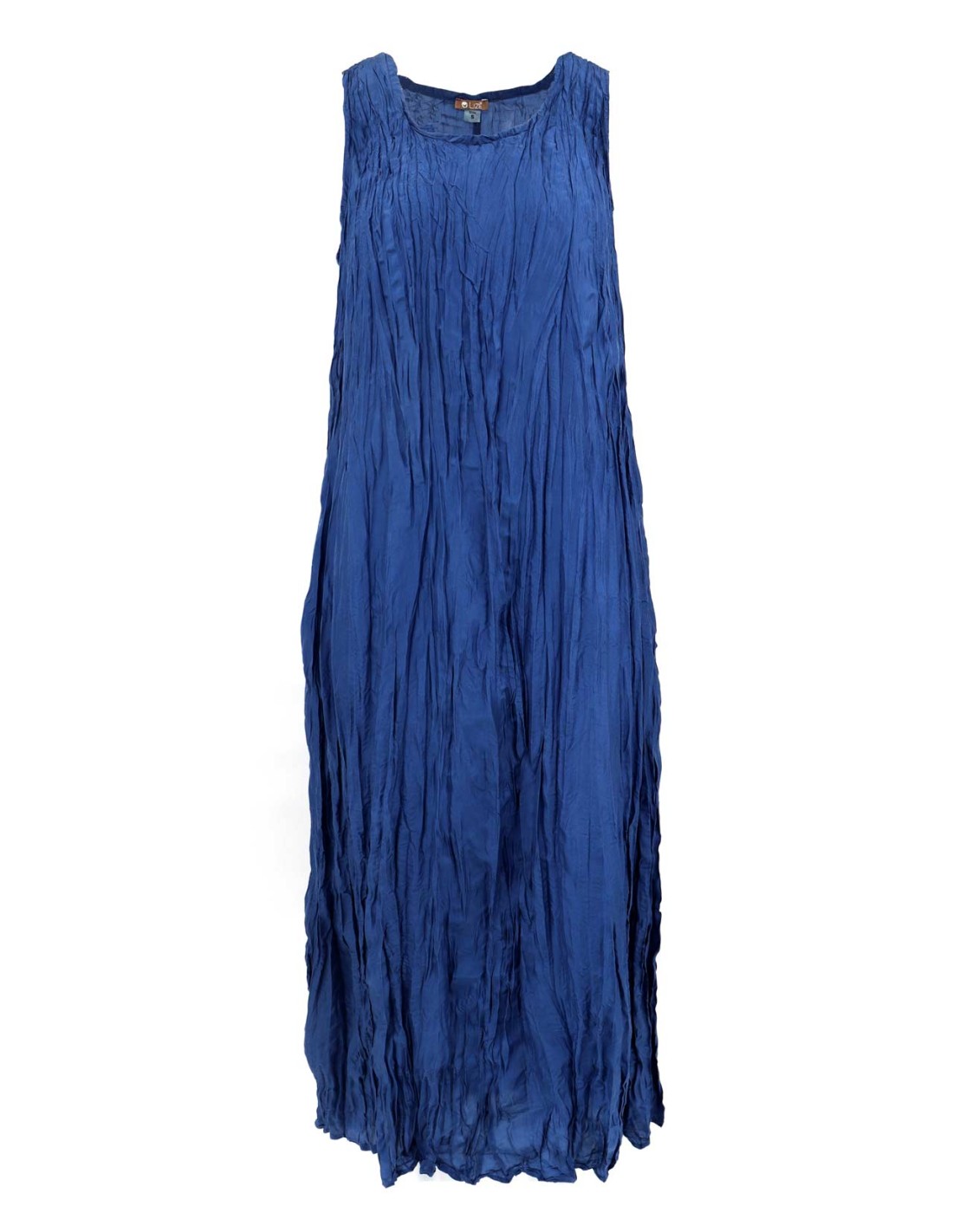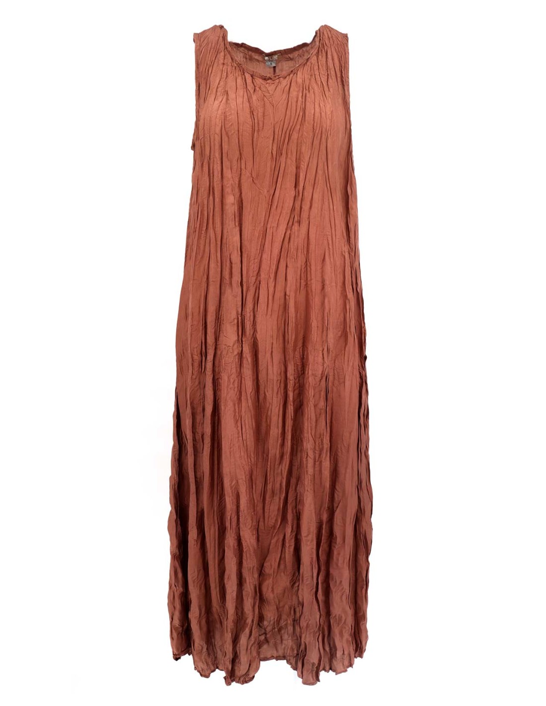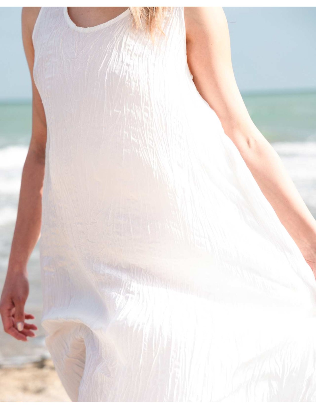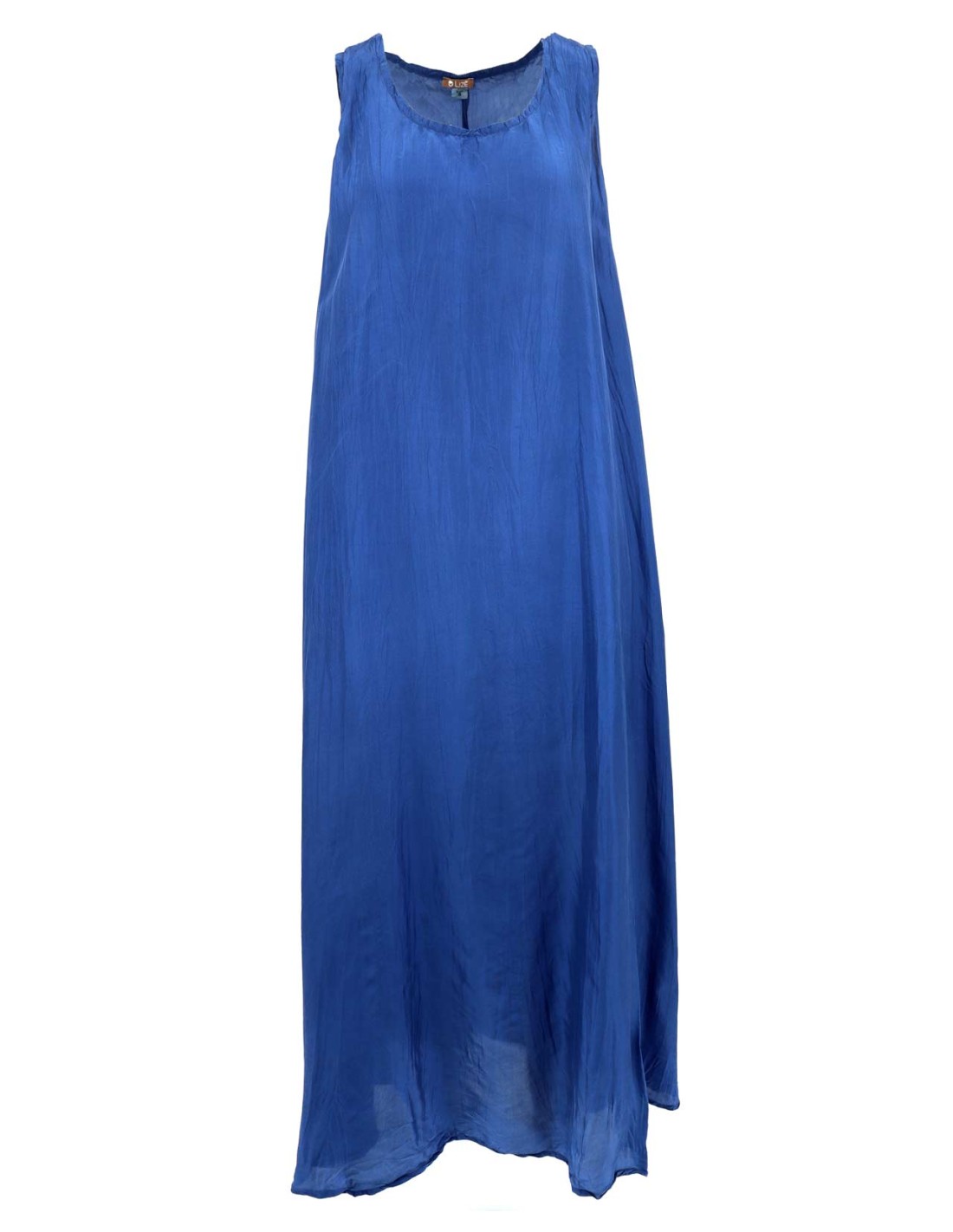 Freschissimo abito lungo alla caviglia in purissima Seta ad effetto stropicciato senza maniche e con gonna svasata ad "A". Vestibilità slim fit se increspato, e molto ampio e fluido se stirato.