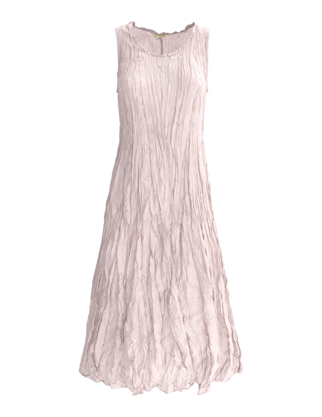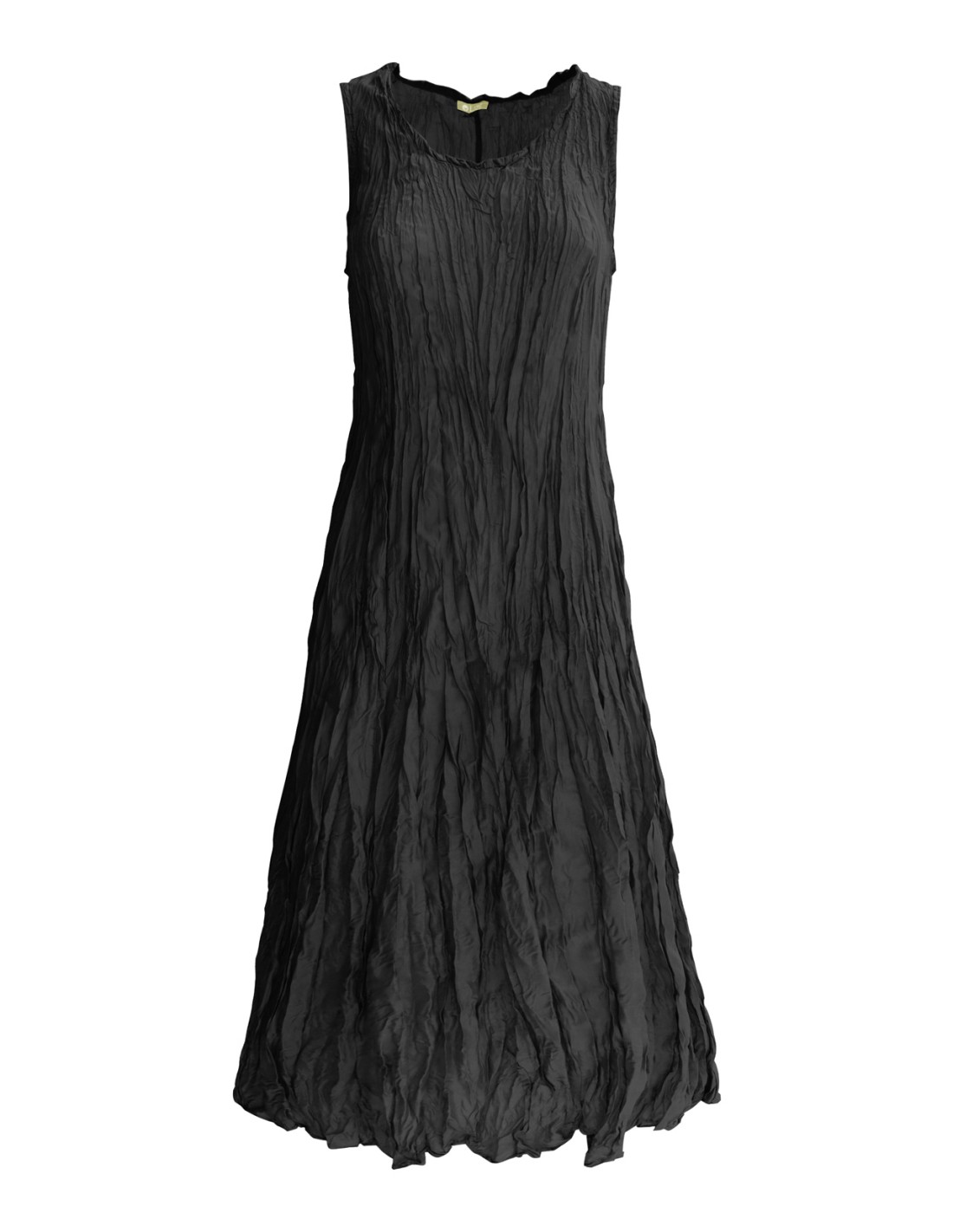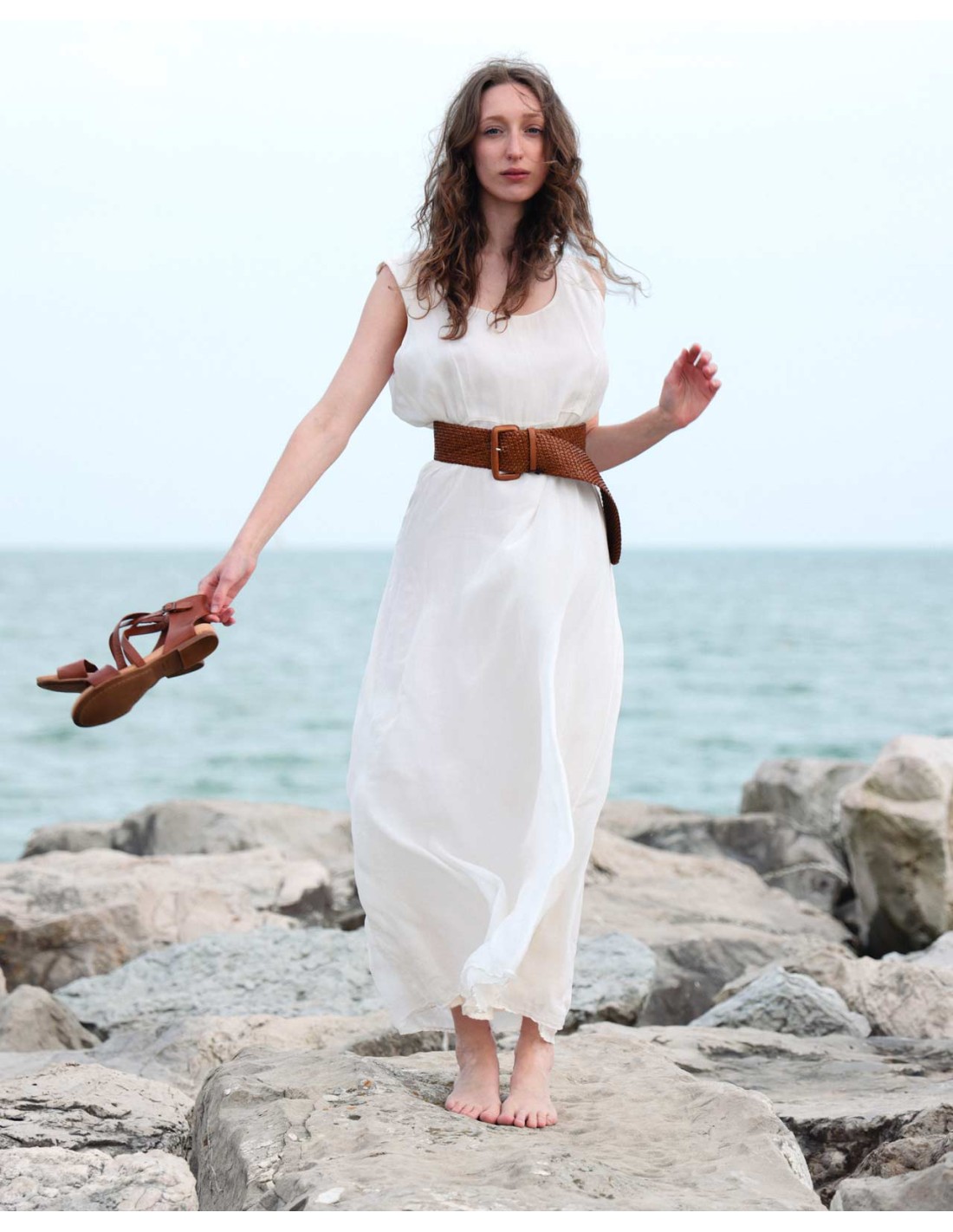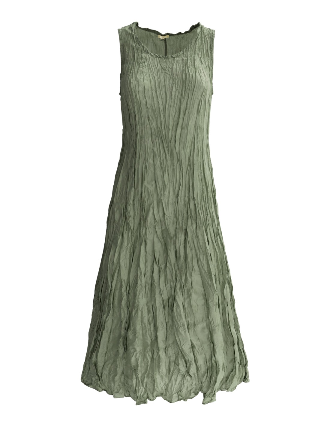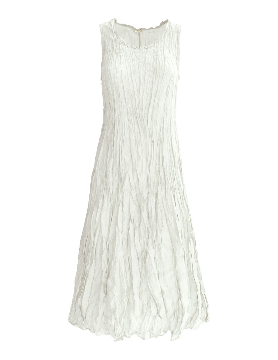 Freschissimo abito lungo alla caviglia in purissima Seta ad effetto stropicciato senza maniche e con gonna svasata ad "A". Vestibilità slim fit se increspato, e molto ampio e fluido se stirato.