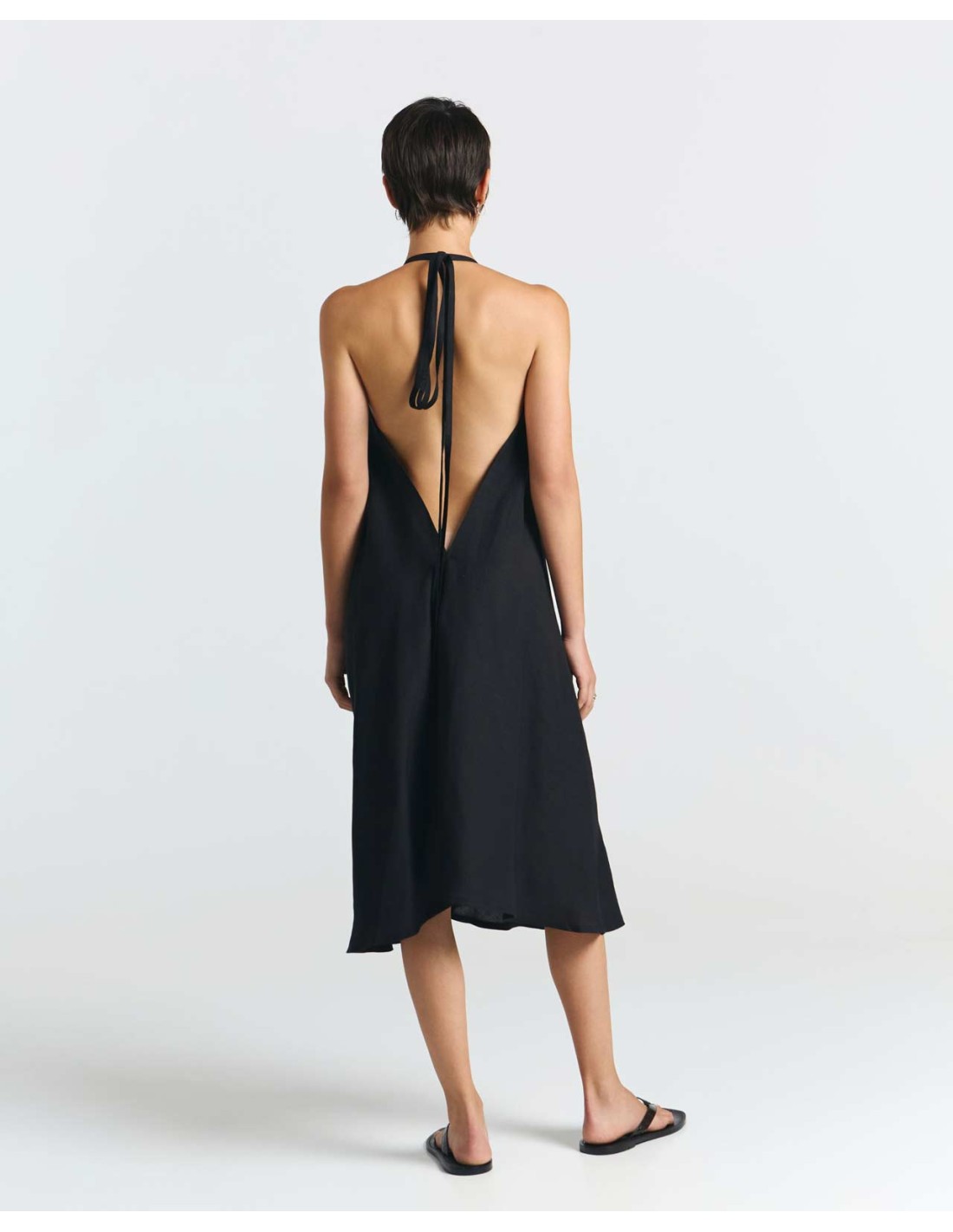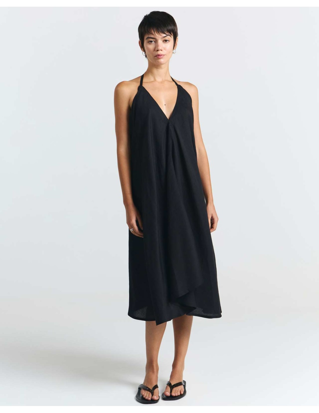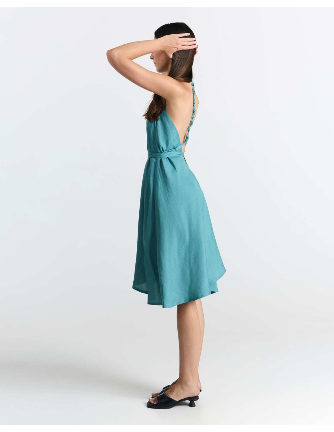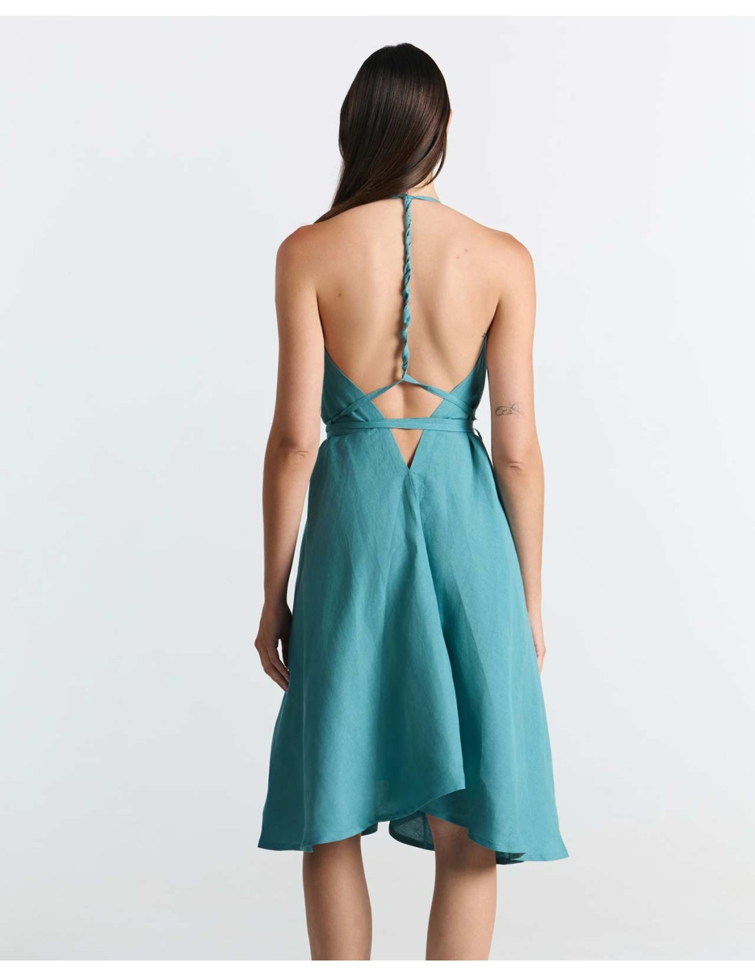 Il tessuto è leggerissima Ecoviscosa unita al Lino, traspirante e naturale, perfetto per l'estate. Lo stile casual e leggermente stropicciato del Lino dona carattere e brio a quest'abito, da indossare anche a piedi nudi sulla sabbia.