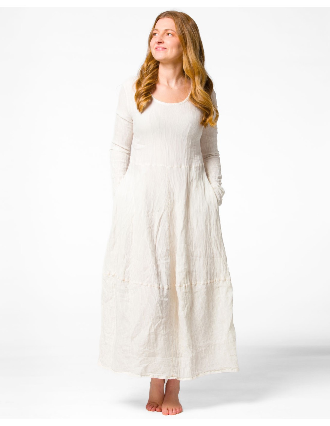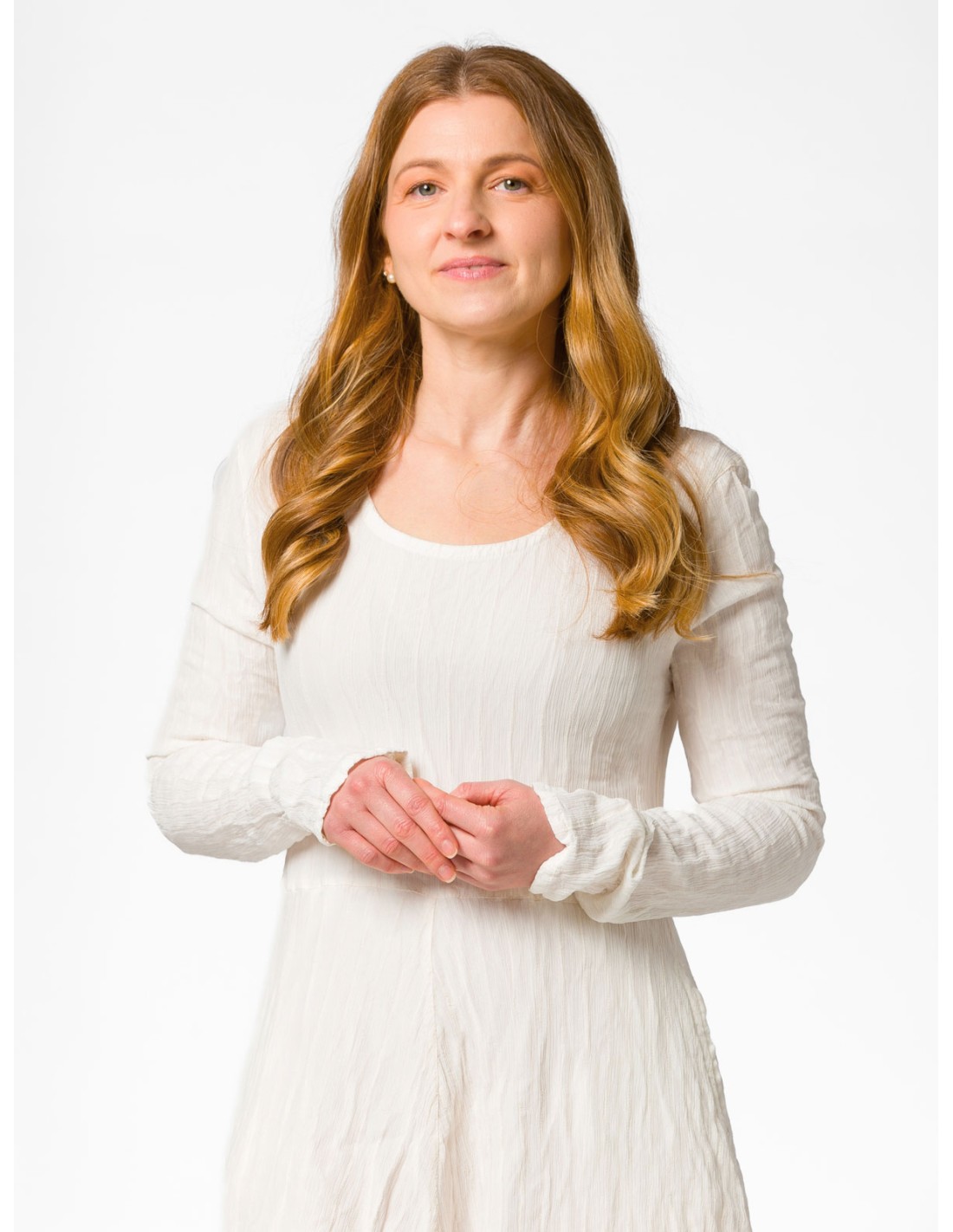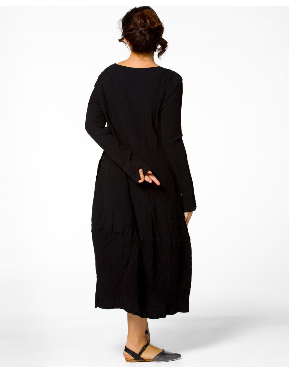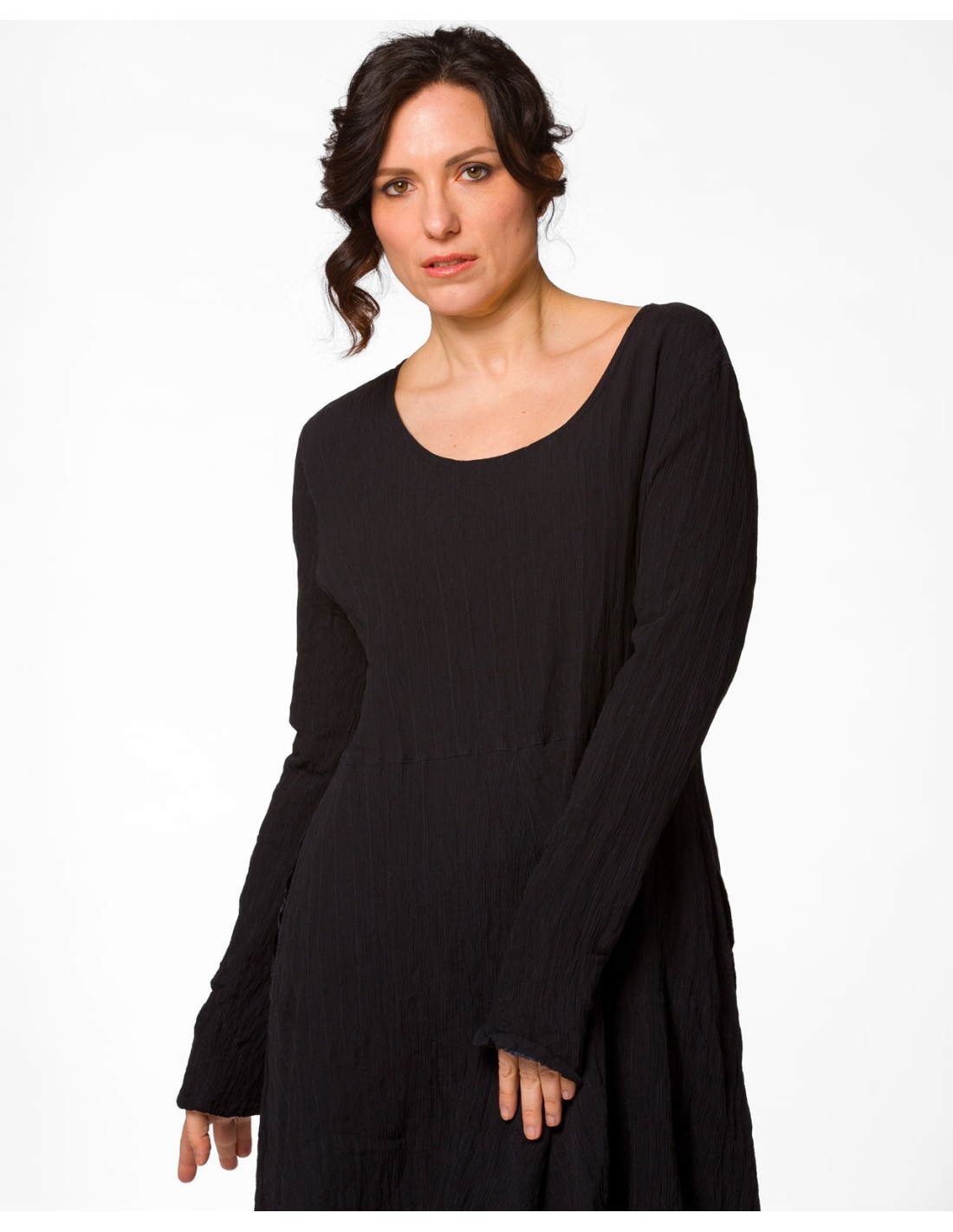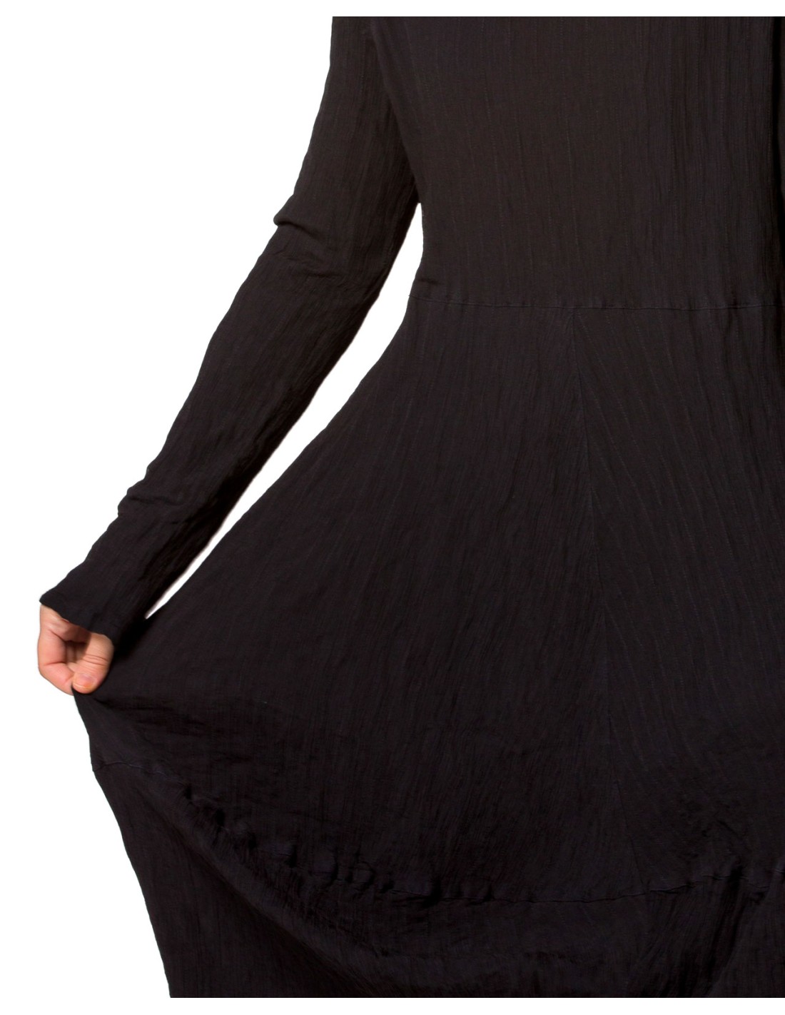 Abito in seta increspata doppiata con effetto plissé, realizzato in un prezioso tessuto di seta, cotone ed ecoviscosa. Corpetto asciutto, maniche lunghe, tasche laterali e gonna a palloncino. Femminile, caldo e raffinato, un abito minimal fashion perfetto per l’inverno e per le stagioni fredde.