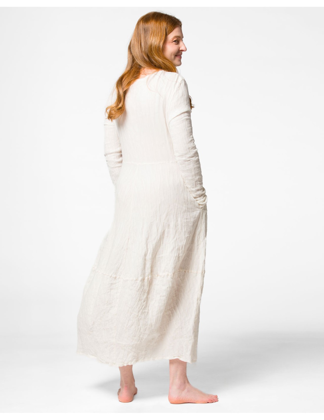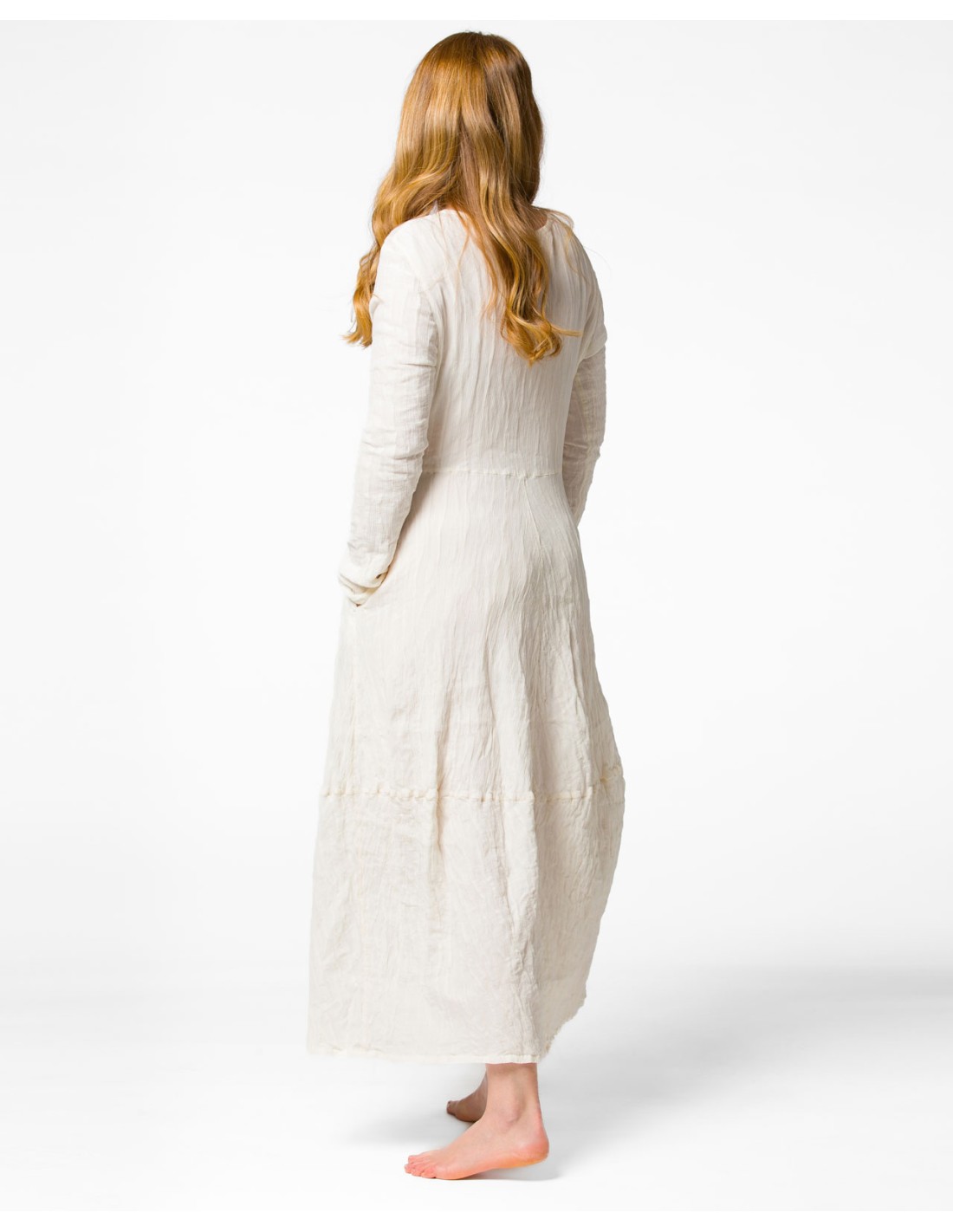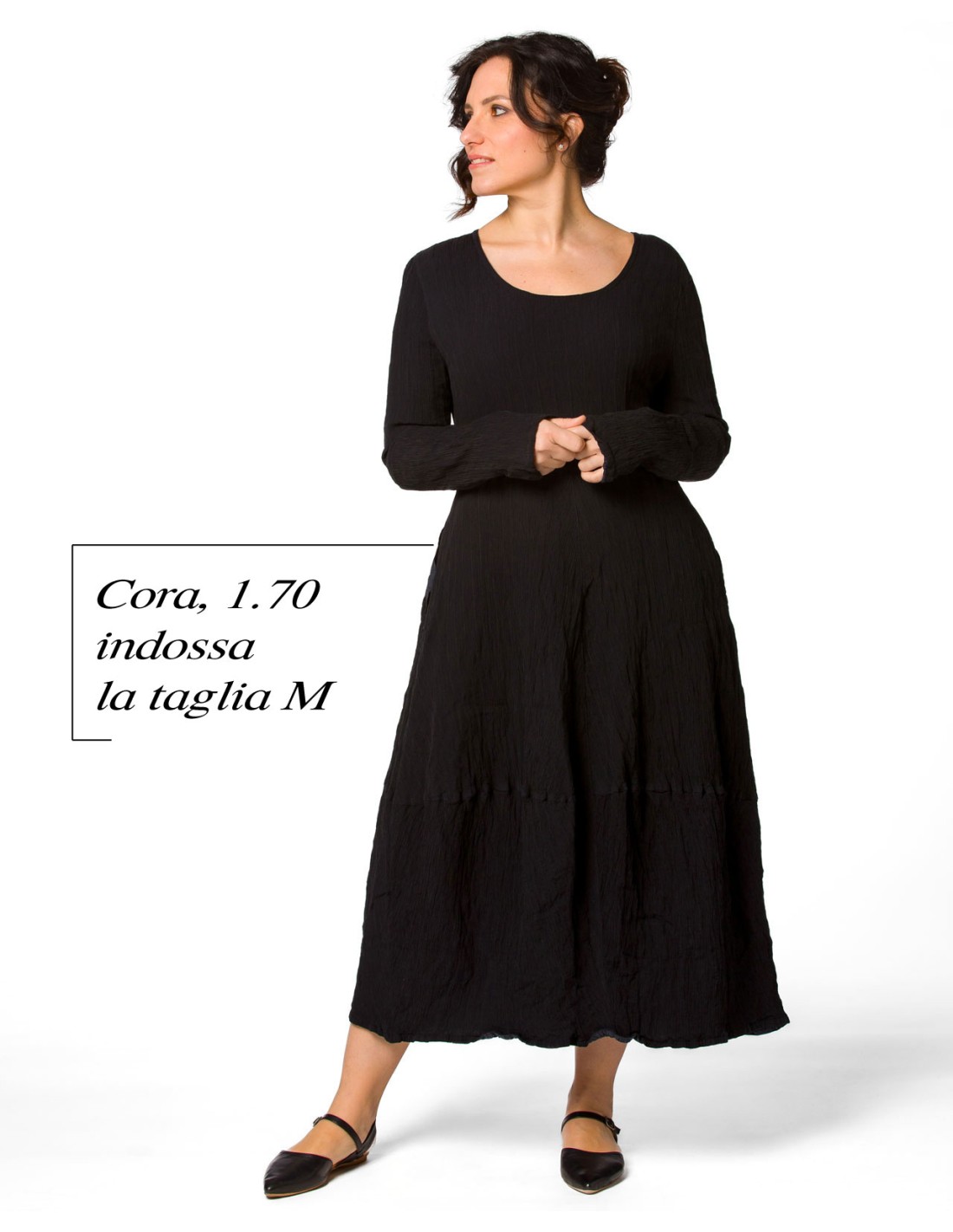 Il tessuto è vivo, materico e prezioso, ma allo stesso tempo sorprendentemente confortevole. La seta doppia rende l’abito caldo e avvolgente, perfetto per l’inverno e per le stagioni fredde, mantenendo sempre una sensazione piacevole sulla pelle. Dopo il lavaggio la fibra può apparire più chiusa, ma con una semplice stiratura torna dritta e perfetta, conservando l’increspatura e l’effetto plissettato che lo rendono unico.