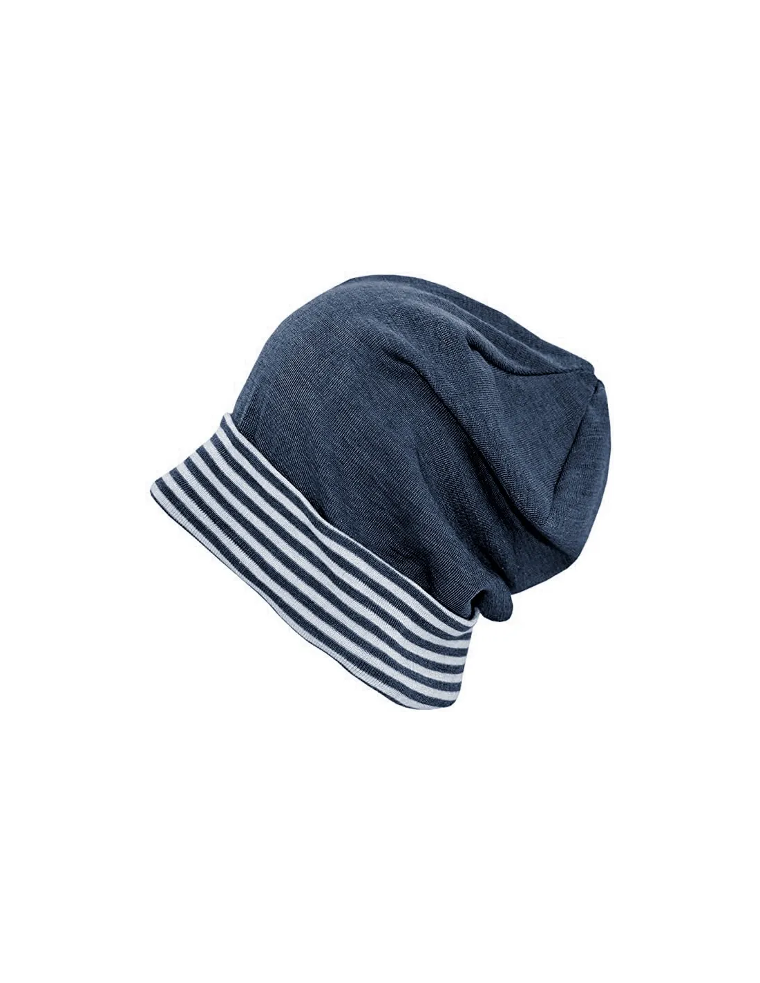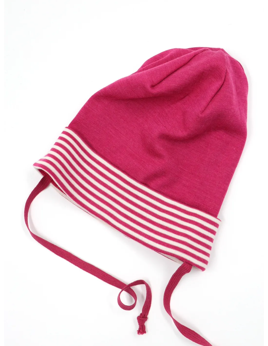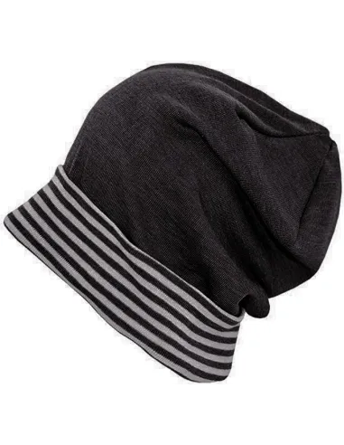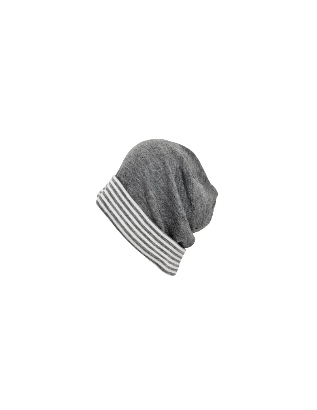 Modello dalla forma leggermente allungata con risvolto a righe sulla fronte. Il tessuto è una maglina sottile di 70% Lana Merino e 30% Seta, naturalmente molto elastico e avvolgente, si adatta tantissimo e "cresce con il bambino".