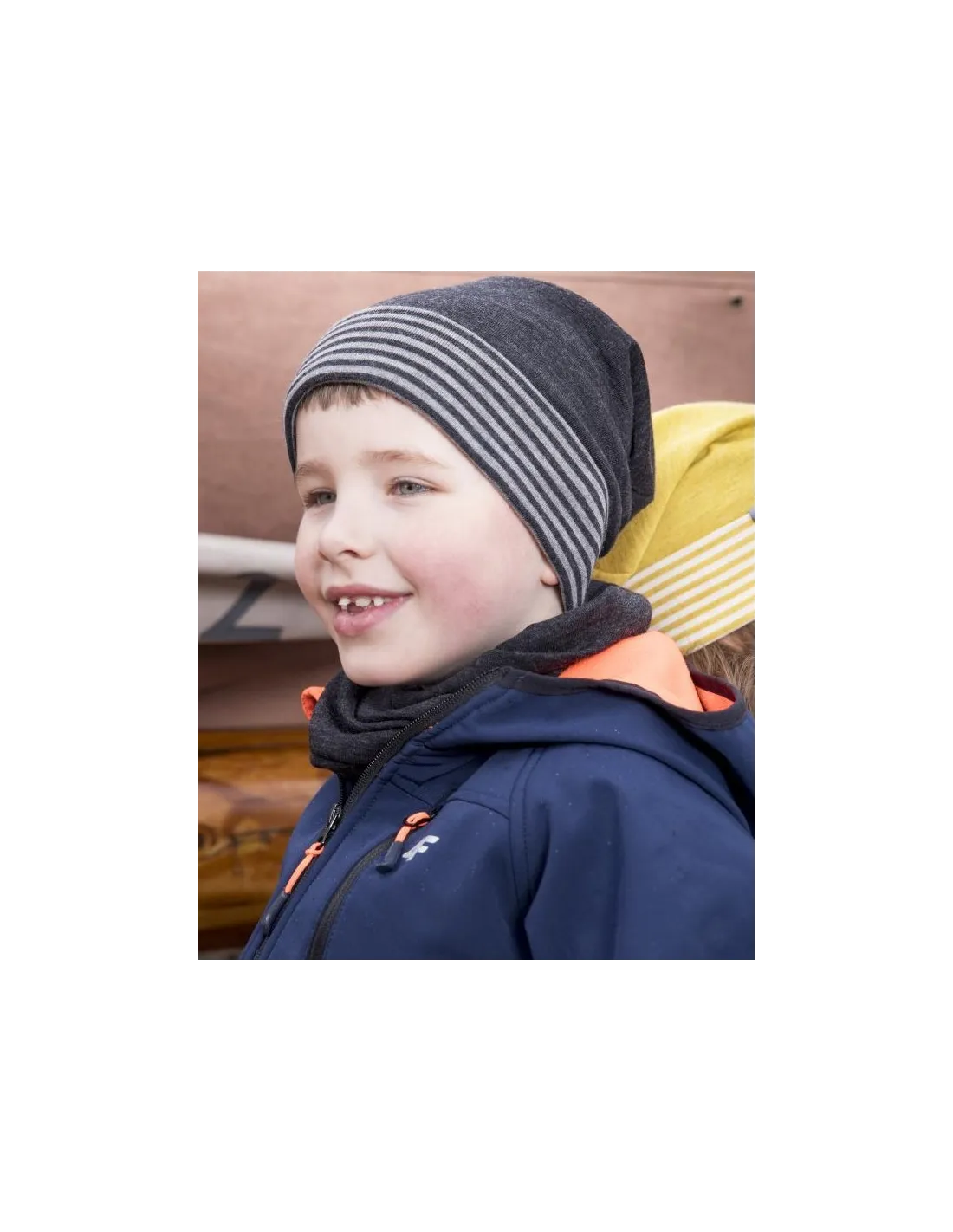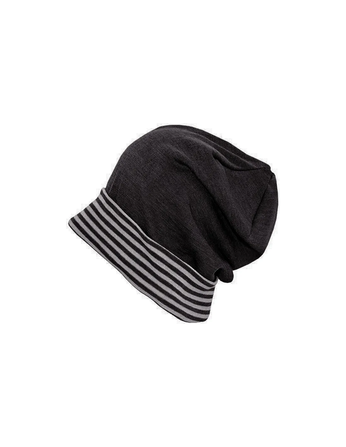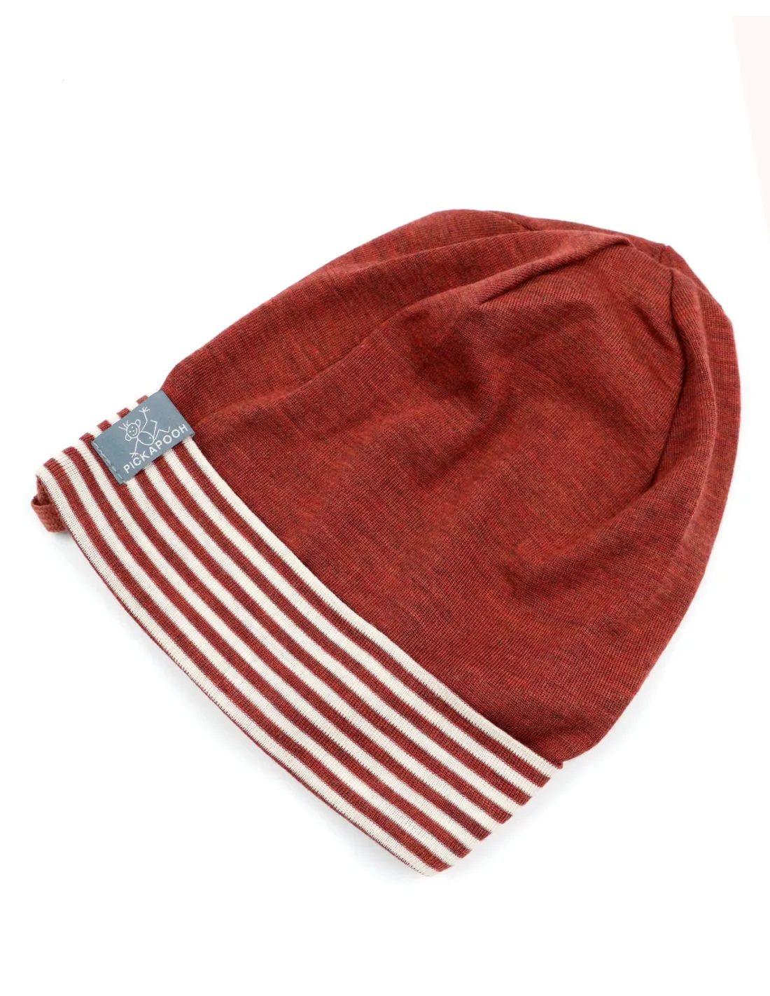 Modello dalla forma leggermente allungata con risvolto a righe sulla fronte. Il tessuto è una maglina sottile di 70% Lana Merino e 30% Seta, naturalmente molto elastico e avvolgente, si adatta tantissimo e "cresce con il bambino".