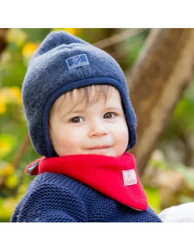 Morbido, caldo e anallergico berretto bimbi reversibile dalla forma a punta realizzato in Pile di Lana Merino con interno in Cotone Biologico.