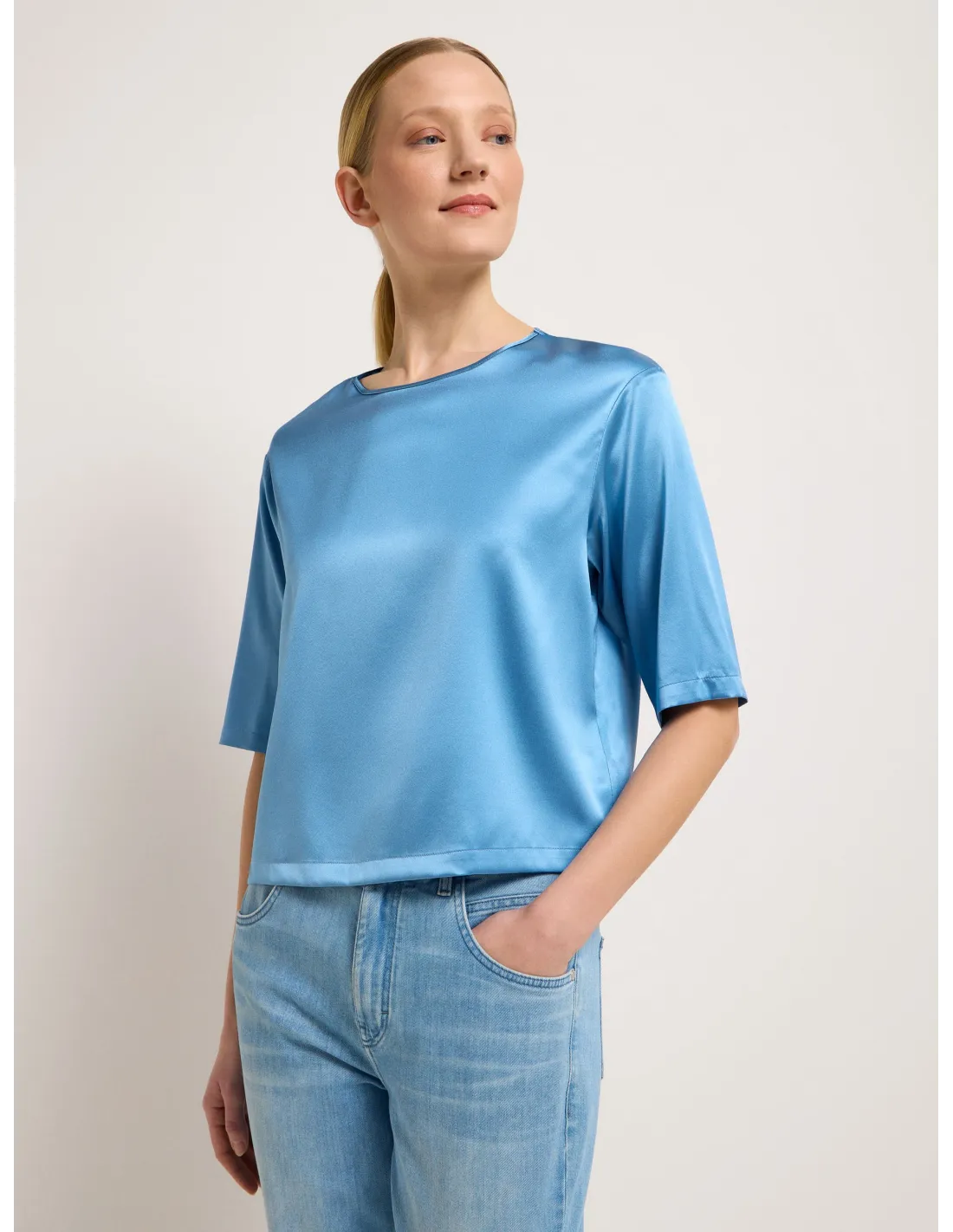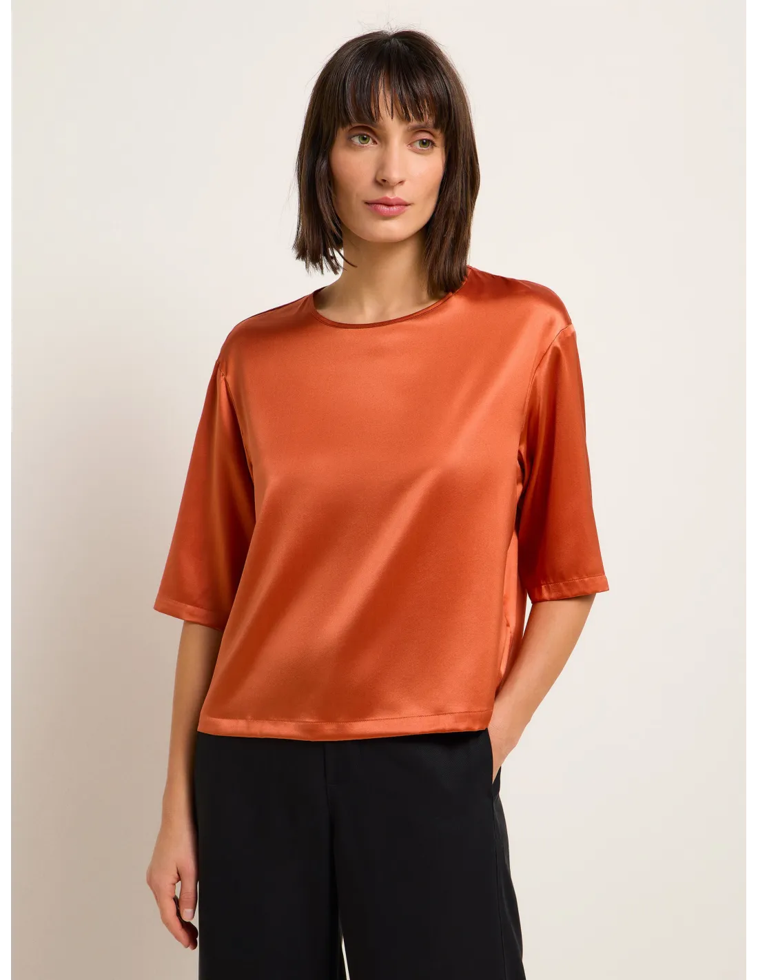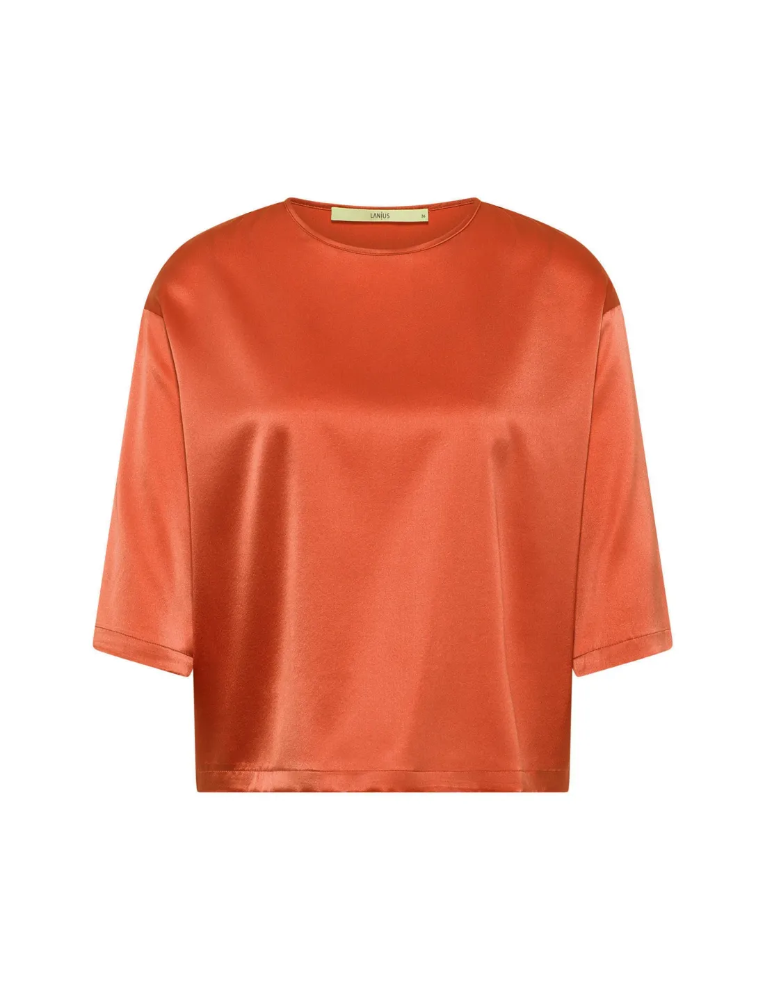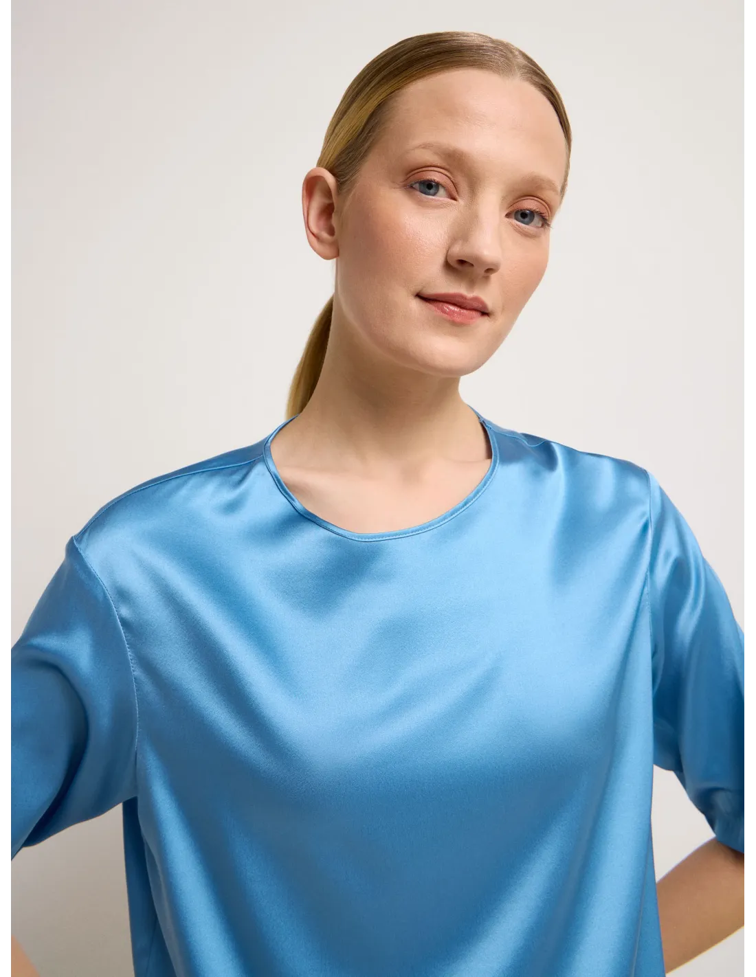 Elegante e bellissima blusa squadrata con maniche a komono realizzata in Seta Satin, lucida, liscia e luminosa. perfetta da sottogiacca o da sola in primavera.
