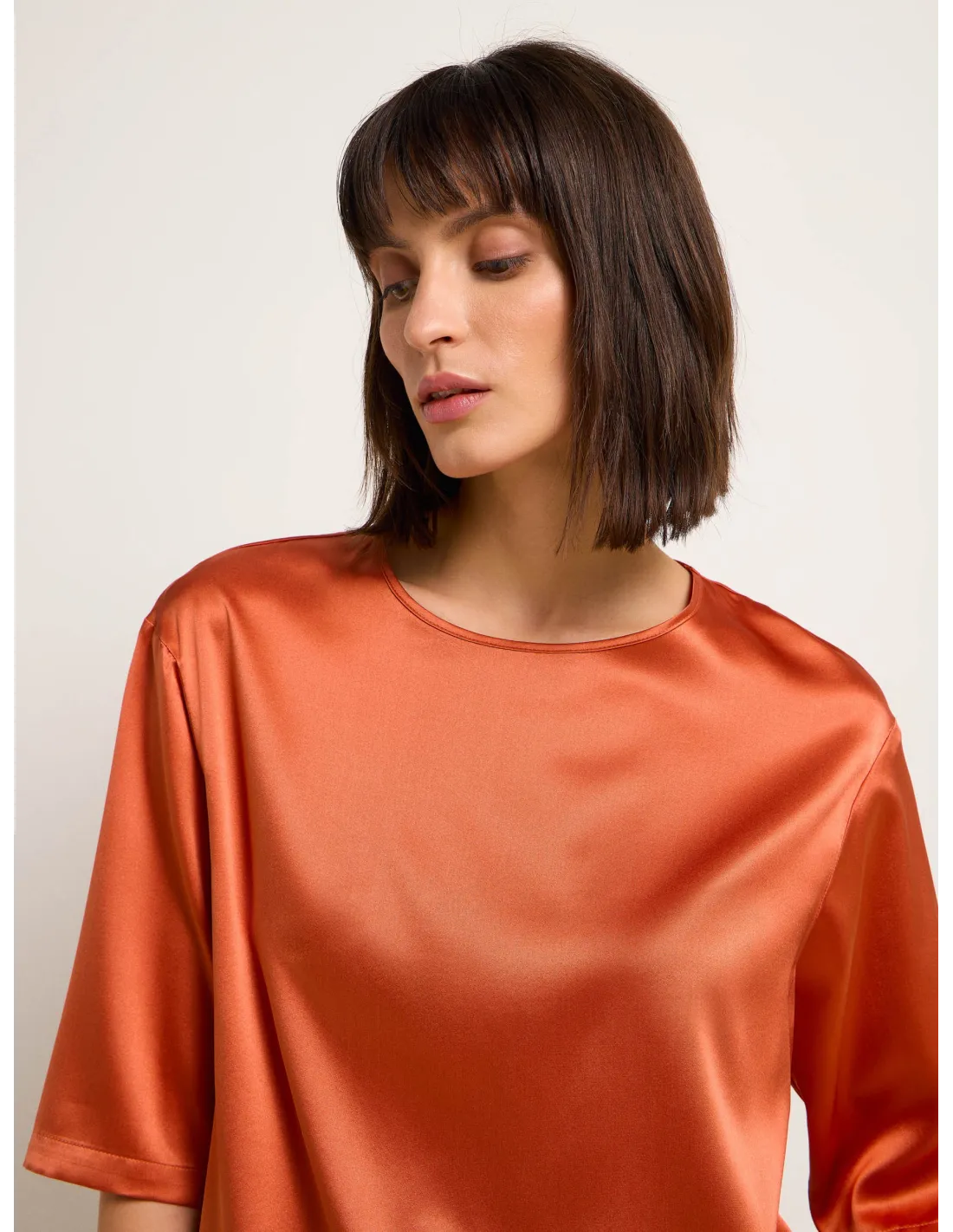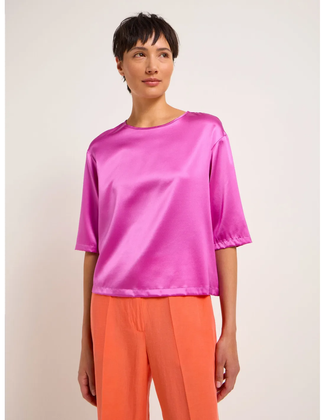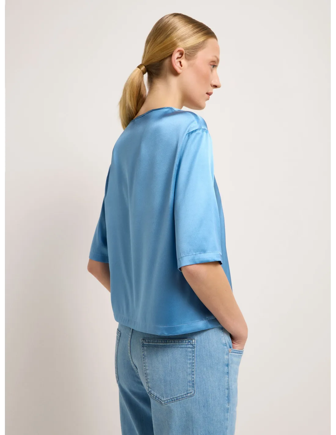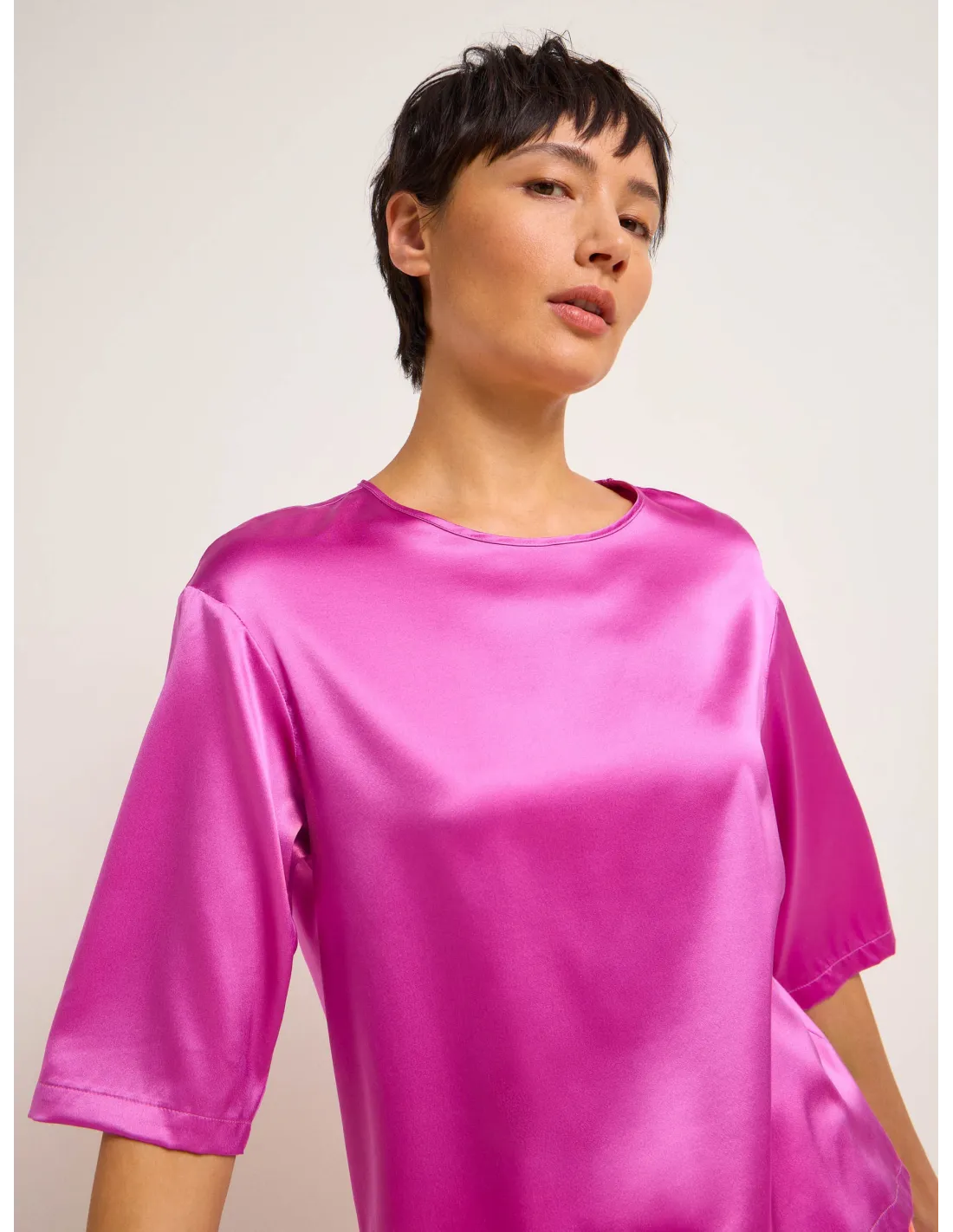 Elegante e bellissima blusa squadrata con maniche a komono realizzata in Seta Satin, lucida, liscia e luminosa. perfetta da sottogiacca o da sola in primavera.