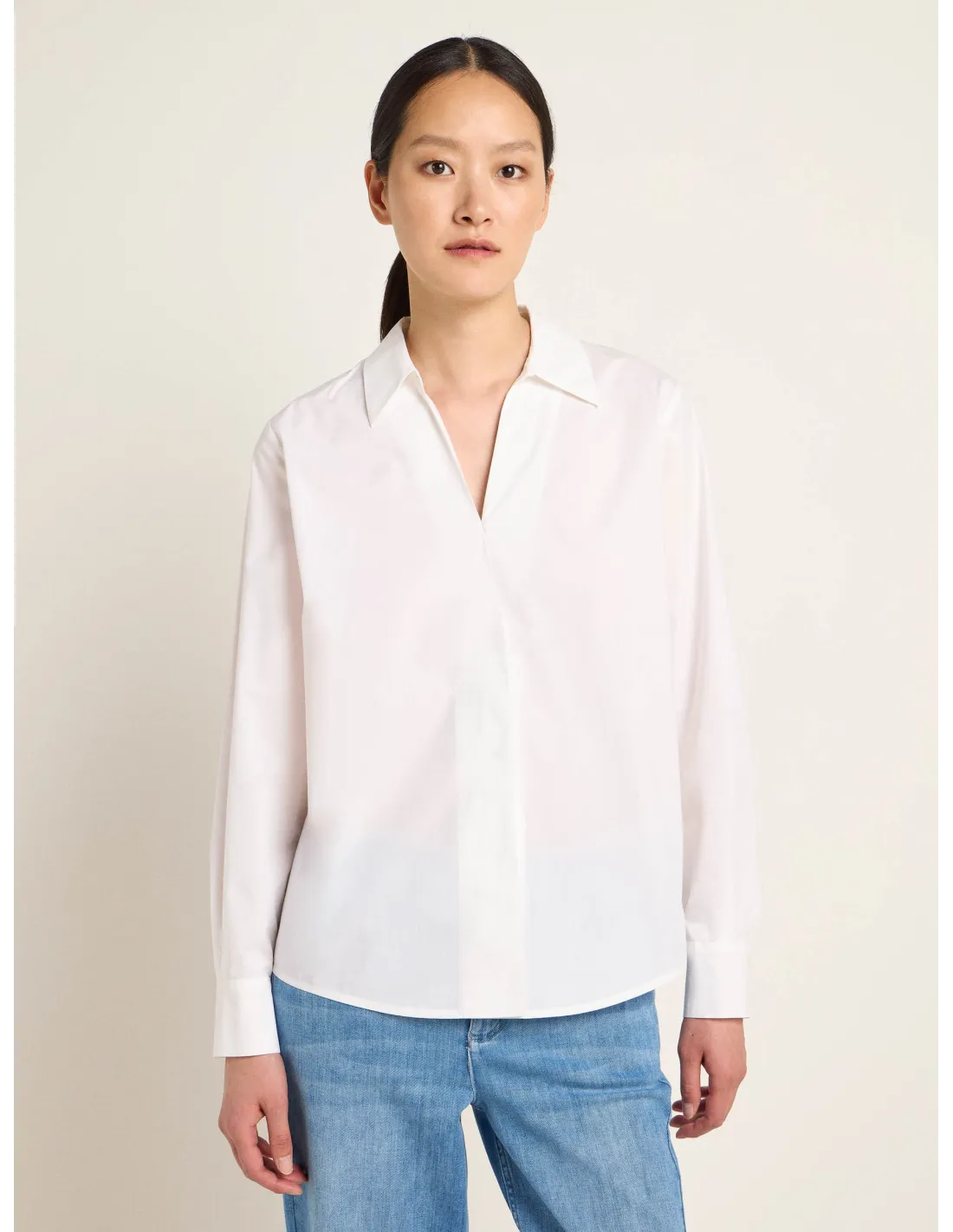 Bellissima Camicia realizzata in popeline di 100% Cotone Biologico GOTS con scollo a V e abbottonatura nascosta. Particolare, minimal ed essenziale.