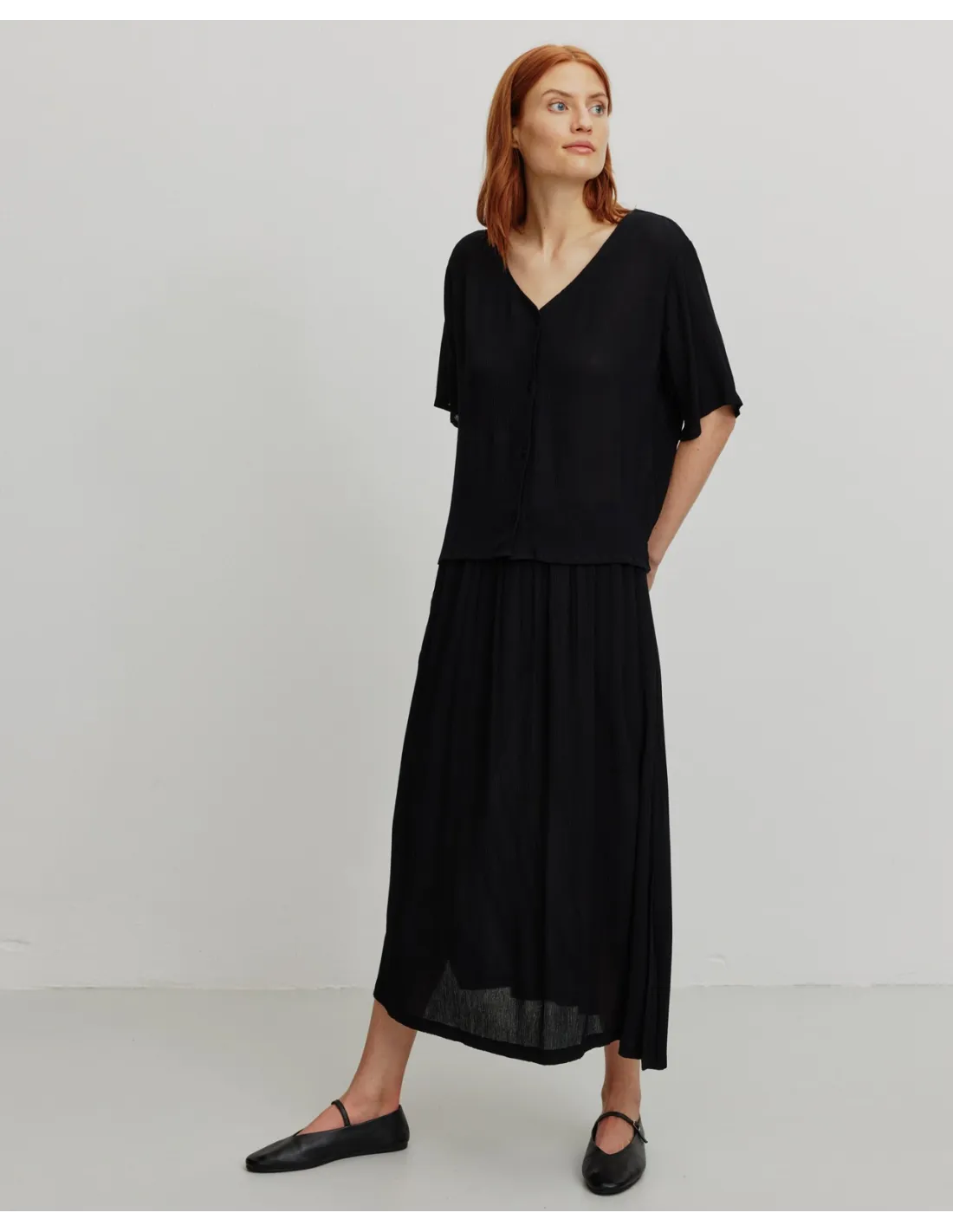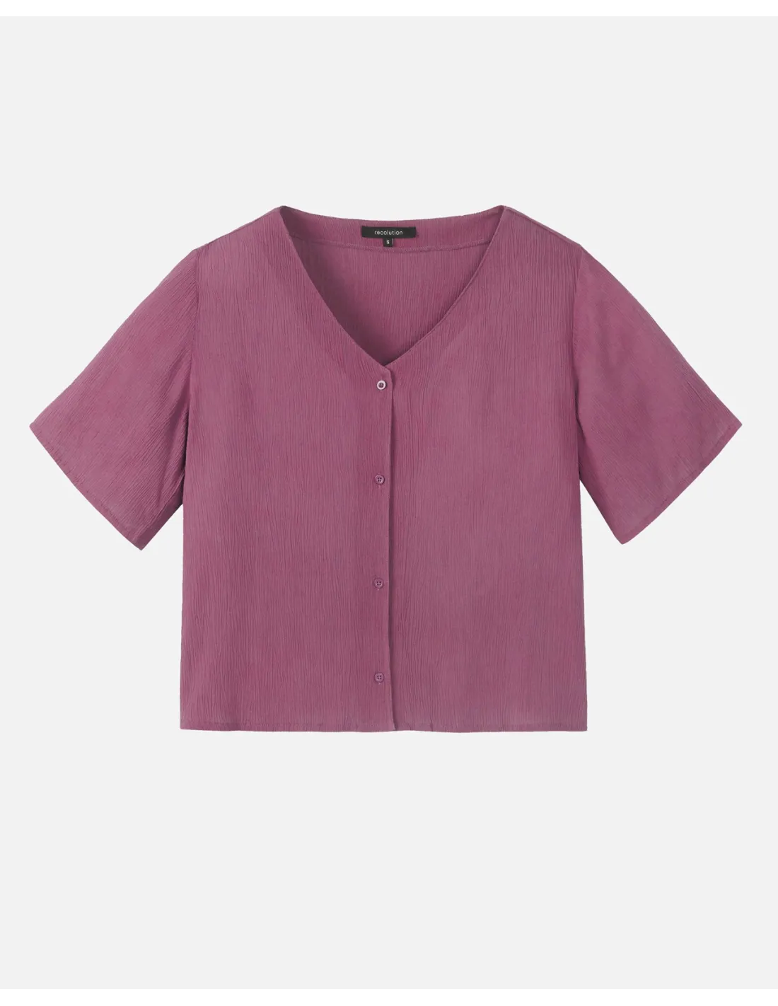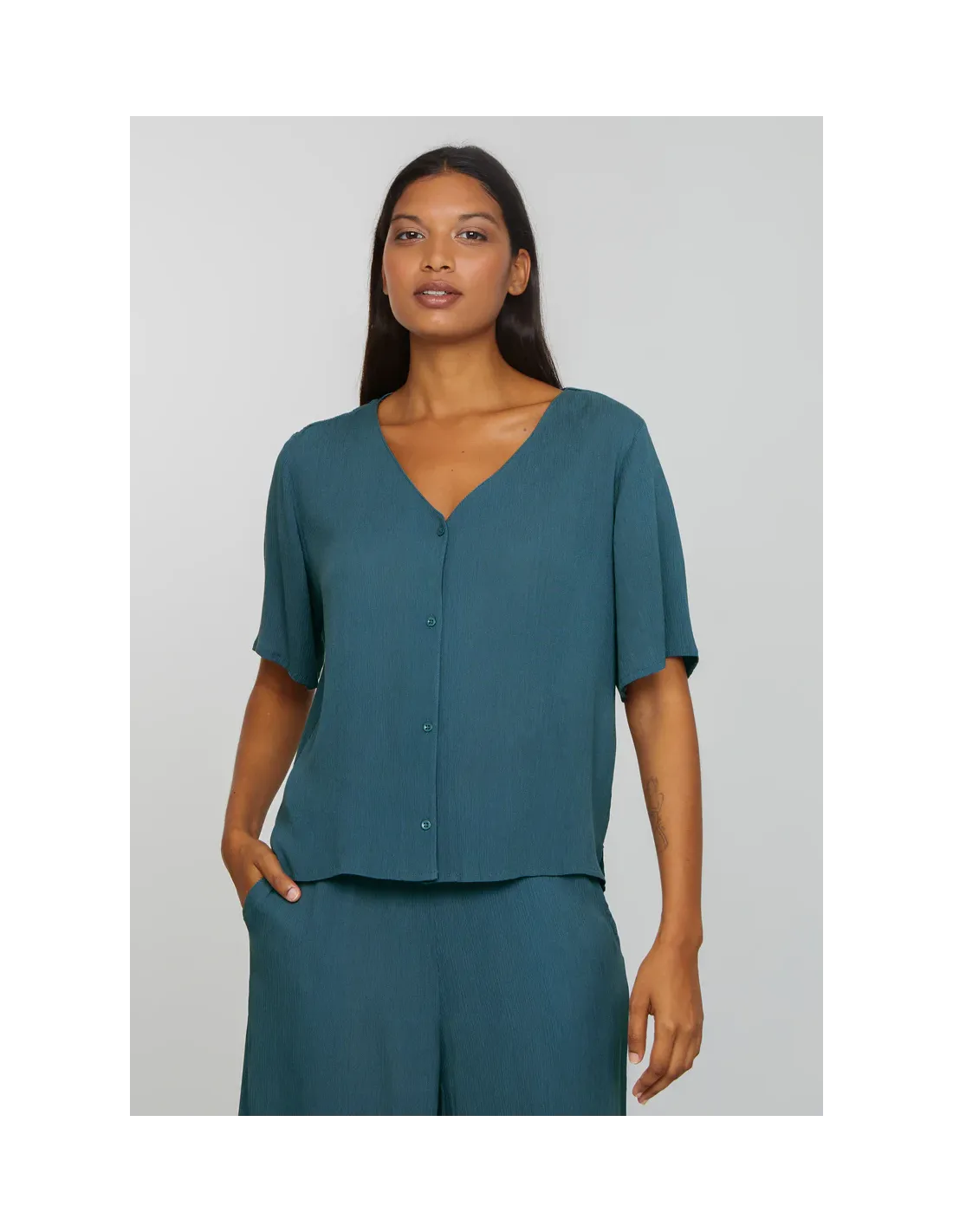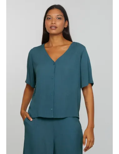 Camicetta squadrata in 100% Ecoviscosa LENZING™ ECOVERO™, leggera, fluida e naturalmente fresca sulla pelle. La lavorazione increspata la rende ariosa e piacevole anche nelle giornate più calde. Taglio minimal con scollo a V e abbottonatura lunga, vestibilità regolare e morbida. Vegan, naturale e sostenibile.