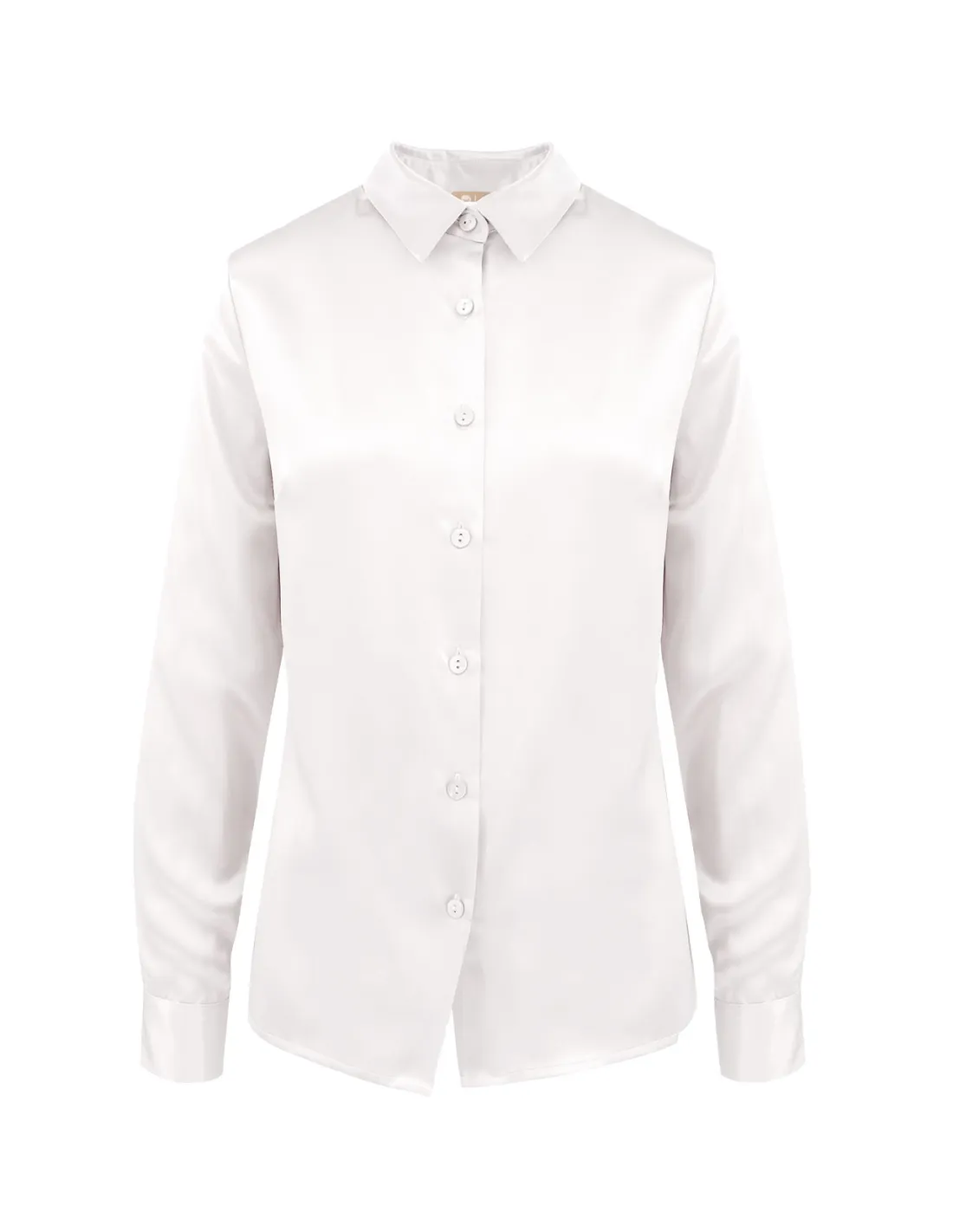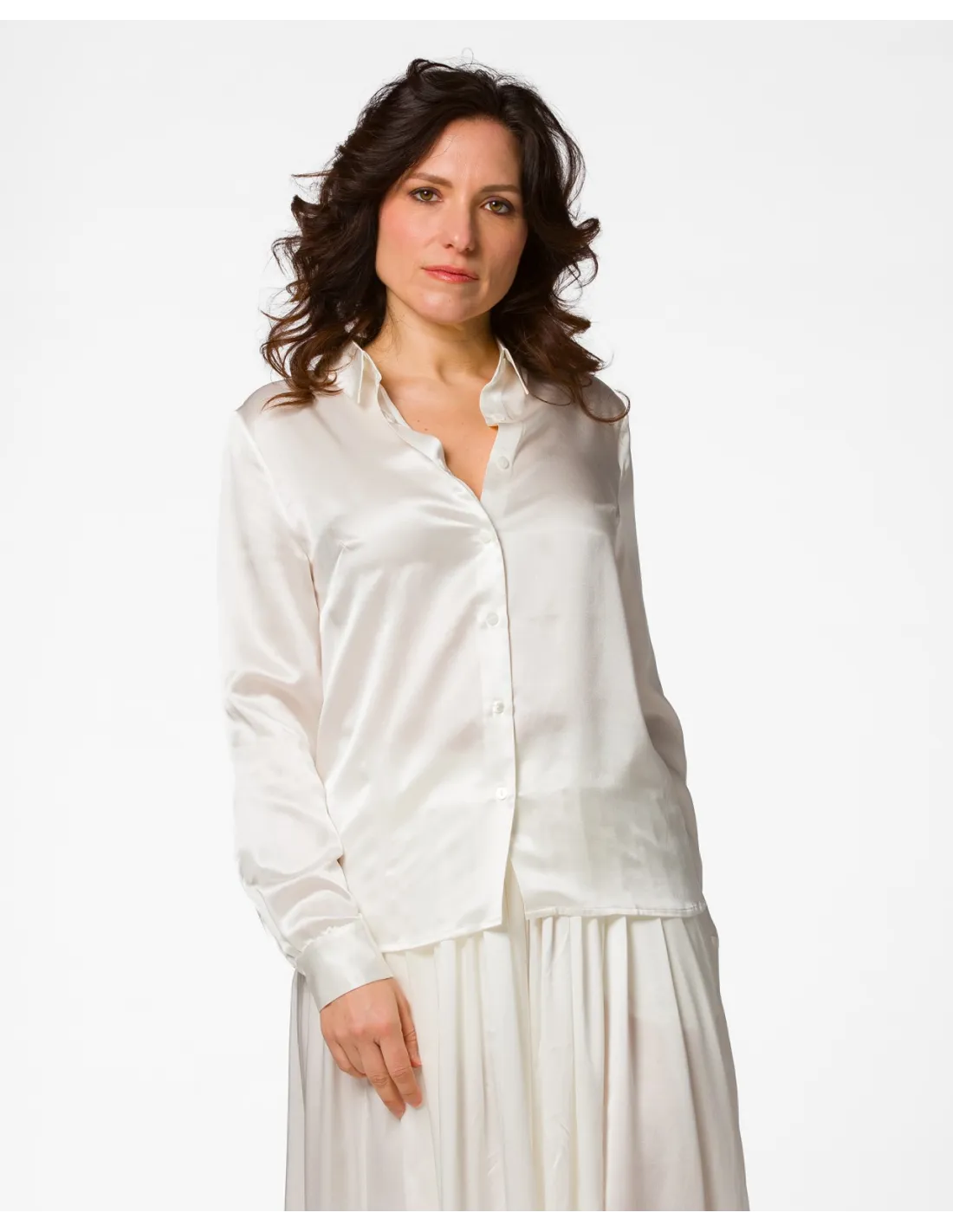 Camicia donna in 100% Seta Biologica certificata GOTS con bottoni in madreperla. Liscia, luminosa e corposa, scivola fluida sul corpo con taglio sartoriale elegante e vestibilità regolare sfiancata. Effetto satin perlato, coprente e non trasparente. Termoregolatrice, traspirante e ipoallergenica, perfetta tutto l’anno.