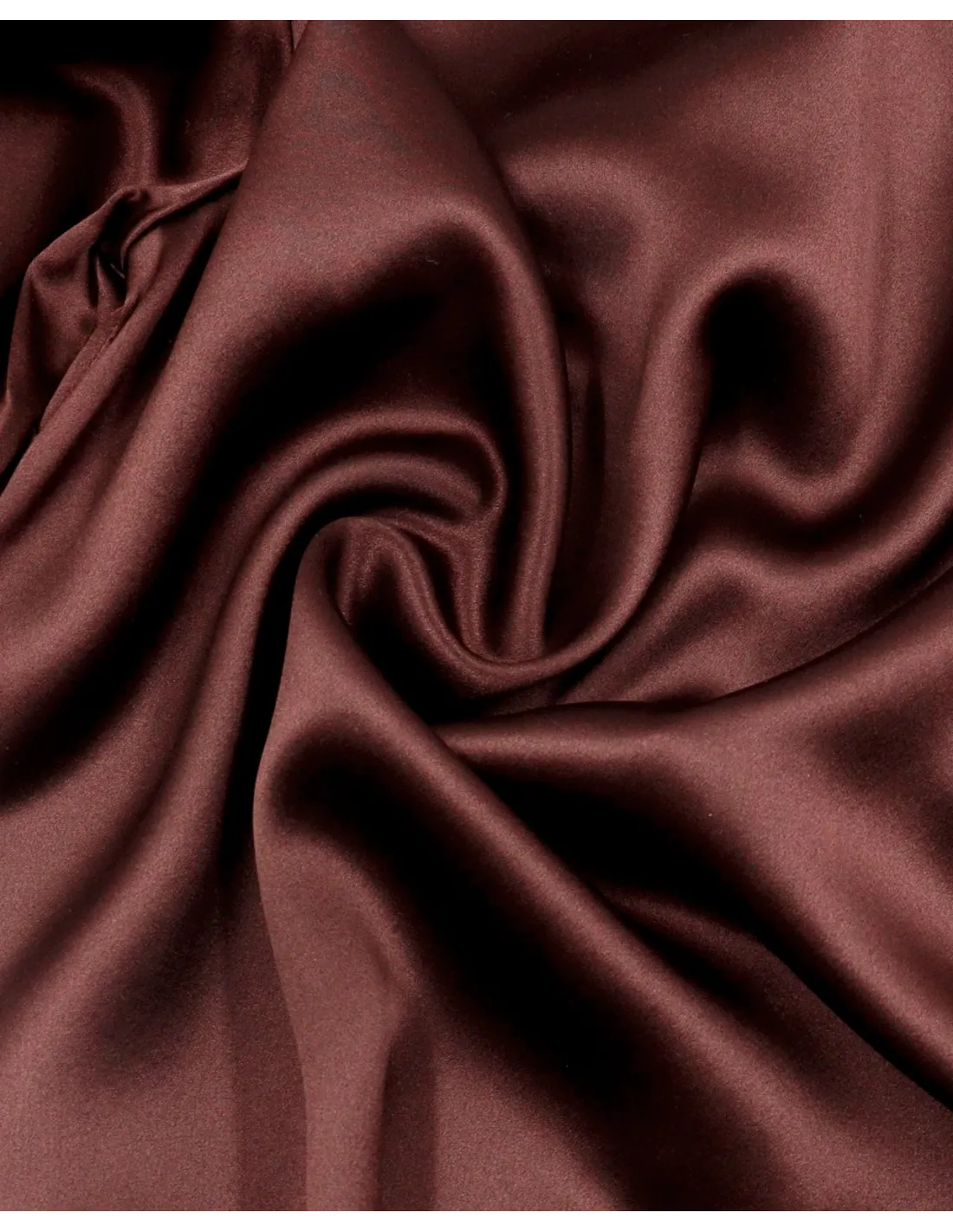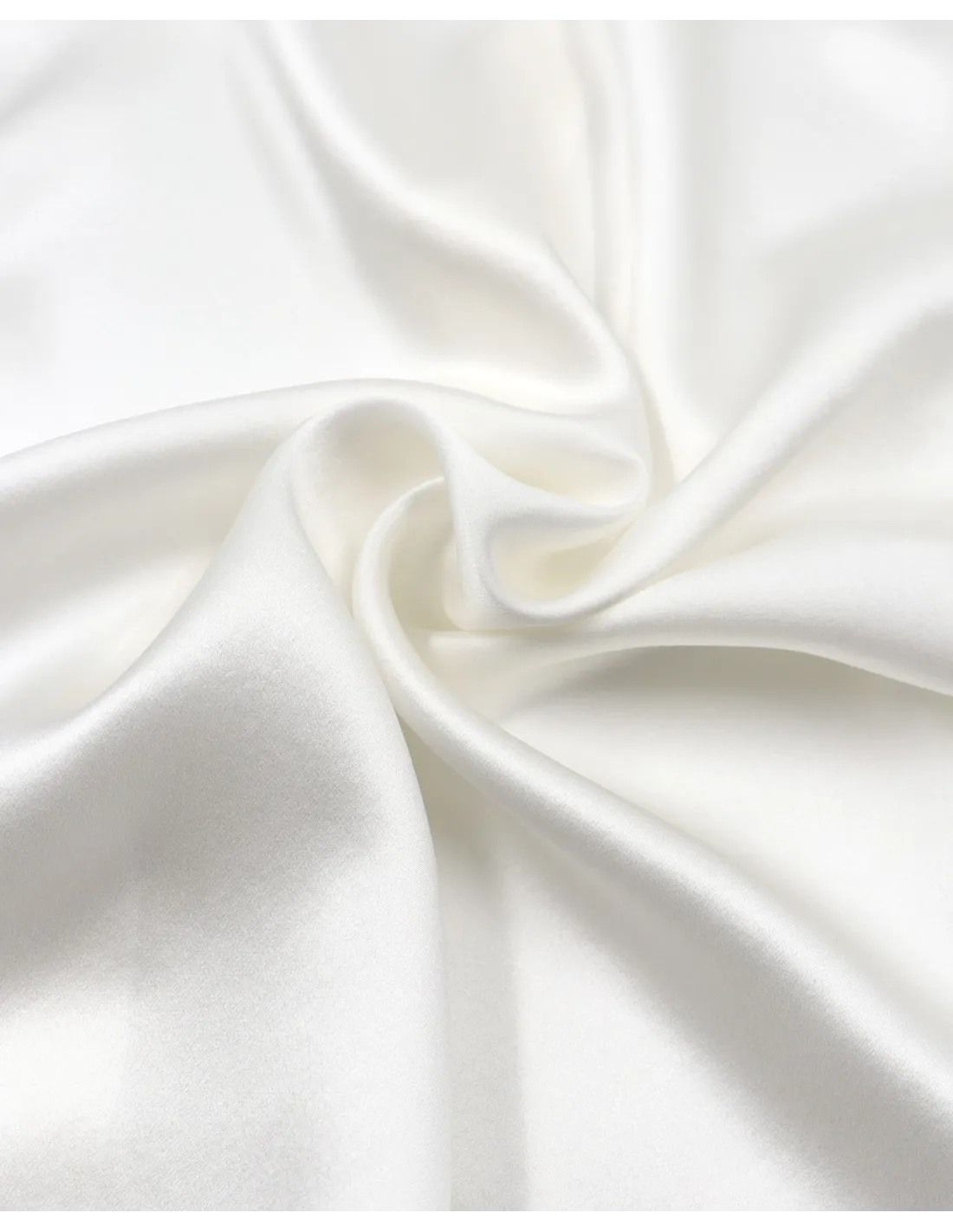 Il tessuto è ad effetto Satin: una particolare tecnica di tessitura che crea una superficie liscia e luminosa, con una lucentezza morbida e perlata su un lato, mentre il rovescio resta opaco e delicato.