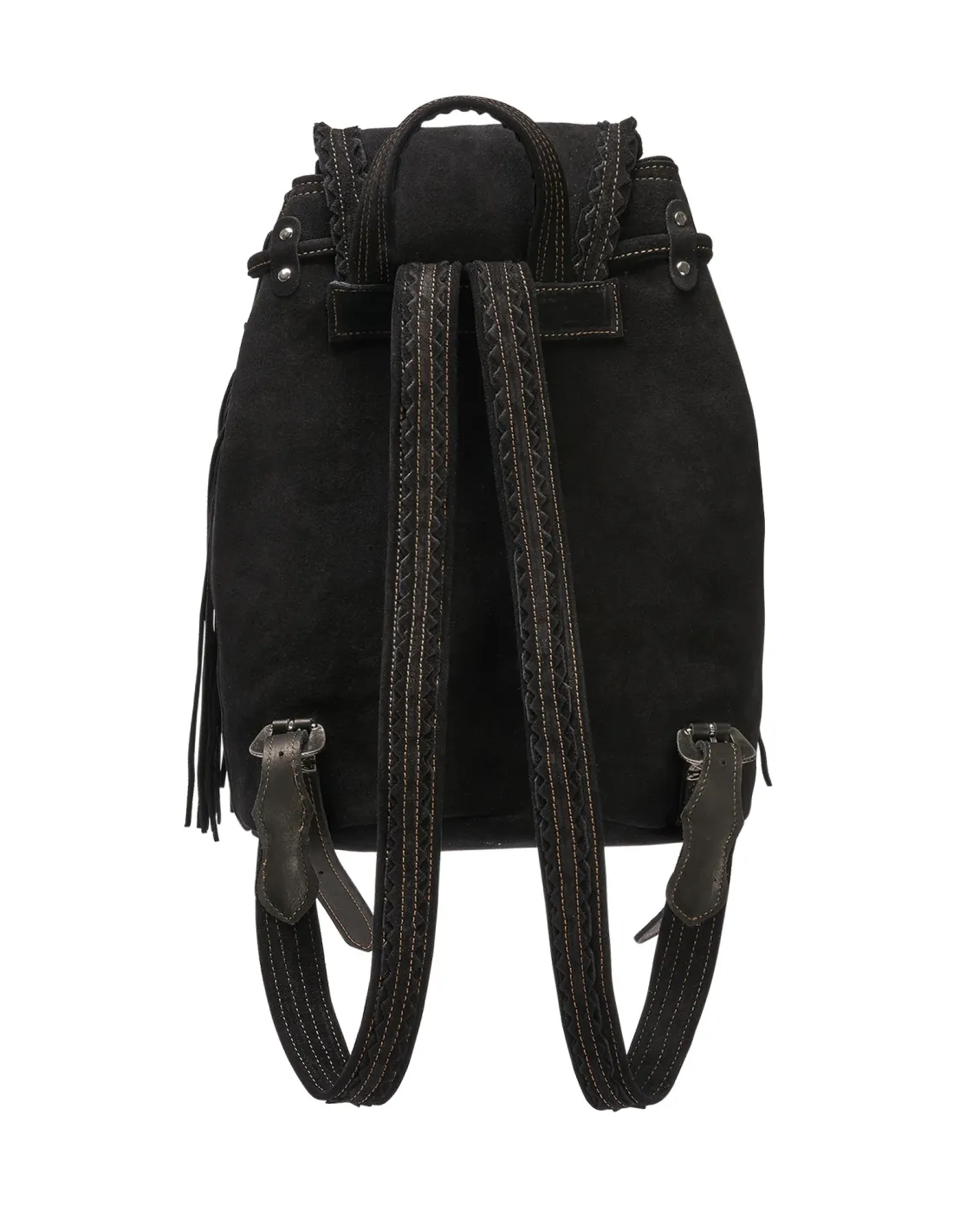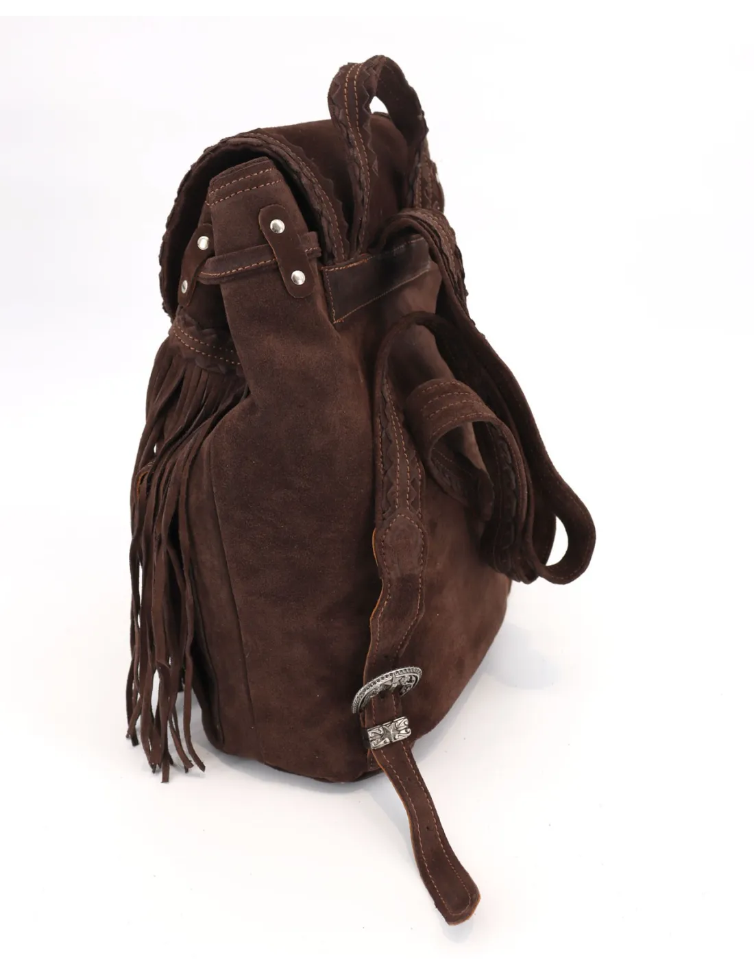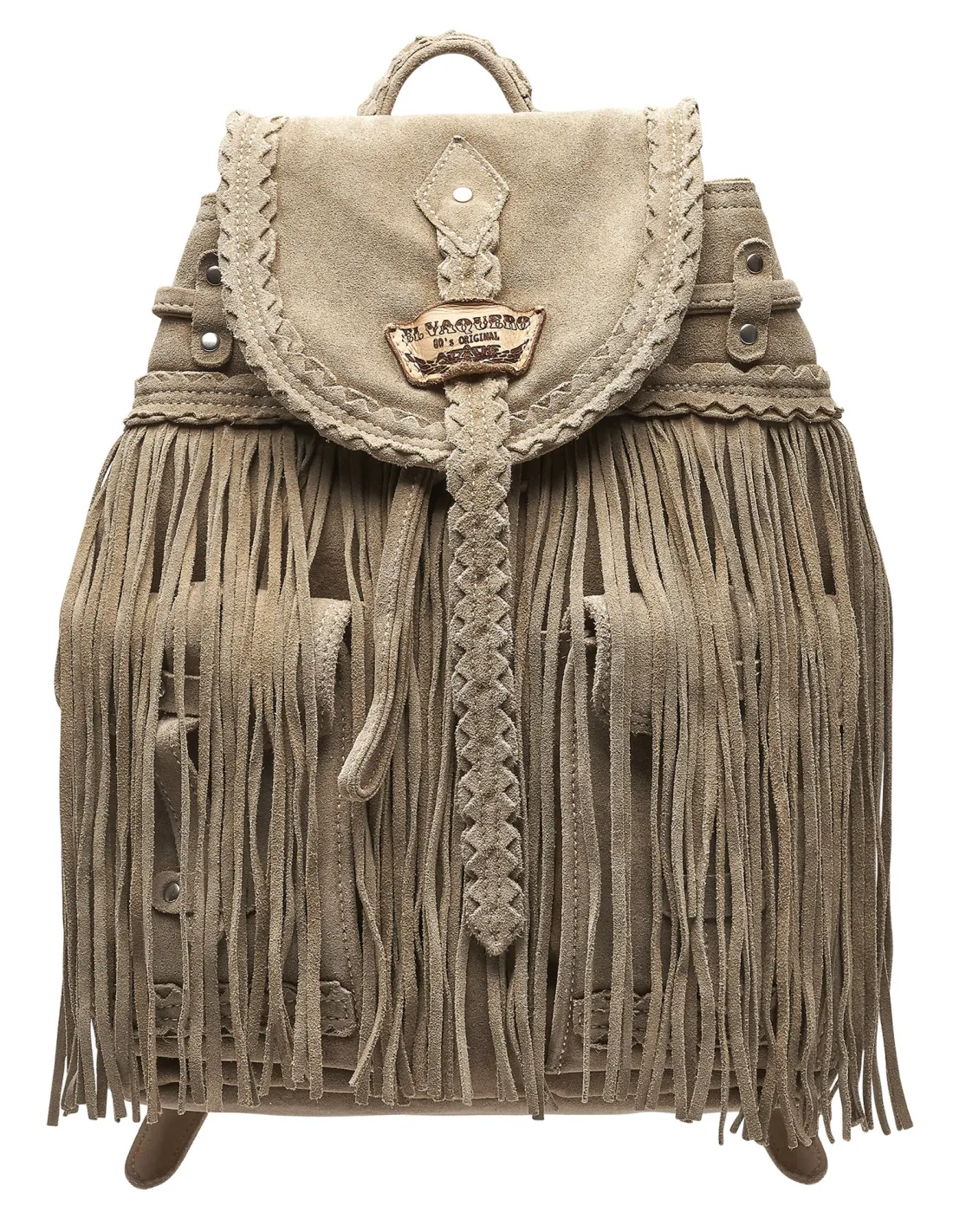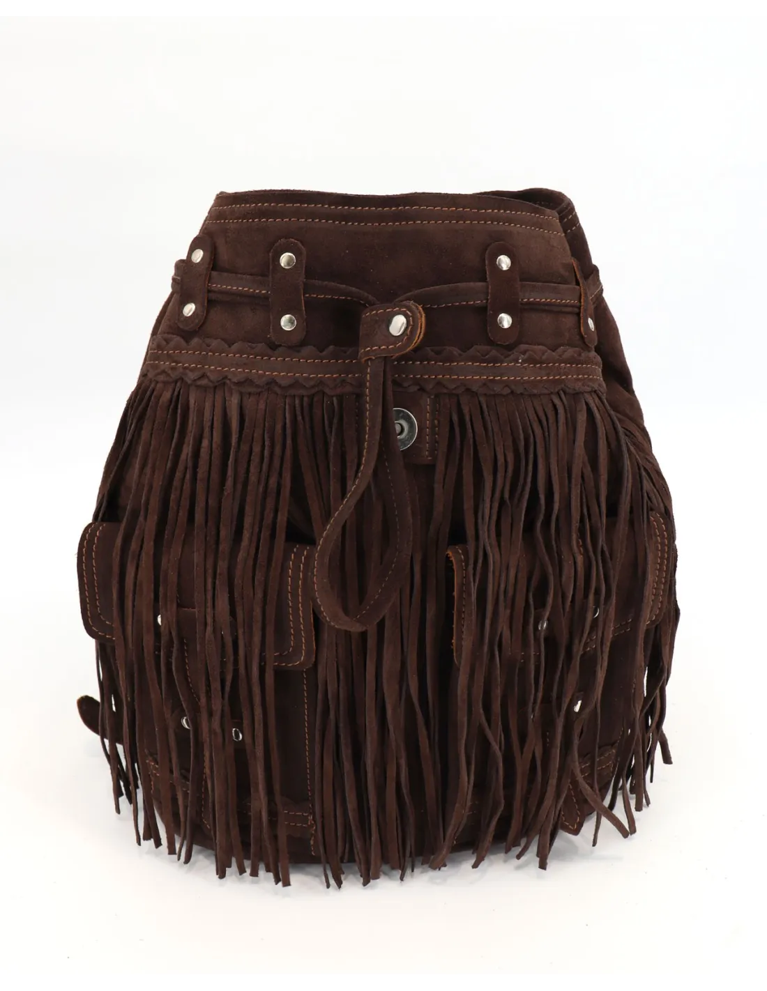 Il suo design è caratterizzato da lunghe frange laterali, tasche frontali e dettagli metallici che donano personalità e un tocco di luce, mentre la chiusura con bottone magnetico garantisce praticità e sicurezza.