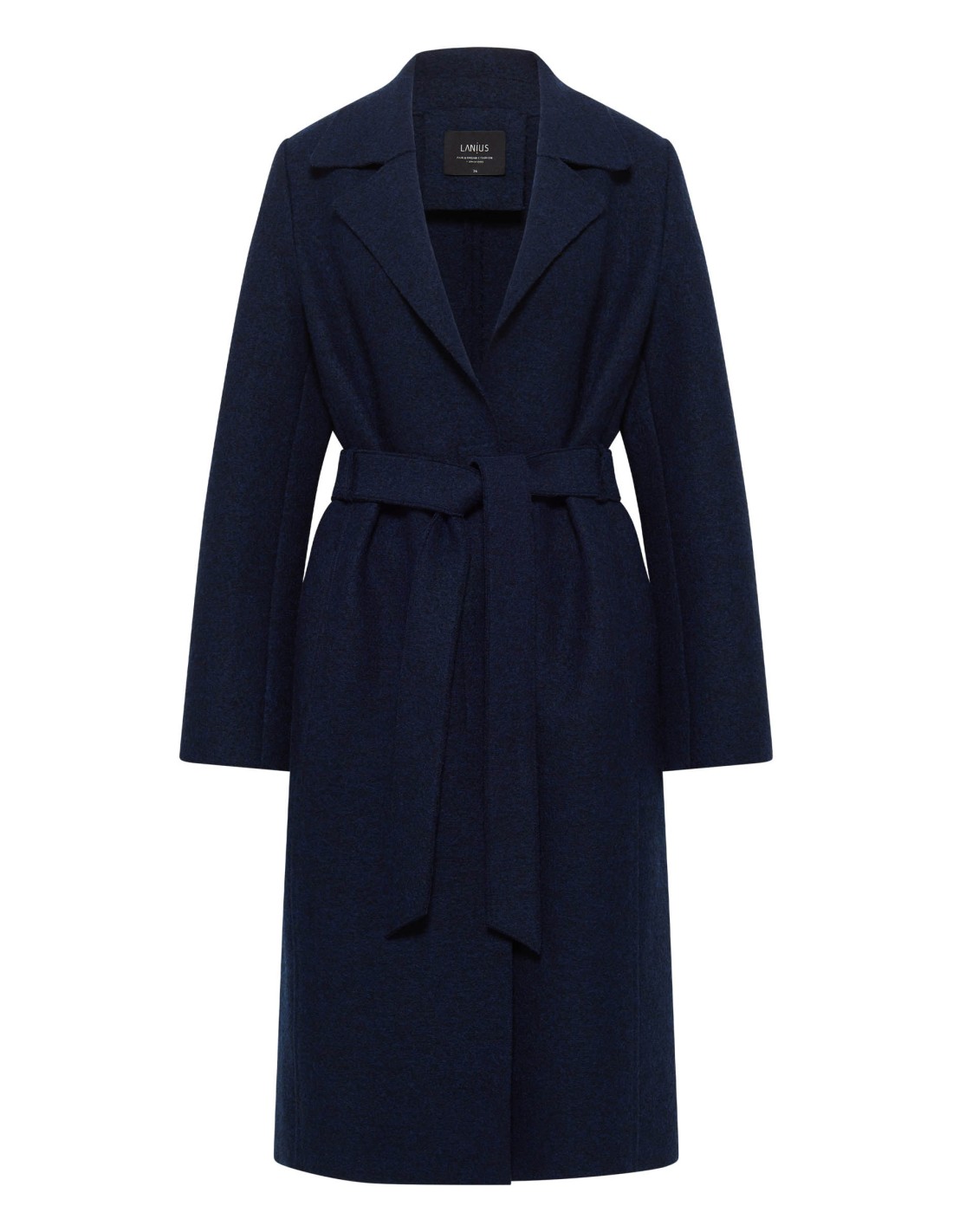 Tasche laterali, collo con revers , chiusura con due bottoni e cinrura.