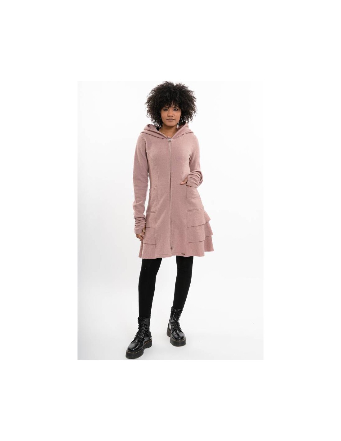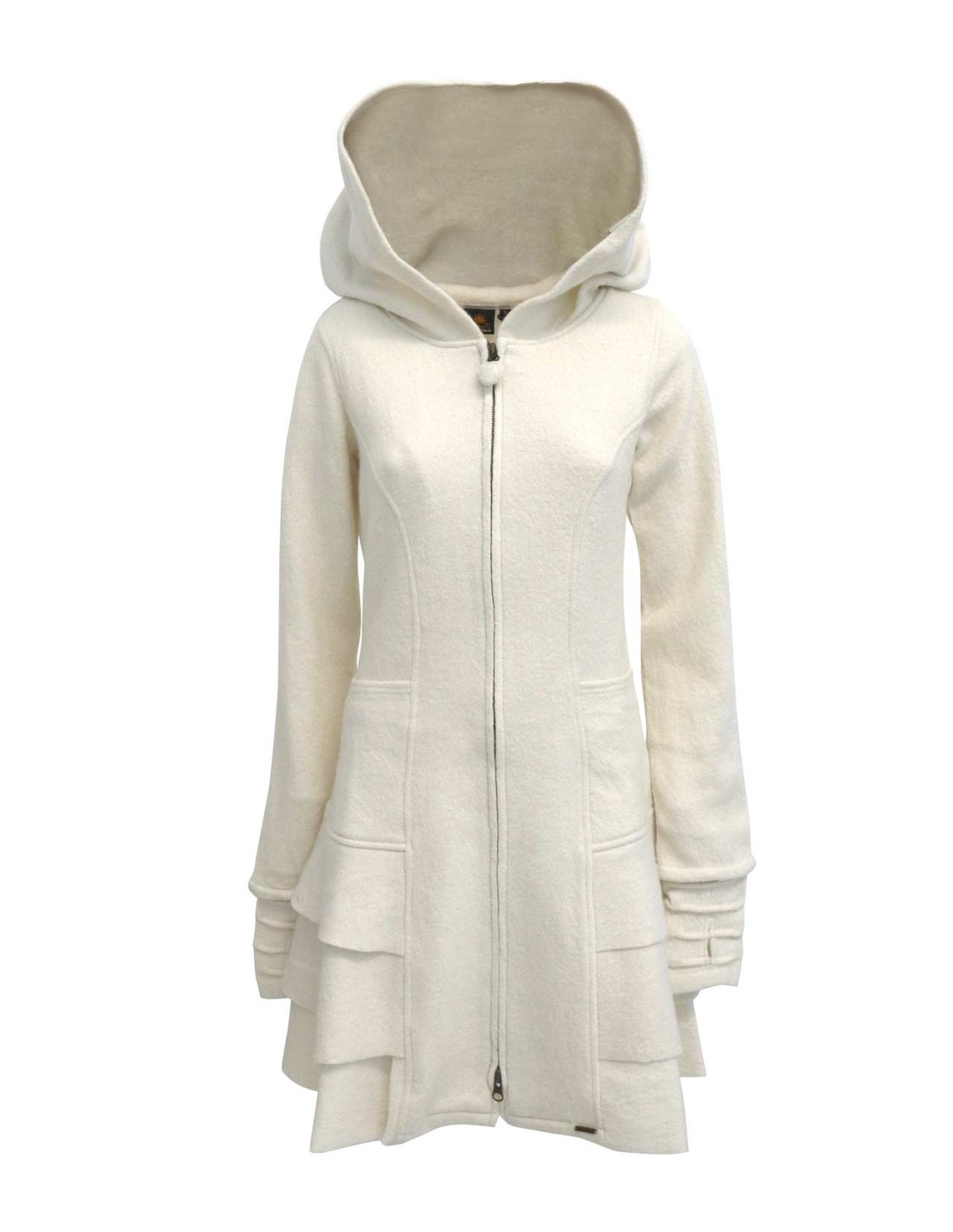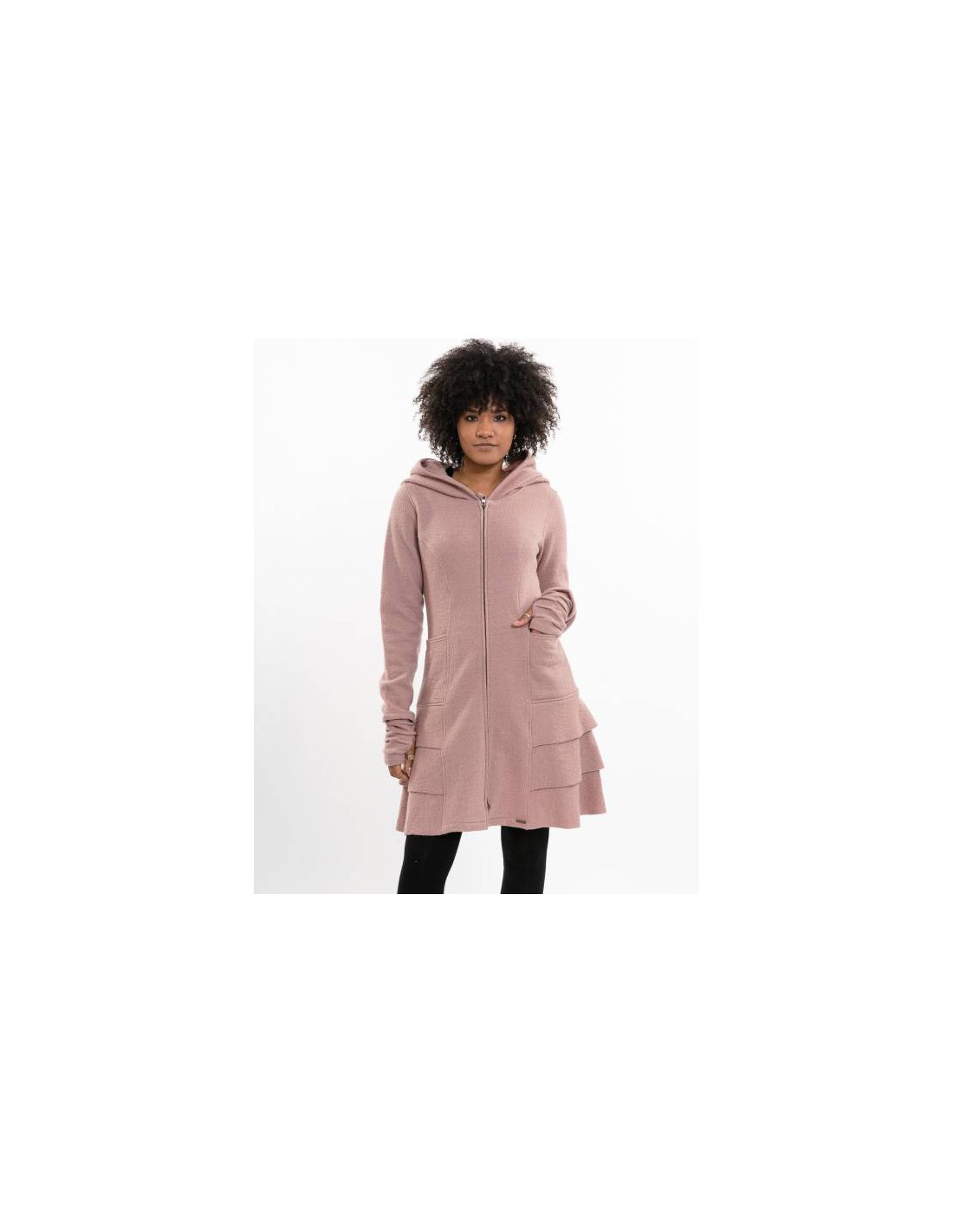 Modello sfiancato in vita con ampio cappuccio, cerniera a 2 vie al centro davanti, tasche frontali, polsini attaccati con foro per il pollice, balze e orlo svasato.