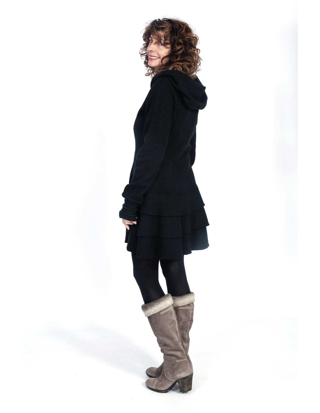 Cappotto Farytale in Lana Cotta non foderato. Modello romantico a trapezio, aderente con ampio cappuccio, polsini sulle maniche e chiusura con zip. Un capo caldo, elegante e sfizioso dallo stile fiabesco.