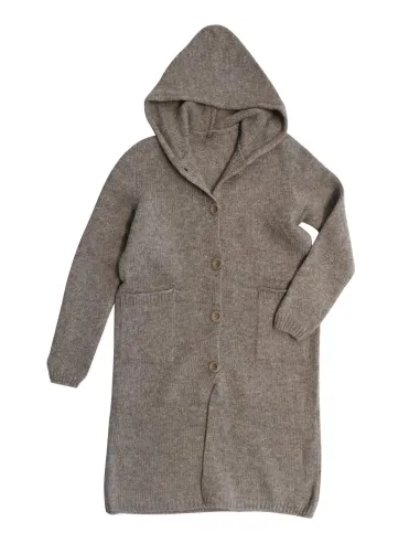 Caldo e bellissimo cappotto realizzato interamente in maglia di 100% Lana Vergine Islandese con bottoni e cappuccio.