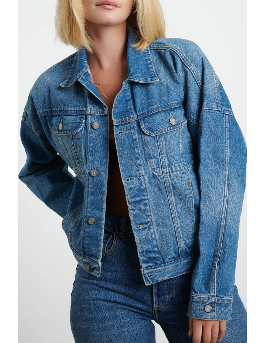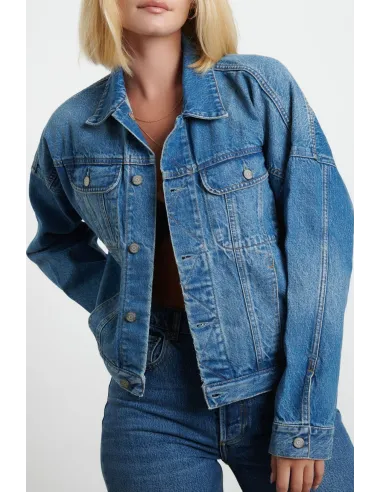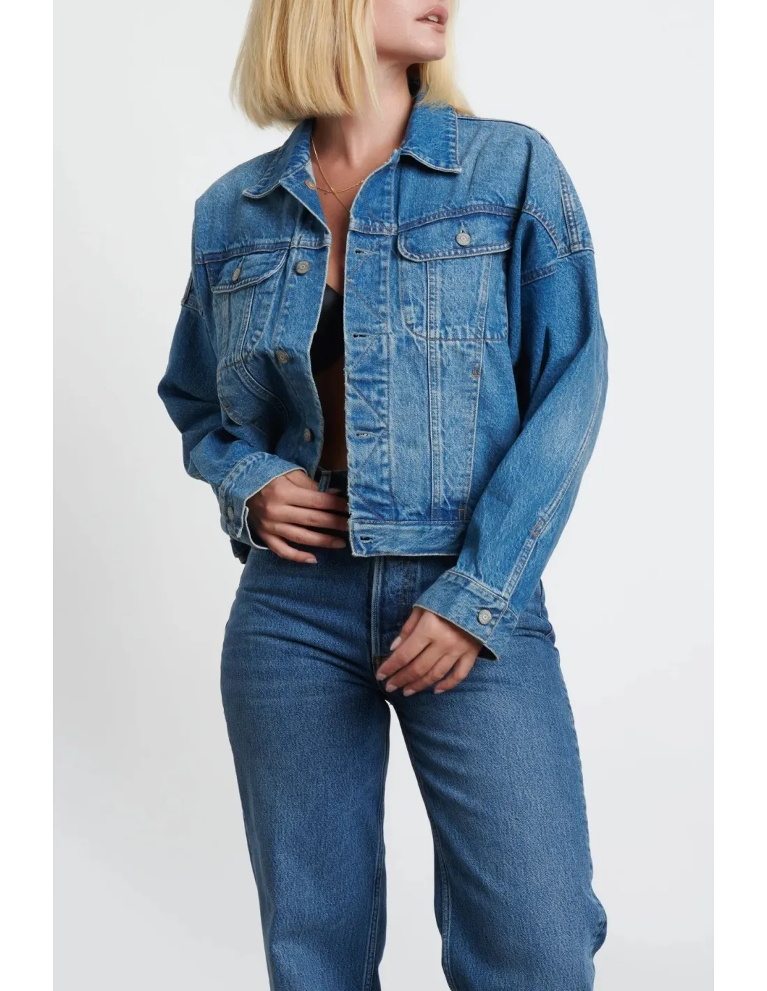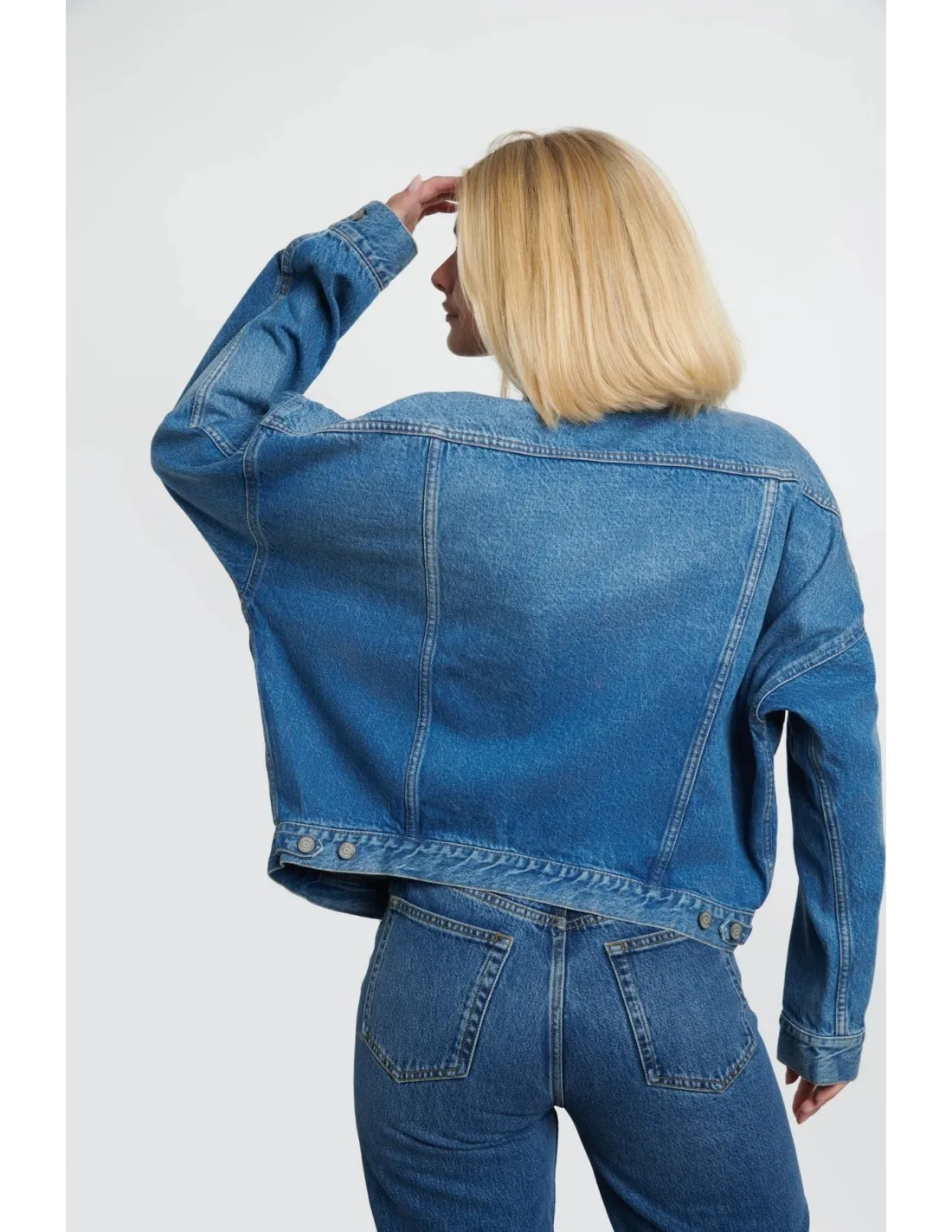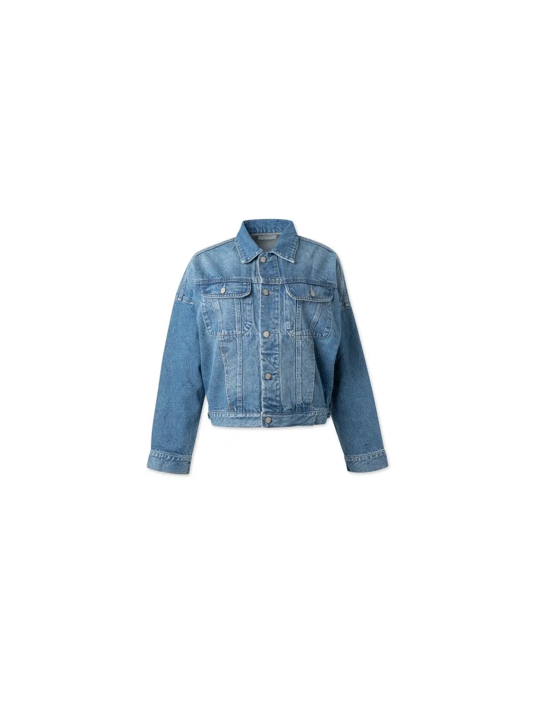 Giacca in denim sostenibile di ispirazione anni '90 realizzata a bassissimo impatto ambientale con cotone riciclato certificato GRS e Lyocell.