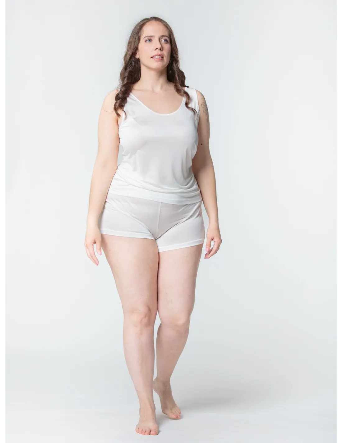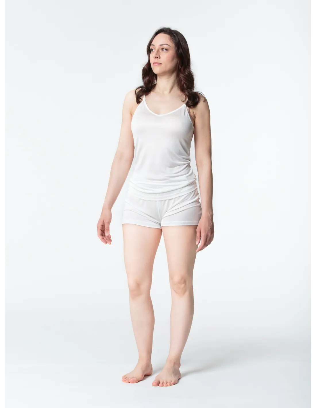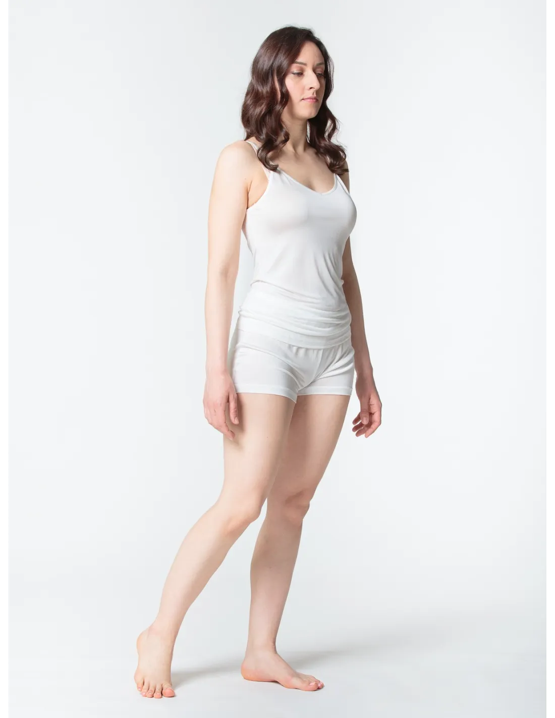 Leggerissimi Shorts donna in 100% Seta Biologica ideali in estate ideale per dormire la notte. Lenitivi e anti-sudore anche in caso di dermatiti, pruriti e arrossamenti alla pelle, abbinati alla canotta in seta creano il perfetto pigiama estivo, il più fresco in assoluto.