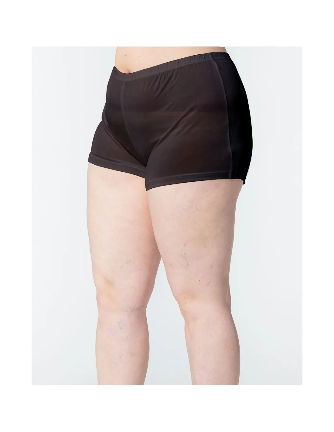 Modello corto con gamba ampia e morbido elastico in vita. Il tessuto è sottile, naturalmente elastico grazie alla lavorazione a Jersey (non contiene elastan) e ovviamente un pò trasparente. grammatura: 92g/mq.