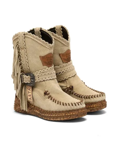 Stivale artigianale basso con zeppa interna, in morbida pelle scamosciata di vitello con frange laterali e finitura vintage. Realizzato a mano in Italia, dallo stile western e spirito libero. Autentico, comodo e senza tempo: uno stivale che racconta libertà, stile e qualità destinata a durare.