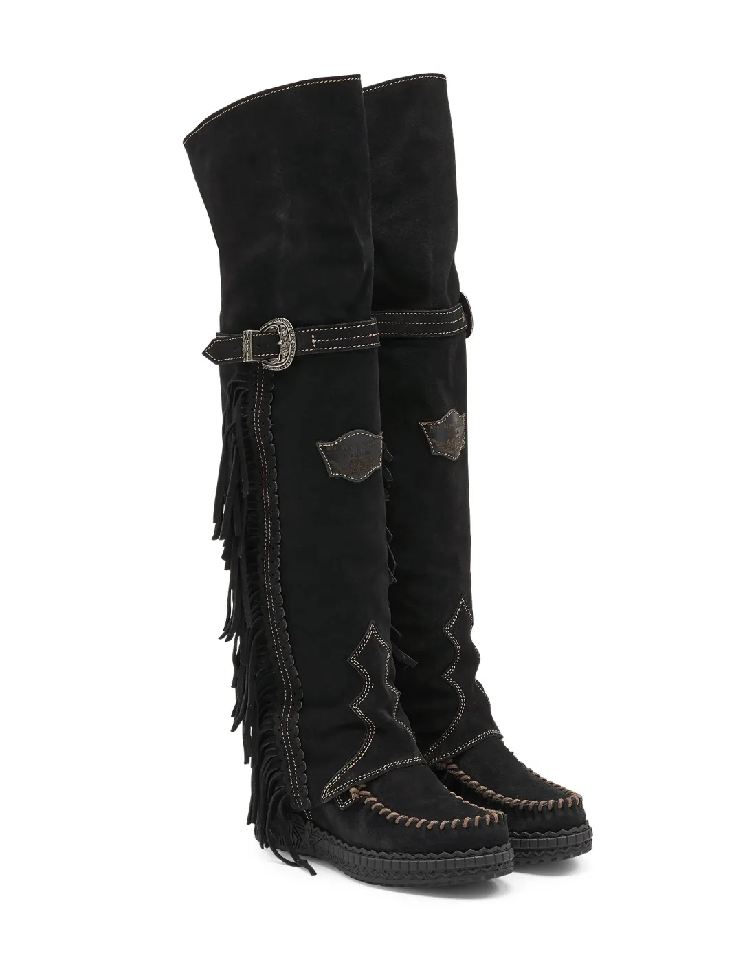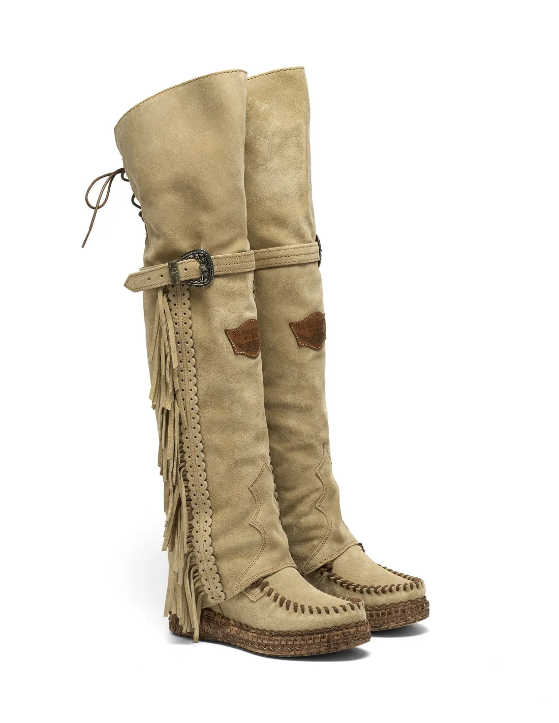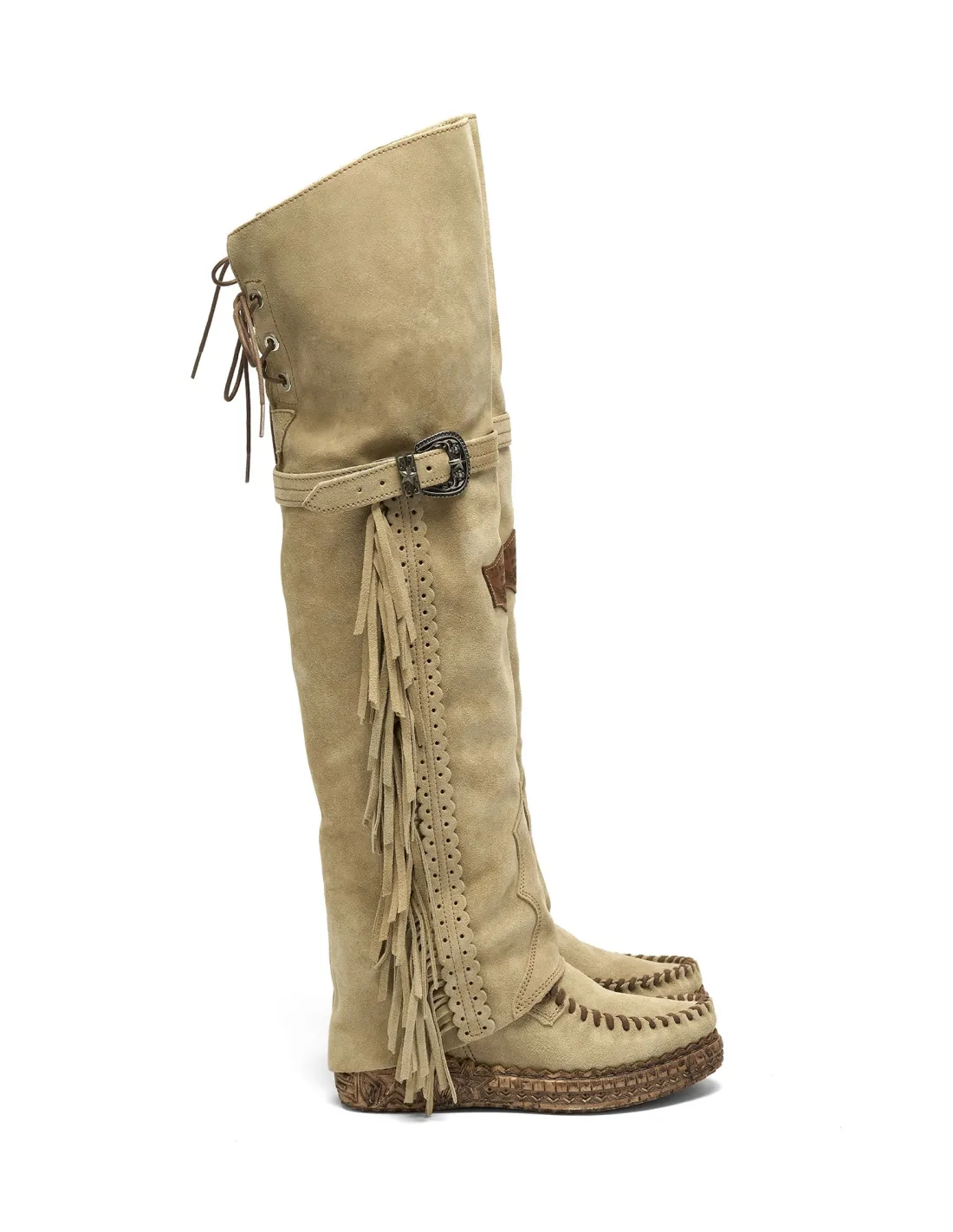 Stivale artigianale con doppio gambale alto sopra il ginocchio e zeppa interna, in morbida pelle scamosciata di vitello con frange laterali e allacciatura sul retro. Realizzato a mano in Italia, dallo stile western e spirito libero. Autentico, femminile e senza tempo: uno stivale che racconta libertà, stile e qualità destinata a durare.