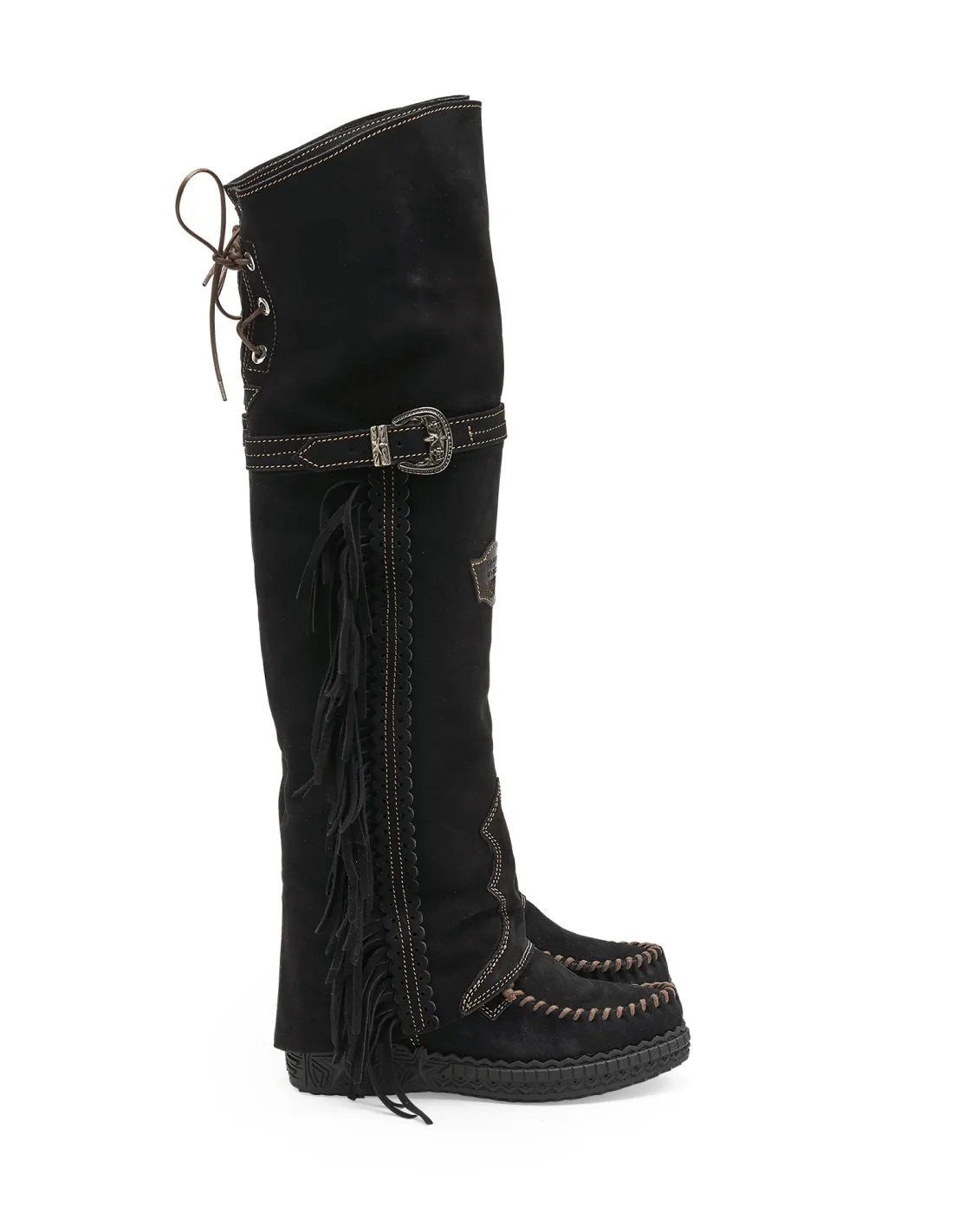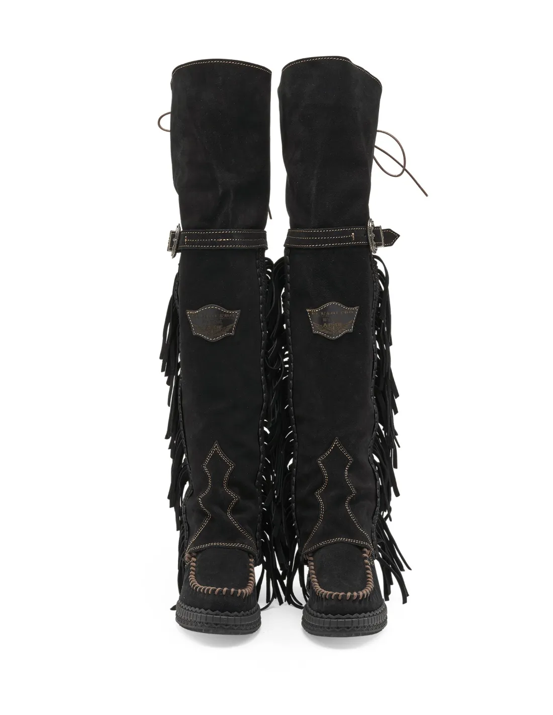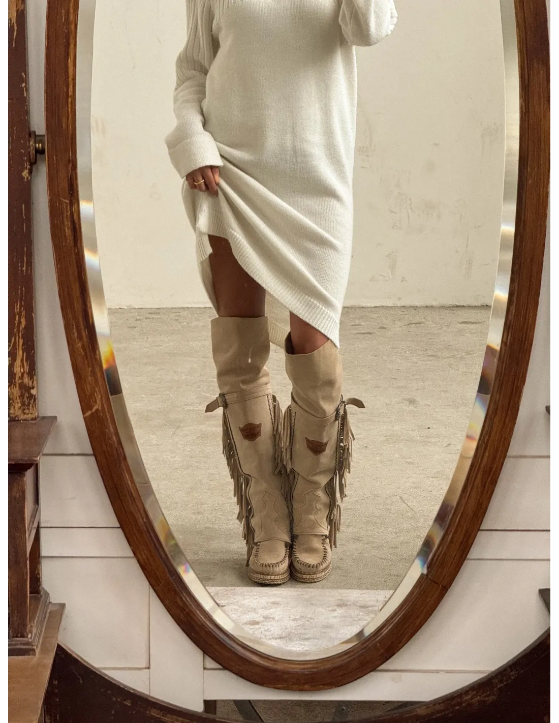 Stivale artigianale con doppio gambale alto sopra il ginocchio e zeppa interna, in morbida pelle scamosciata di vitello con frange laterali e allacciatura sul retro. Realizzato a mano in Italia, dallo stile western e spirito libero. Autentico, femminile e senza tempo: uno stivale che racconta libertà, stile e qualità destinata a durare.