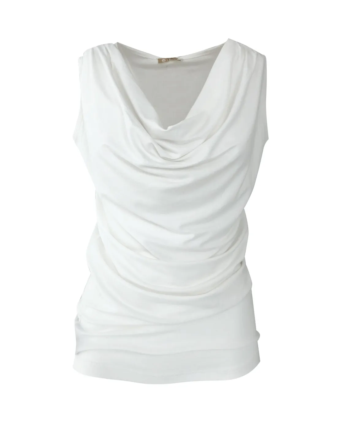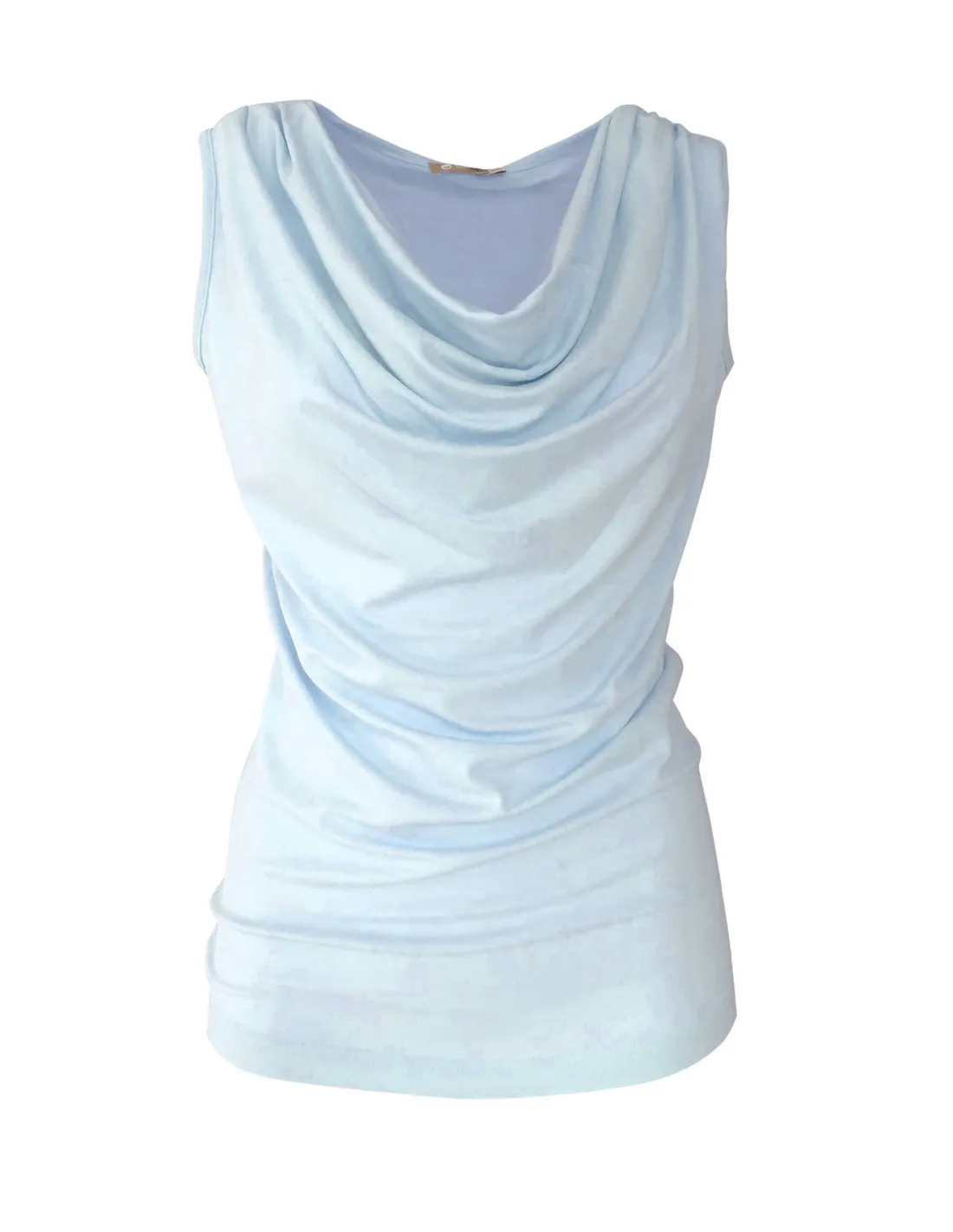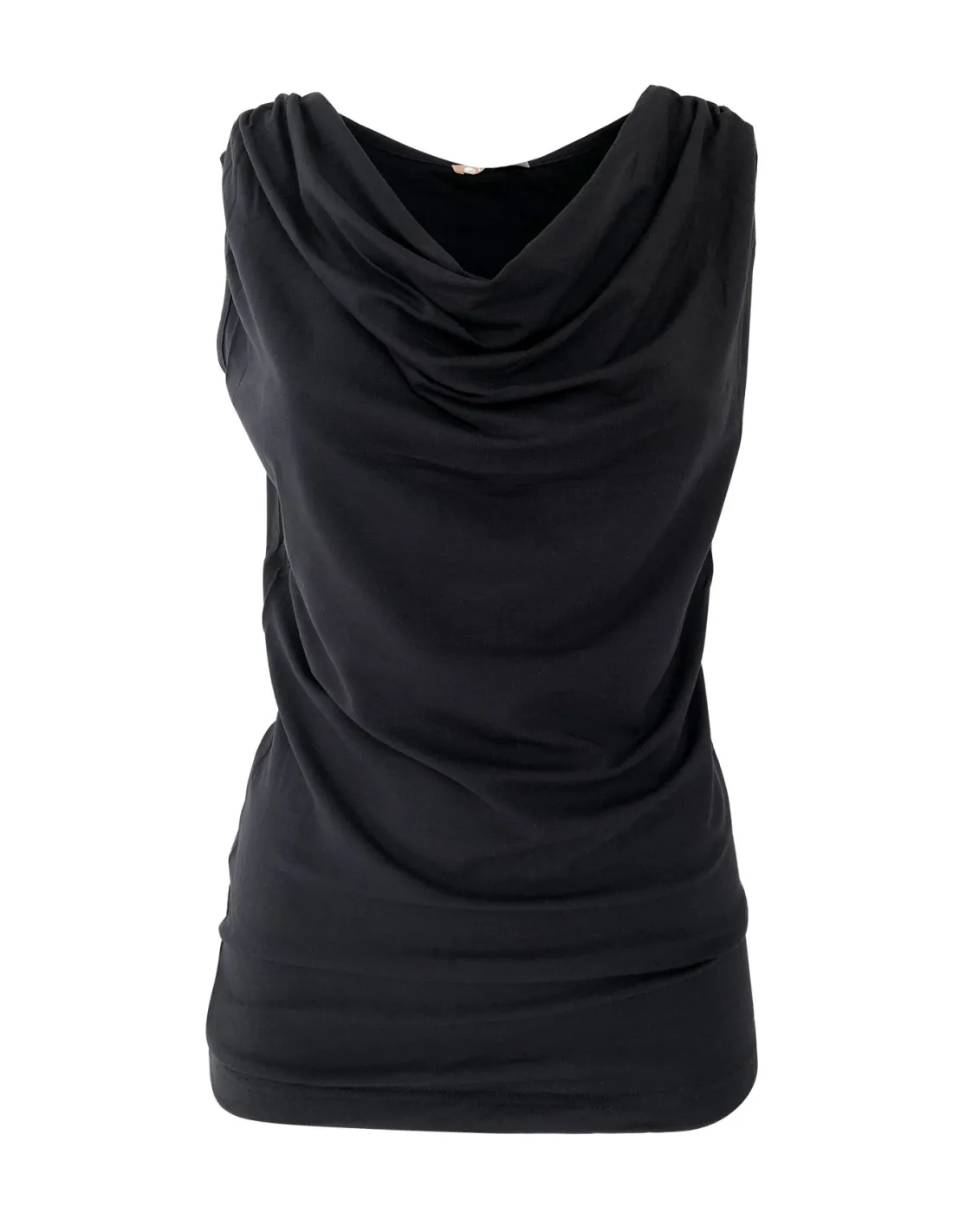 Femminile e comodissimo top smanicato in 95% Bambù con scollo a cascata drappeggiato