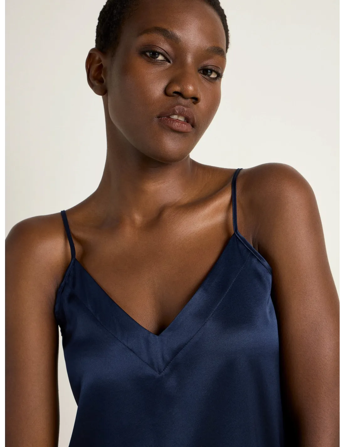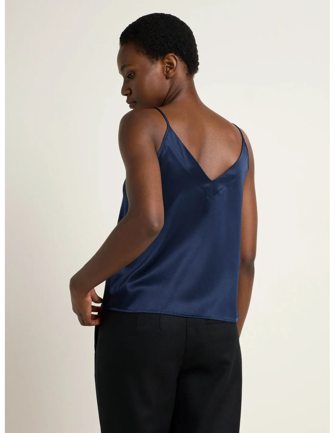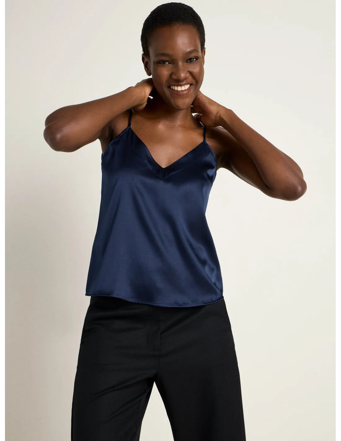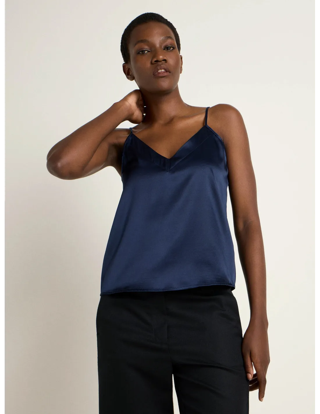 Bellissimo ed elegante top con spalline sottili realizzato in fluida e lucente seta Satin. Ideale come sottogiacca in Autinno e inverno.