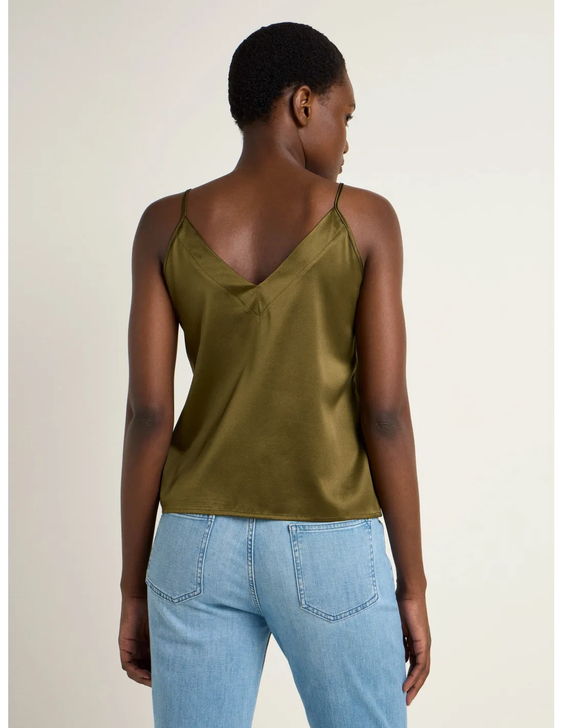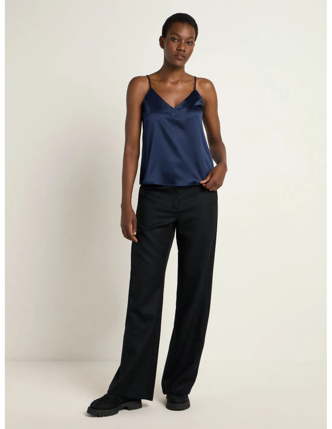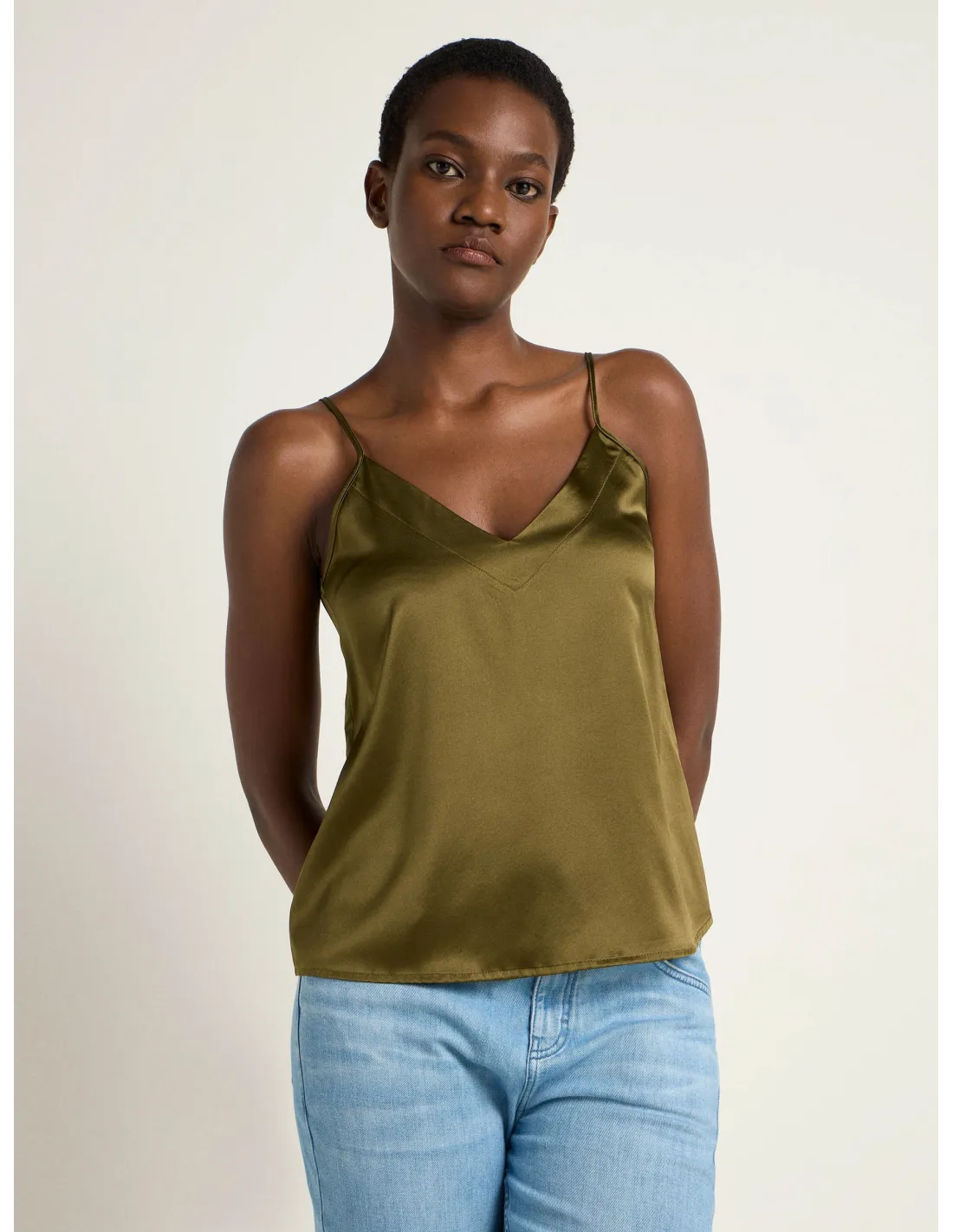 Bellissimo ed elegante top con spalline sottili realizzato in fluida e lucente seta Satin. Ideale come sottogiacca in Autinno e inverno.