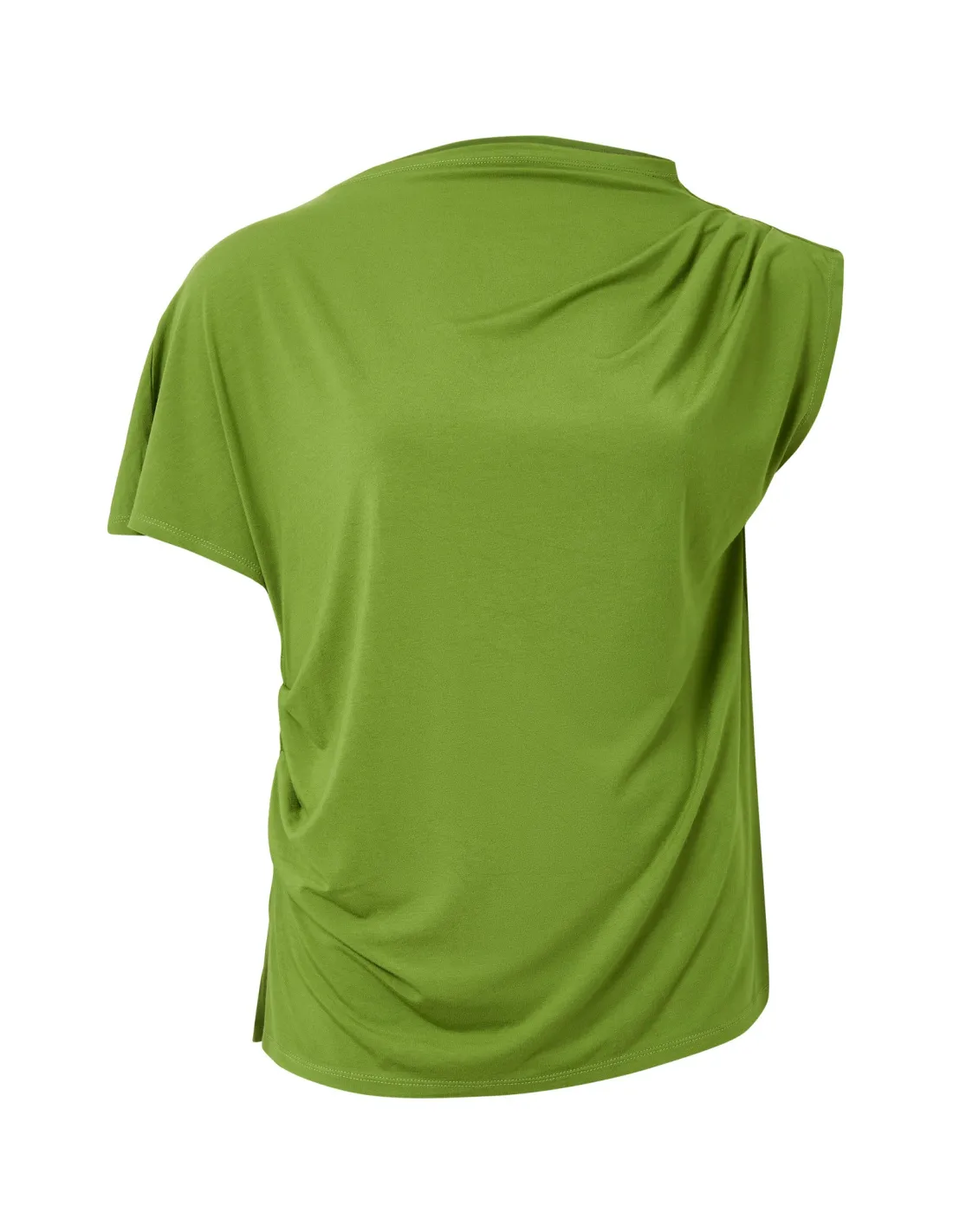 Fluido e morbidissimo Top con drappeggio realizzato in Modal dal legno di faggio con maniche corte asimmetriche. Comodo e sottile, il tessuto è fresco, morbido ed elasticizzato. Maternity fluid, molto versatile, si presta a stili sportivi ed eleganti.
