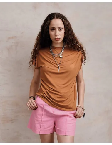 Fluido e morbidissimo Top con drappeggio realizzato in Modal dal legno di faggio con maniche corte asimmetriche. Comodo e sottile, il tessuto è fresco, morbido ed elasticizzato. Maternity fluid, molto versatile, si presta a stili sportivi ed eleganti.