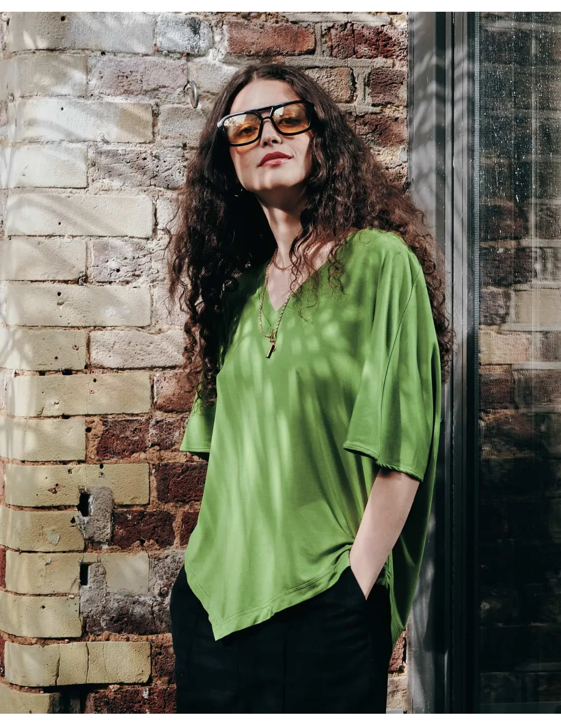 Il tessuto è Modal dal legno di faggio, naturalissimo e traspirante. Al tatto è molto liscio, morbido, sottile ma molto coprente. Si adatta perfettamente ad ogni fisicità grazie alla grande elasticità, scegli la taglia che indossi abitualmente.