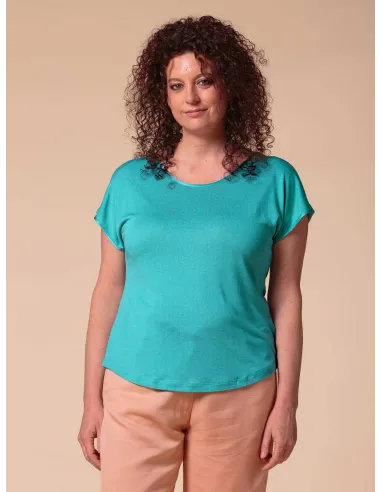 Semplicissima e raffinata questa T-shirt a maniche corte realizzata in un incredibile mix di pura Seta, Lino ed Ecoviscosa.