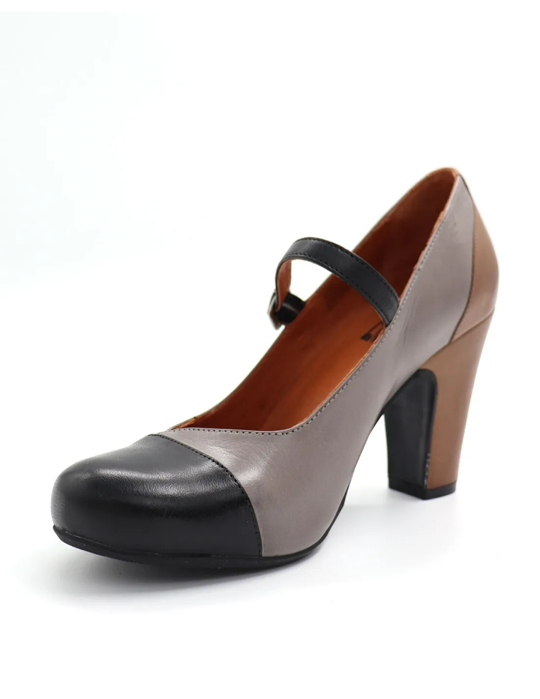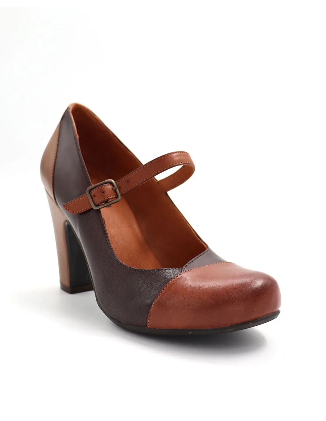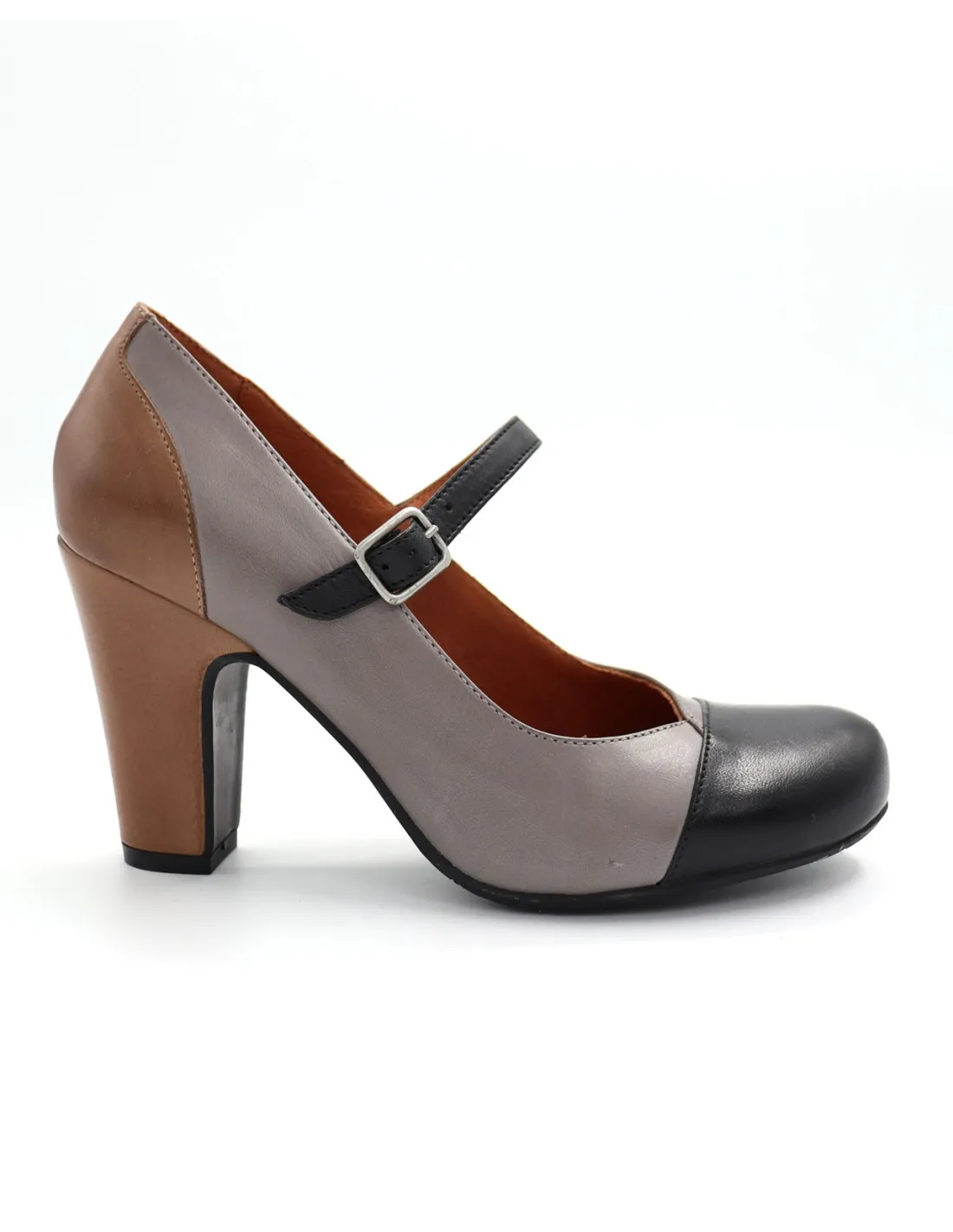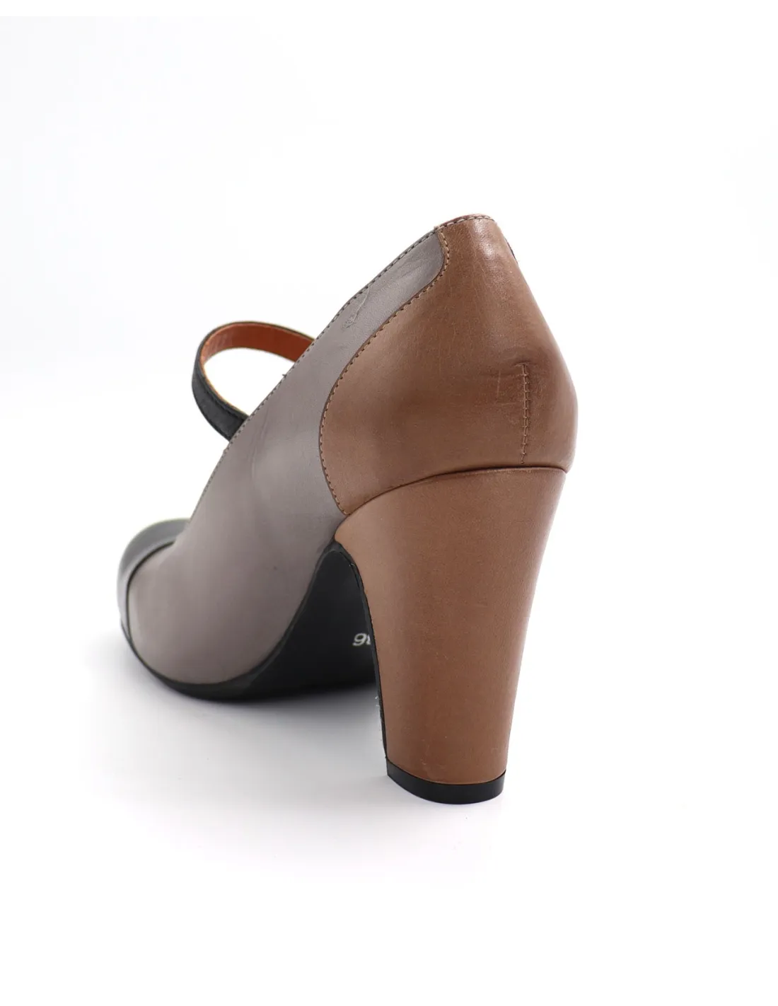 Bellissima scarpetta decoltè con punta stondata di ispirazione vintage. Dettagli bicolor nelle colorazioni Tortora e Marrone.