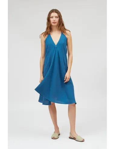 Il tessuto è leggerissima Ecoviscosa unita al Lino, traspirante e naturale, perfetto per l'estate. Lo stile casual e leggermente stropicciato del Lino dona carattere e brio a quest'abito, da indossare anche a piedi nudi sulla sabbia.